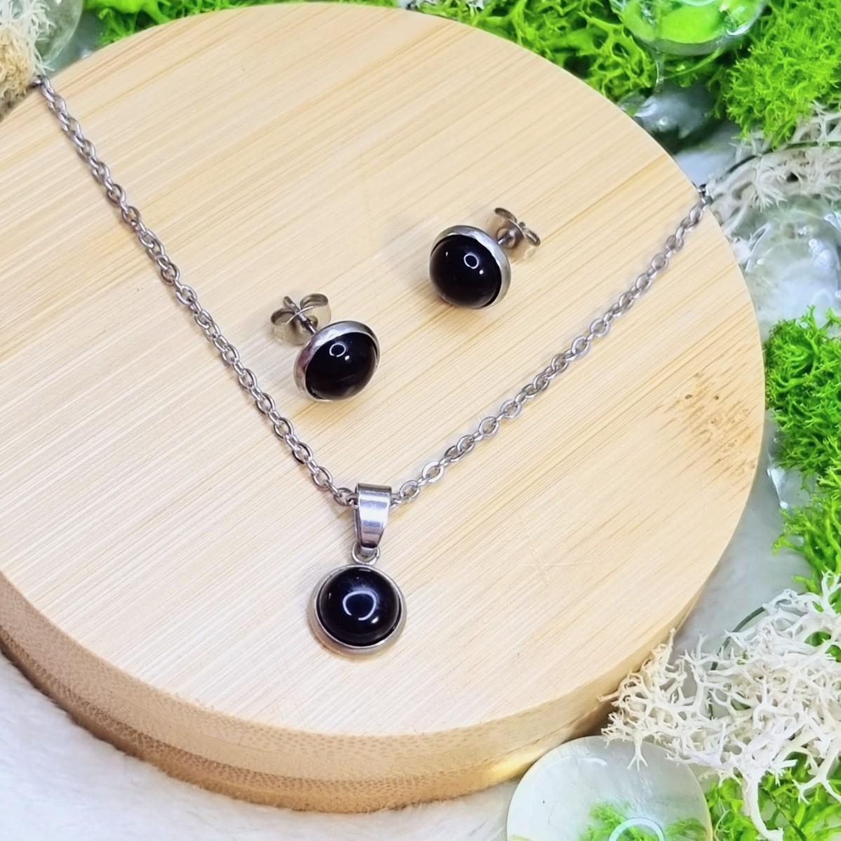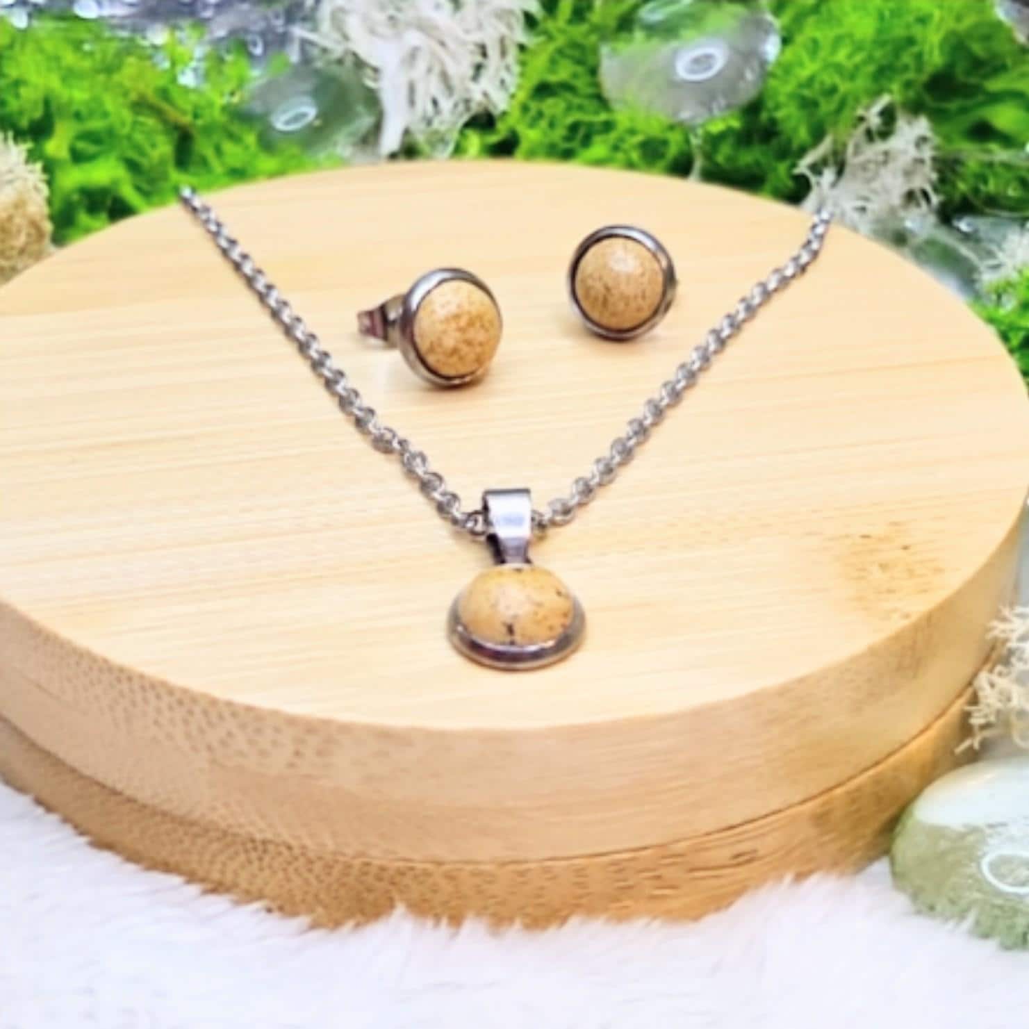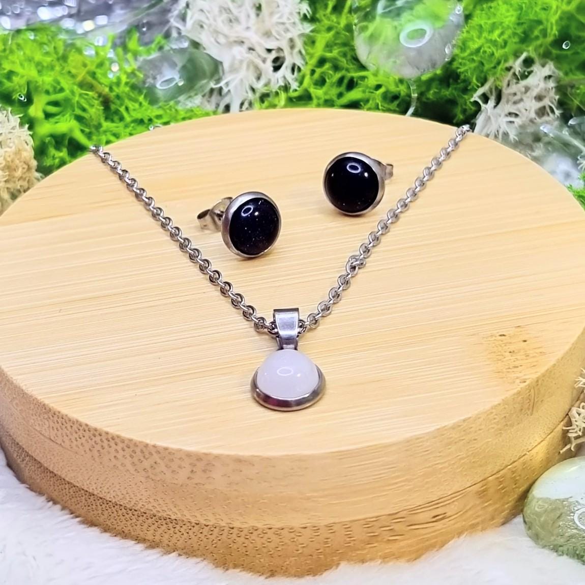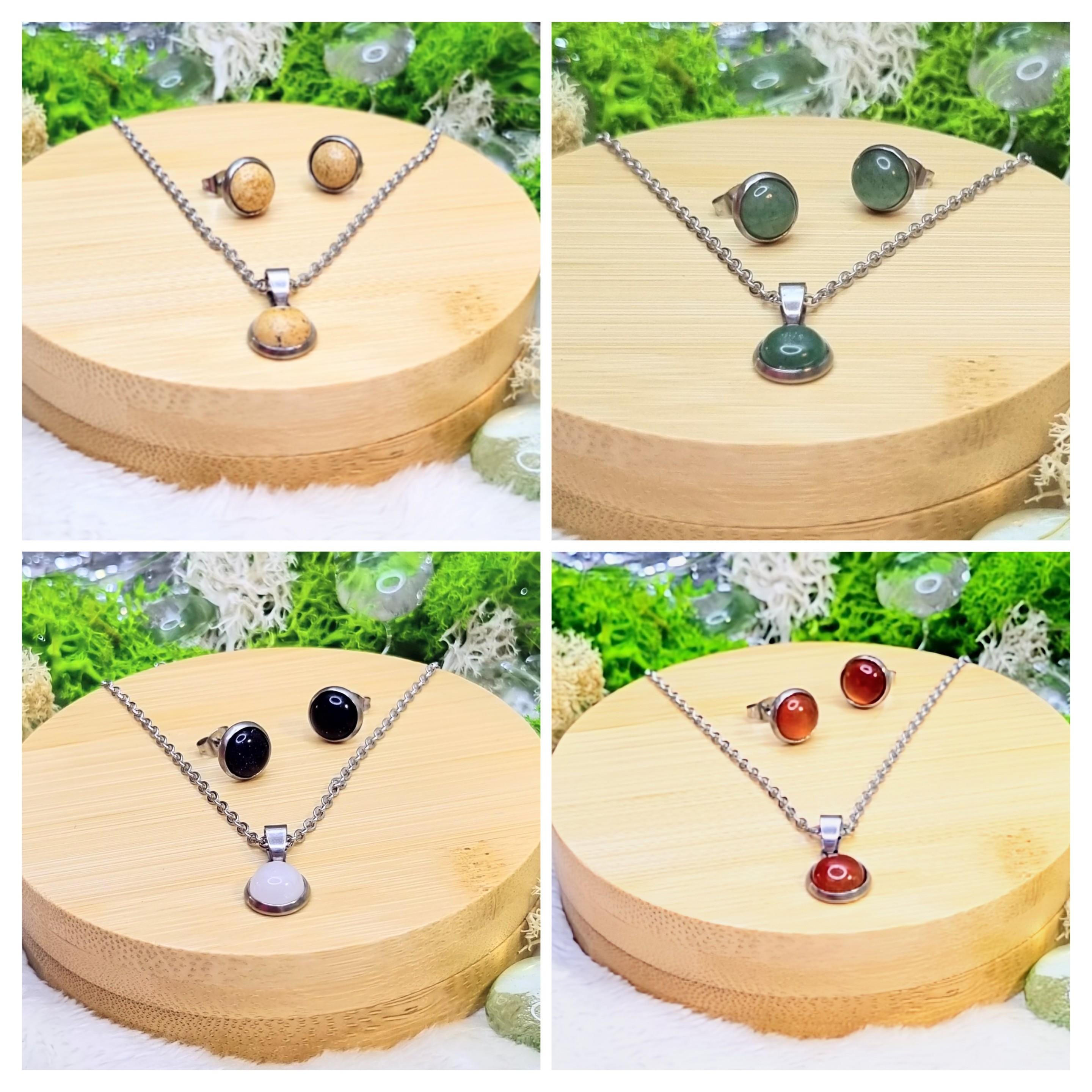 A jewelry set full of clarity and gentle elegance: Each necklace and pair of earrings is made of high-quality 304 stainless steel – durable, colorfast, and comfortable against the skin. Hand-crafted cabochons of natural stone or high-gloss glass (8 mm) are set in the settings, each featuring unique color variations, delicate patterns, or natural grains, depending on the design.