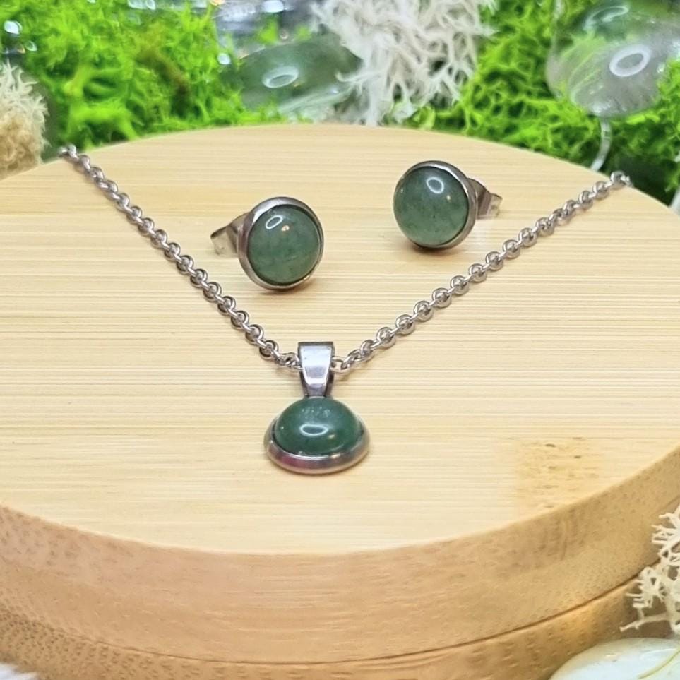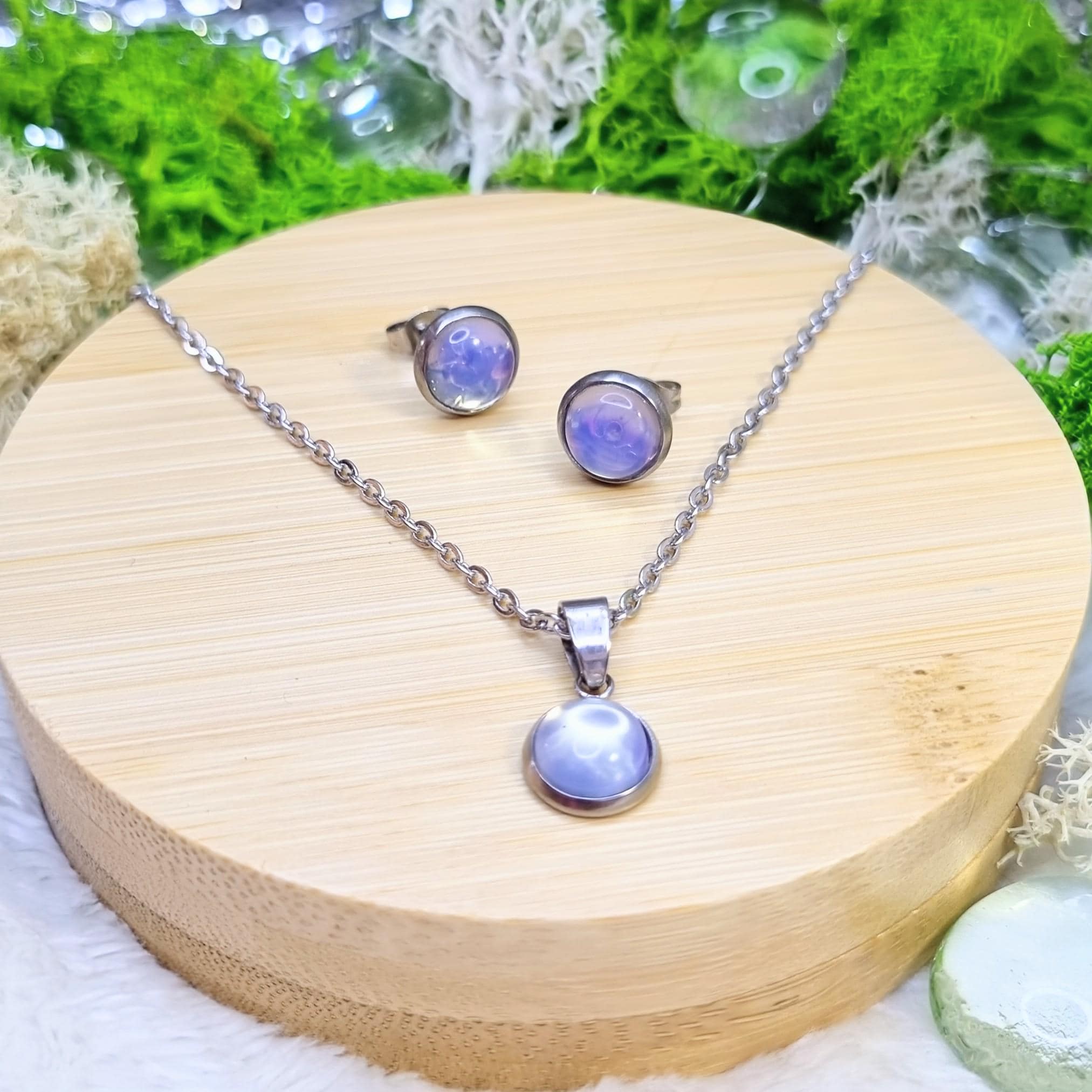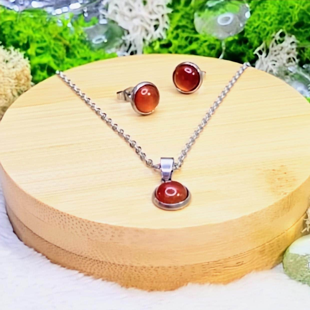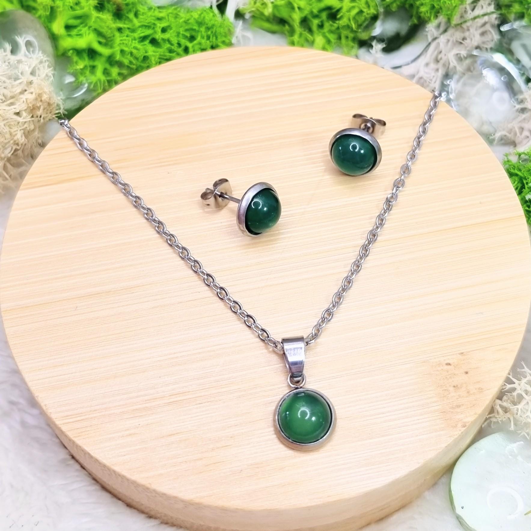 A jewelry set full of clarity and gentle elegance: Each necklace and pair of earrings is made of high-quality 304 stainless steel – durable, colorfast, and comfortable against the skin. Hand-crafted cabochons of natural stone or high-gloss glass (8 mm) are set in the settings, each featuring unique color variations, delicate patterns, or natural grains, depending on the design.