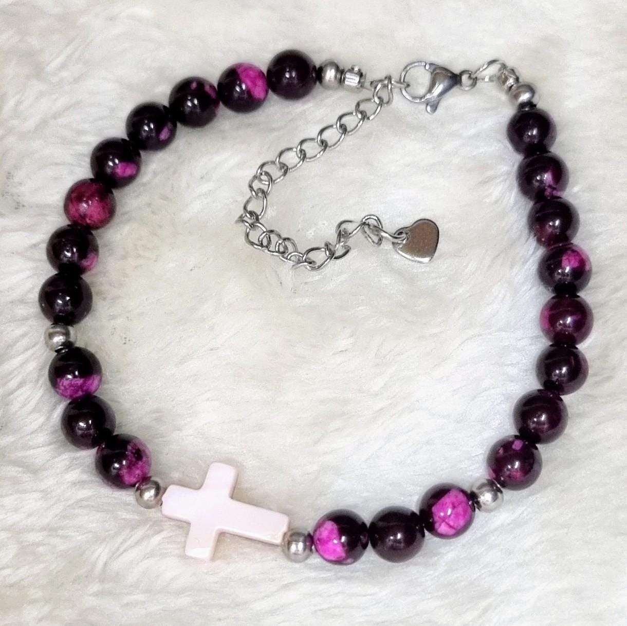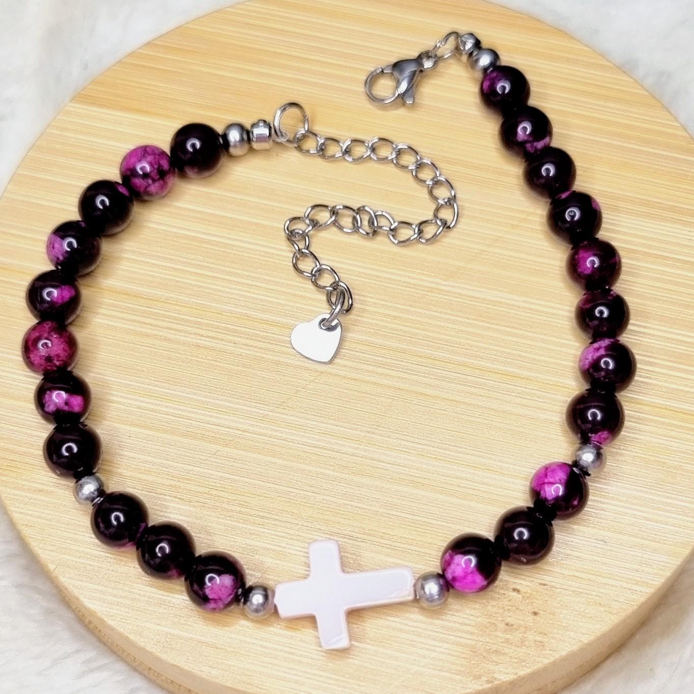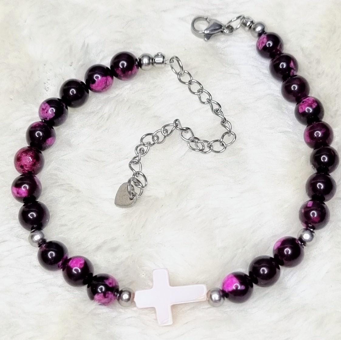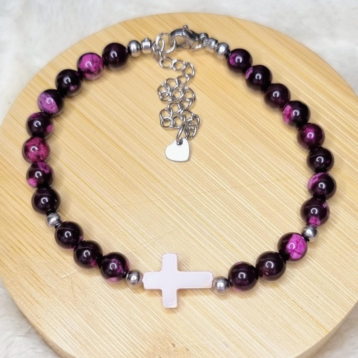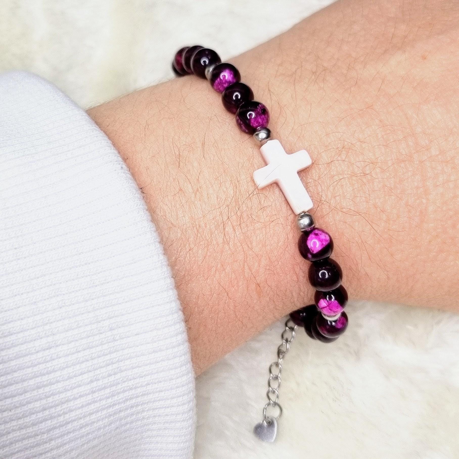 An elegant bracelet made of 6 mm purple tiger's eye beads, whose iridescent play of violet, pink, and rich dark purple is particularly beautiful in the light. The natural shimmer is combined with stainless steel spacer beads and a delicate white shell cross – a harmonious mix of color, luster, and fine detail.