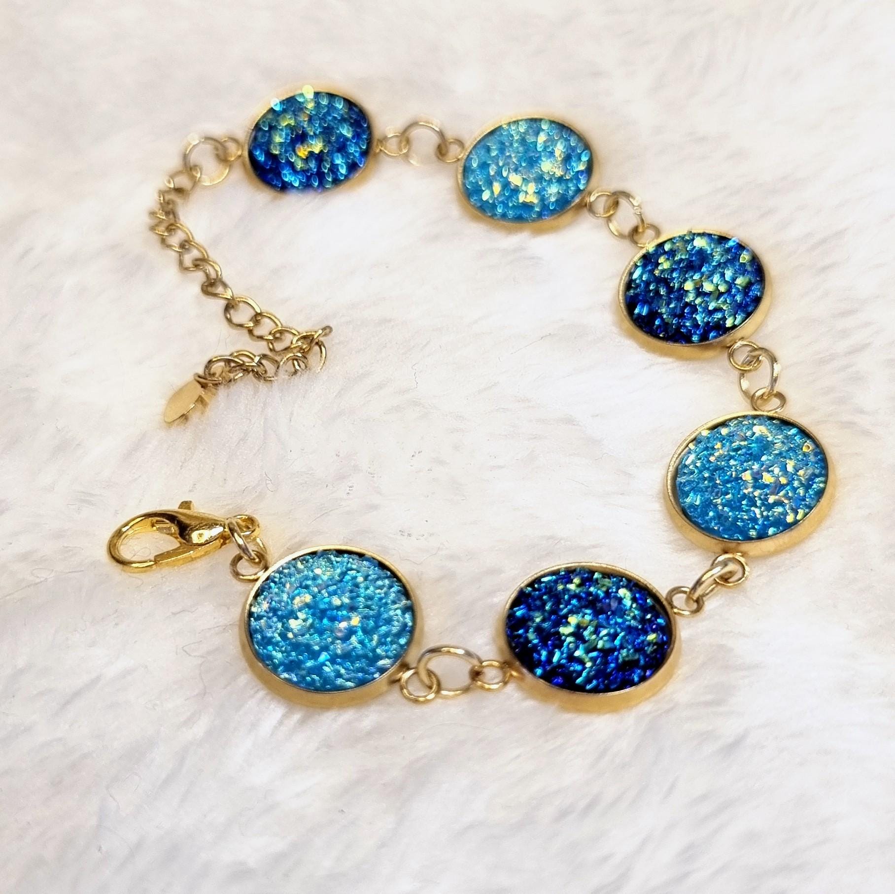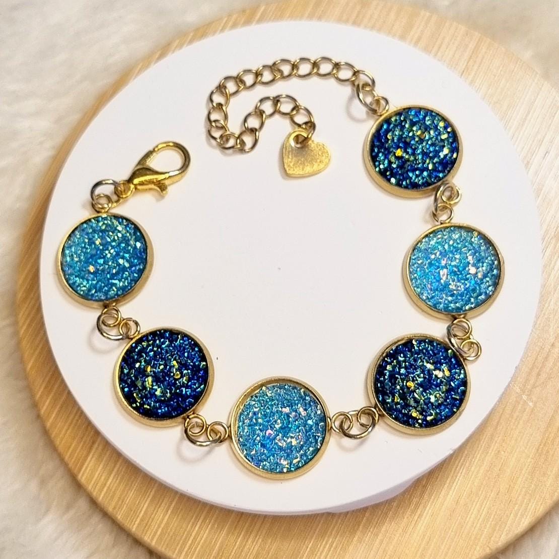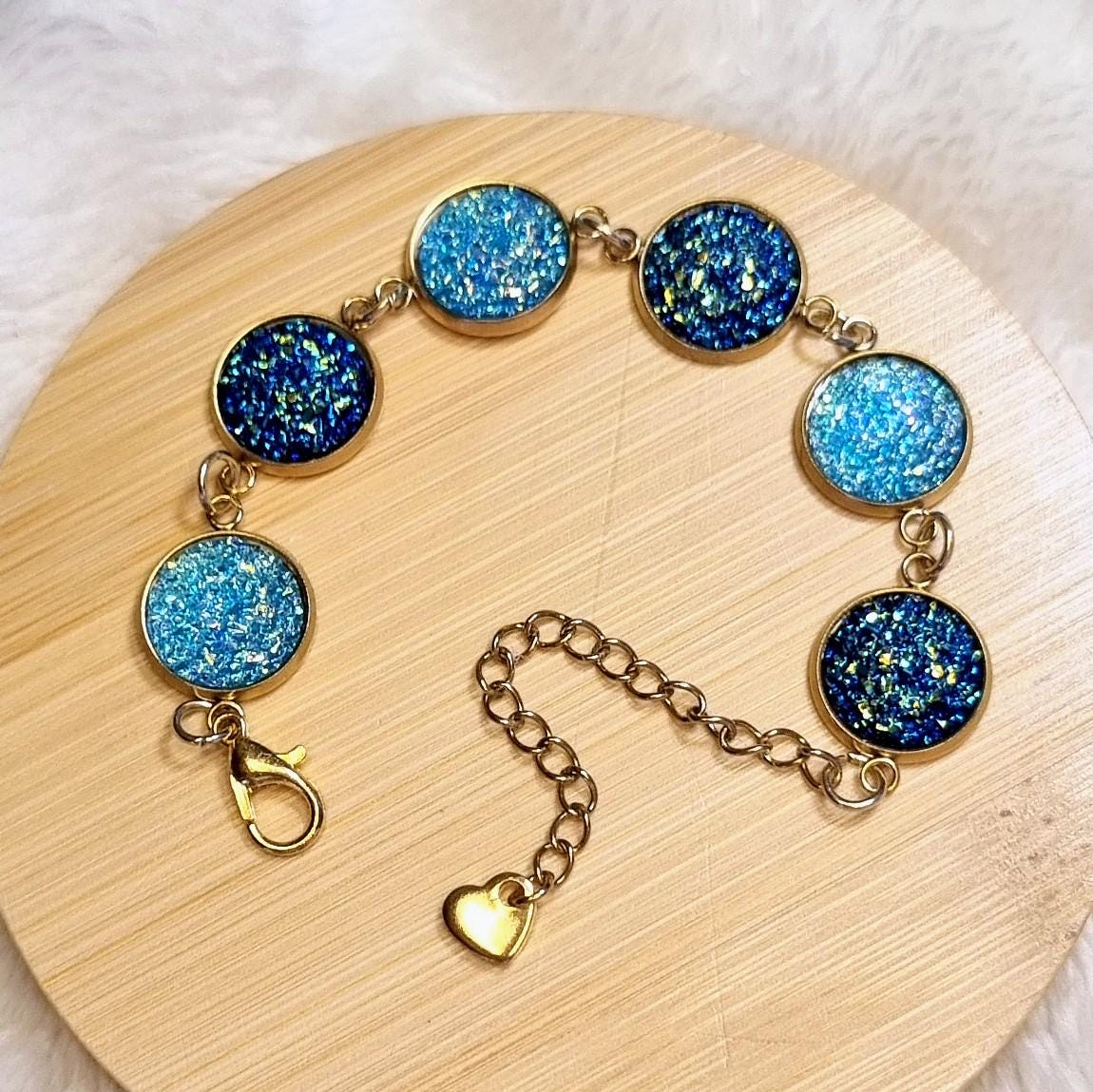 A sparkling statement bracelet in vibrant turquoise and blue tones – inspired by sea light, sun reflections, and clear summer colors. The round resin cabochons shimmer intensely and vividly depending on the light, framed by warm gold-plated stainless steel elements.