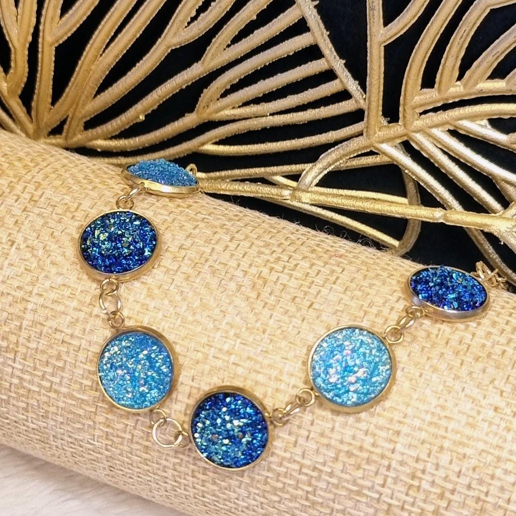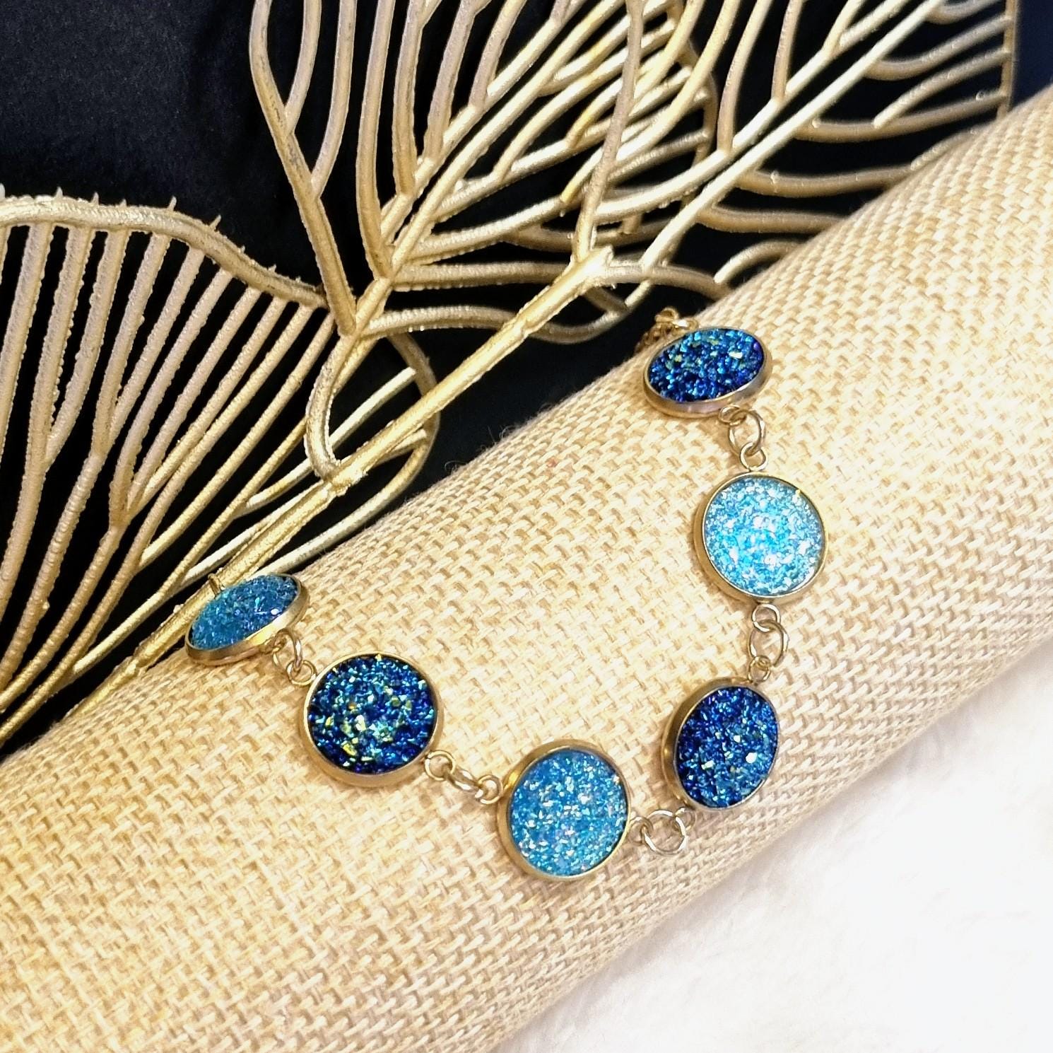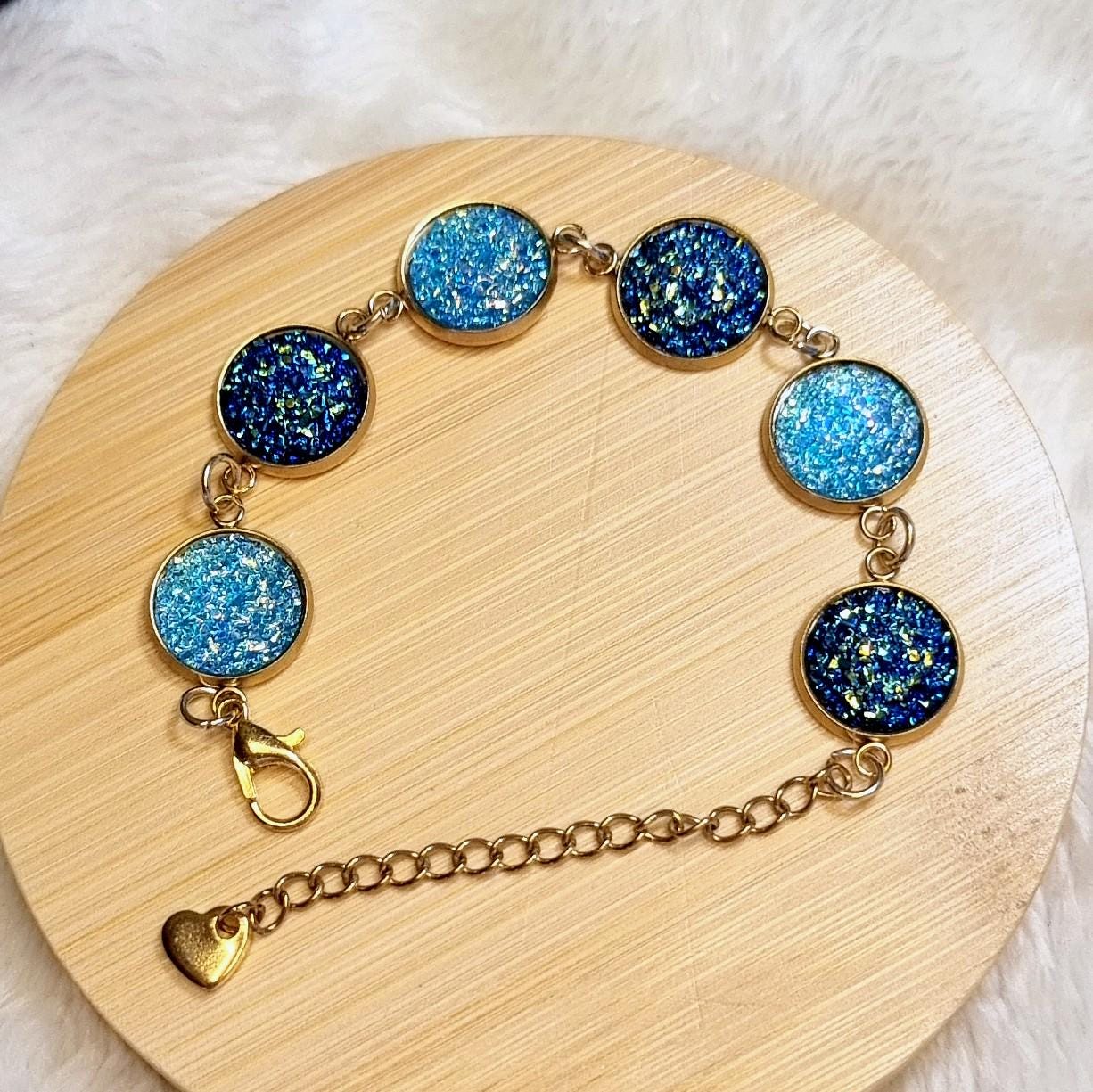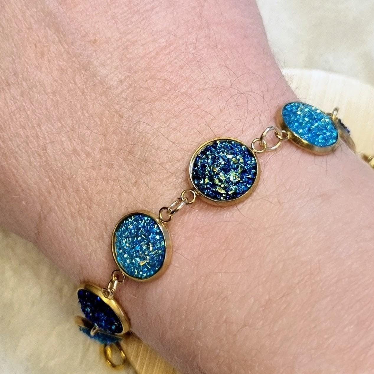 A sparkling statement bracelet in vibrant turquoise and blue tones – inspired by sea light, sun reflections, and clear summer colors. The round resin cabochons shimmer intensely and vividly depending on the light, framed by warm gold-plated stainless steel elements.