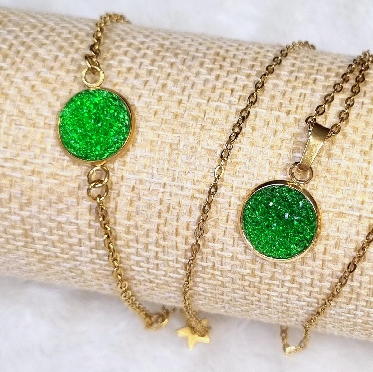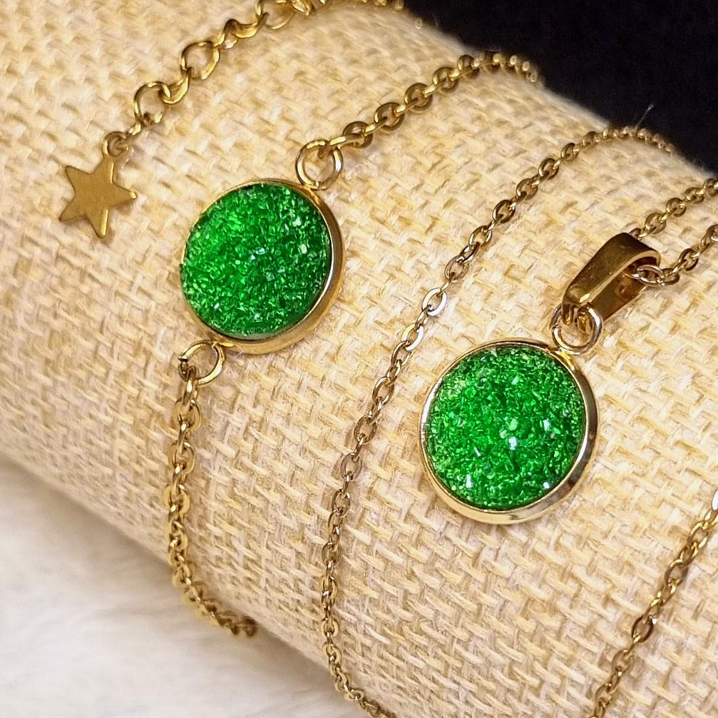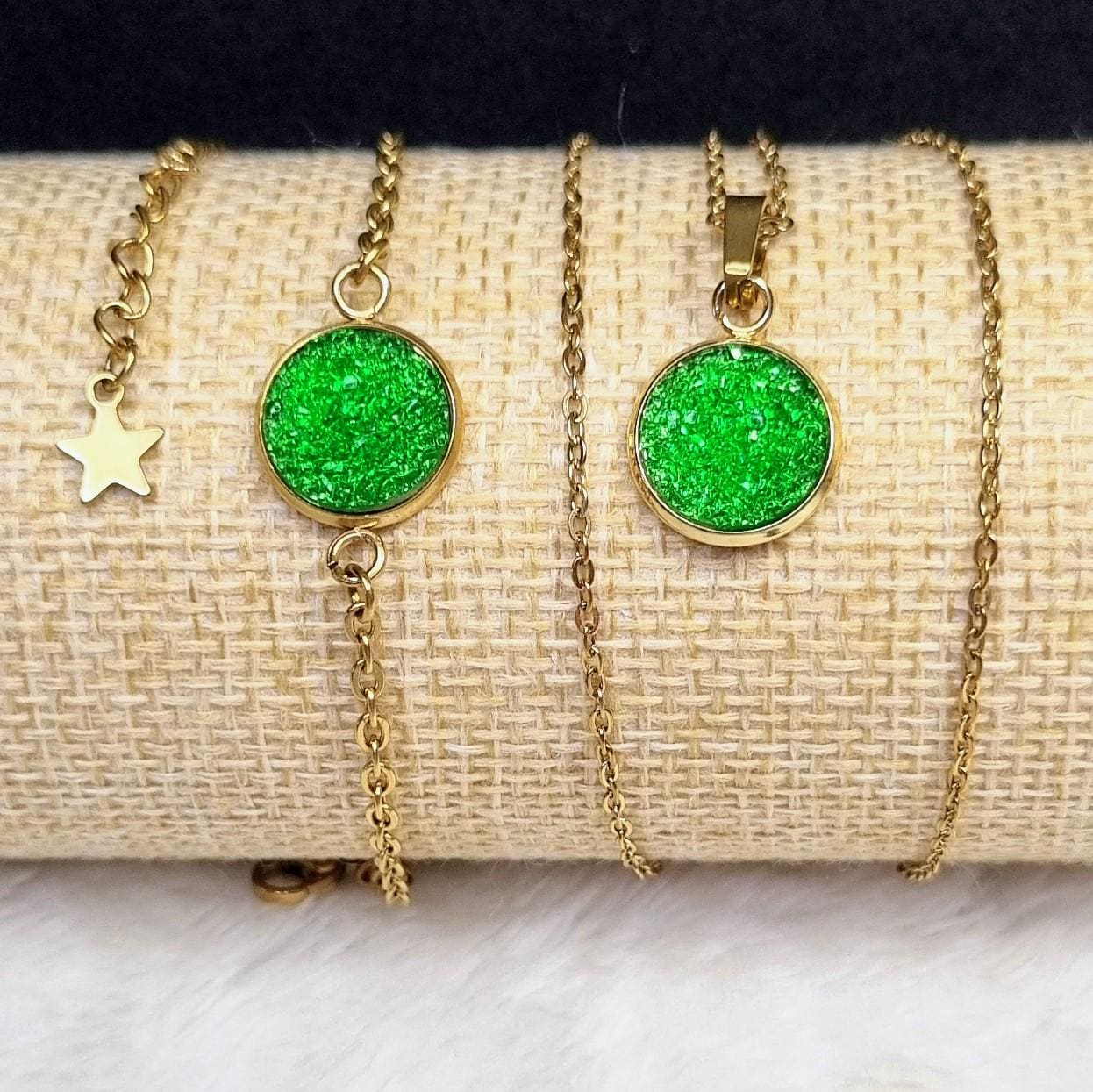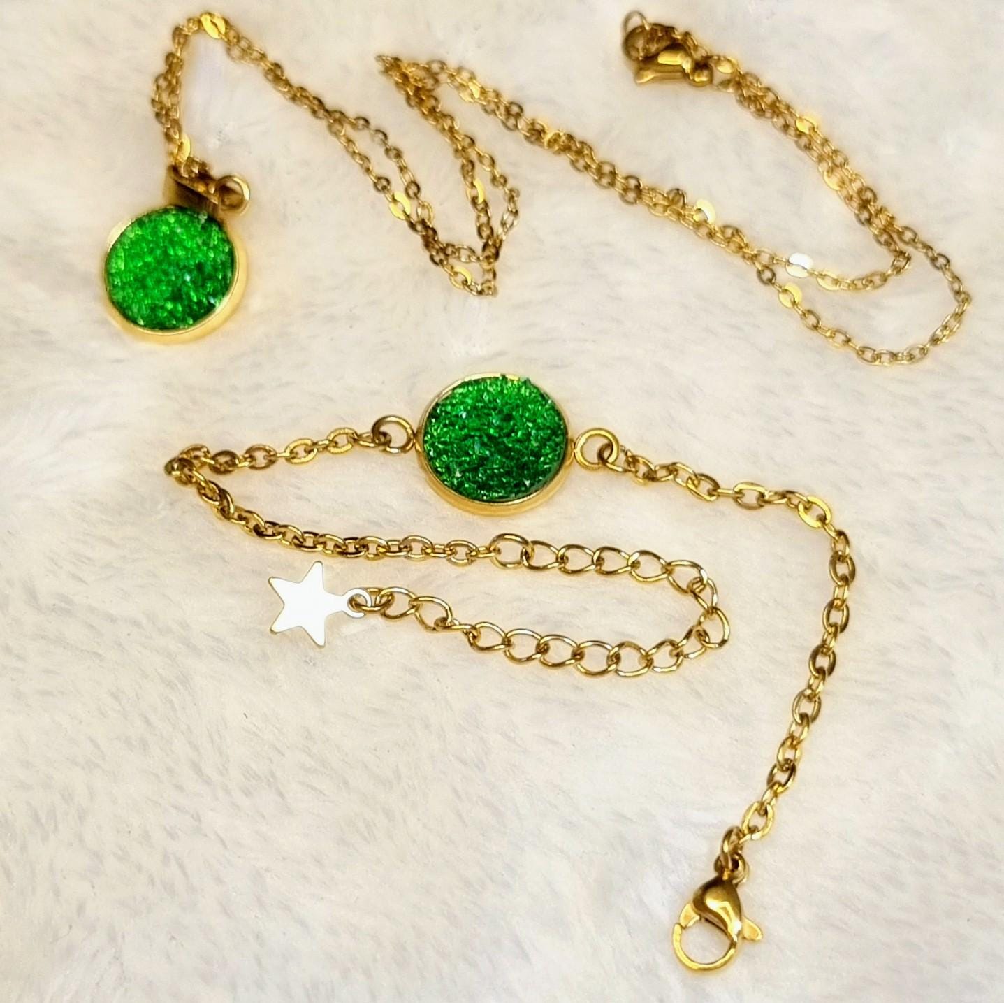 A radiant jewelry set made of 18K gold-plated stainless steel – consisting of a delicate bracelet and an elegant necklace, each adorned with an intensely sparkling green resin cabochon.