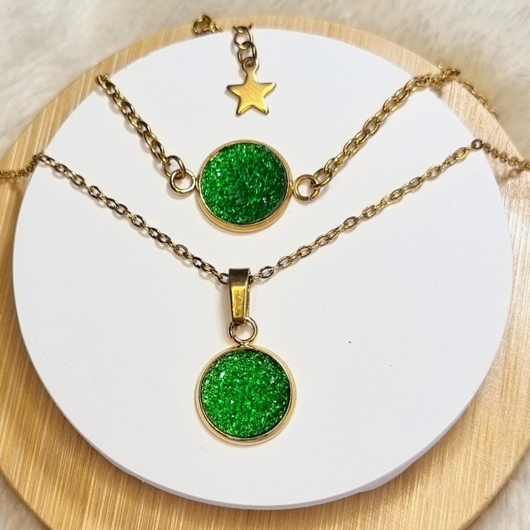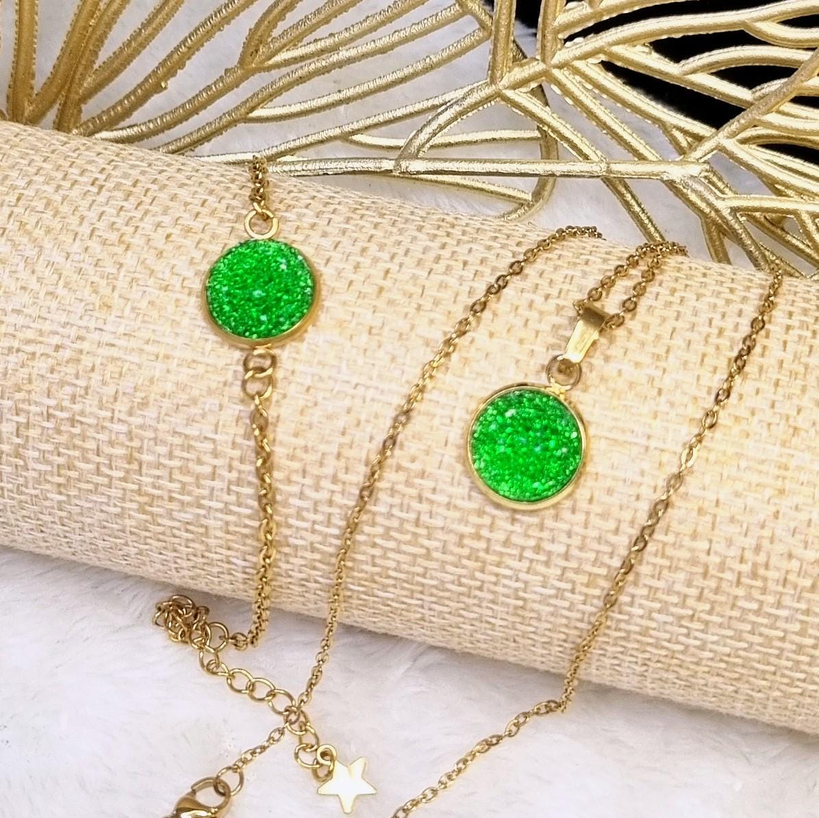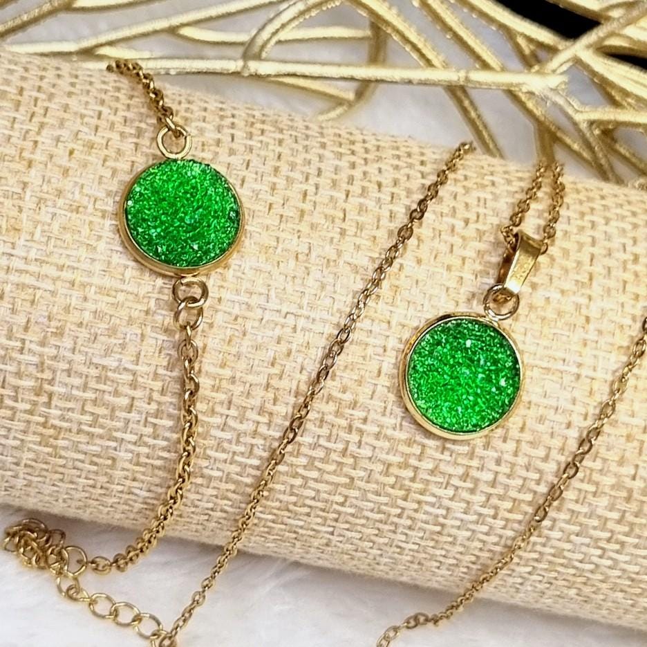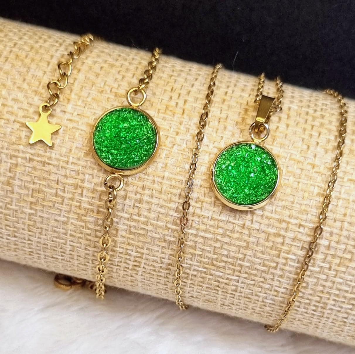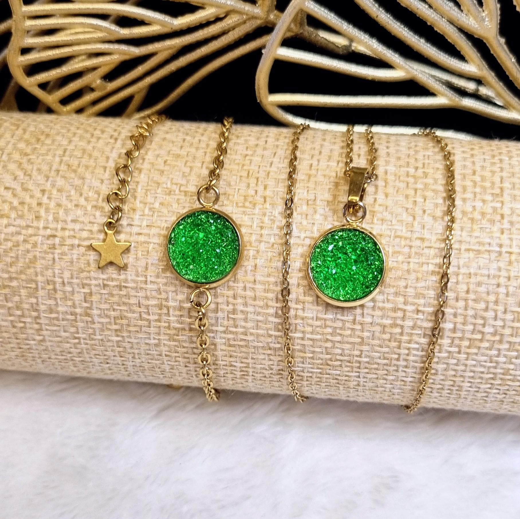 A radiant jewelry set made of 18K gold-plated stainless steel – consisting of a delicate bracelet and an elegant necklace, each adorned with an intensely sparkling green resin cabochon.