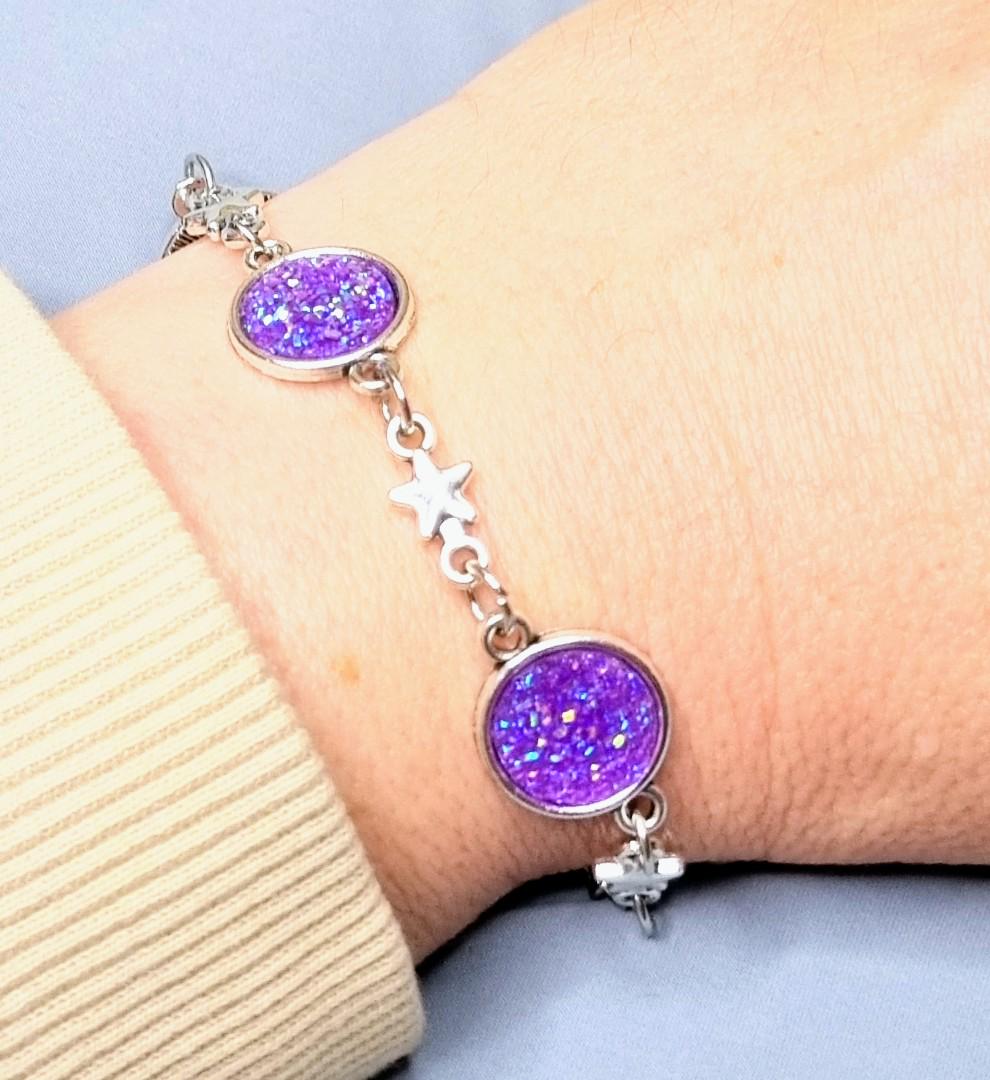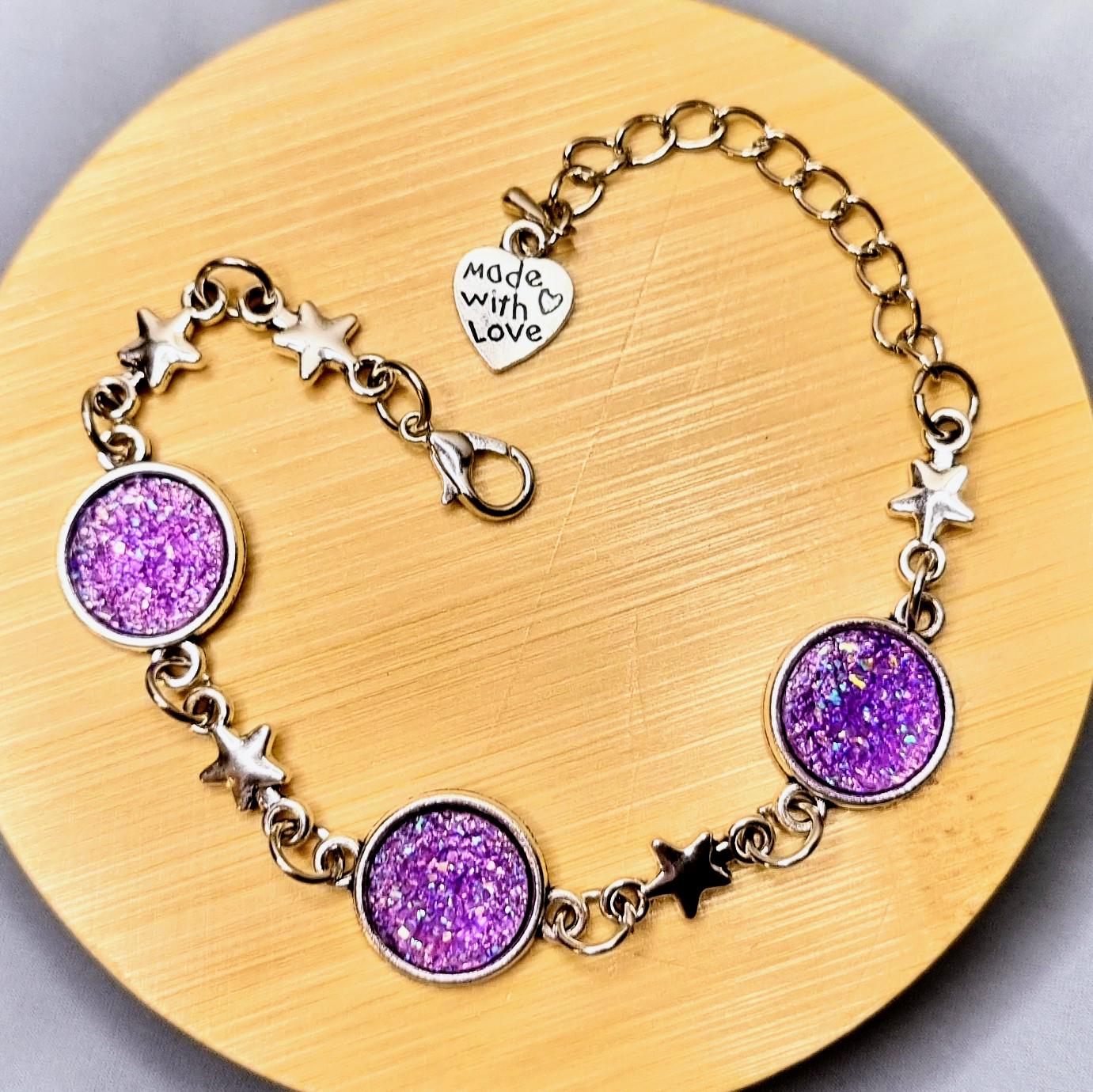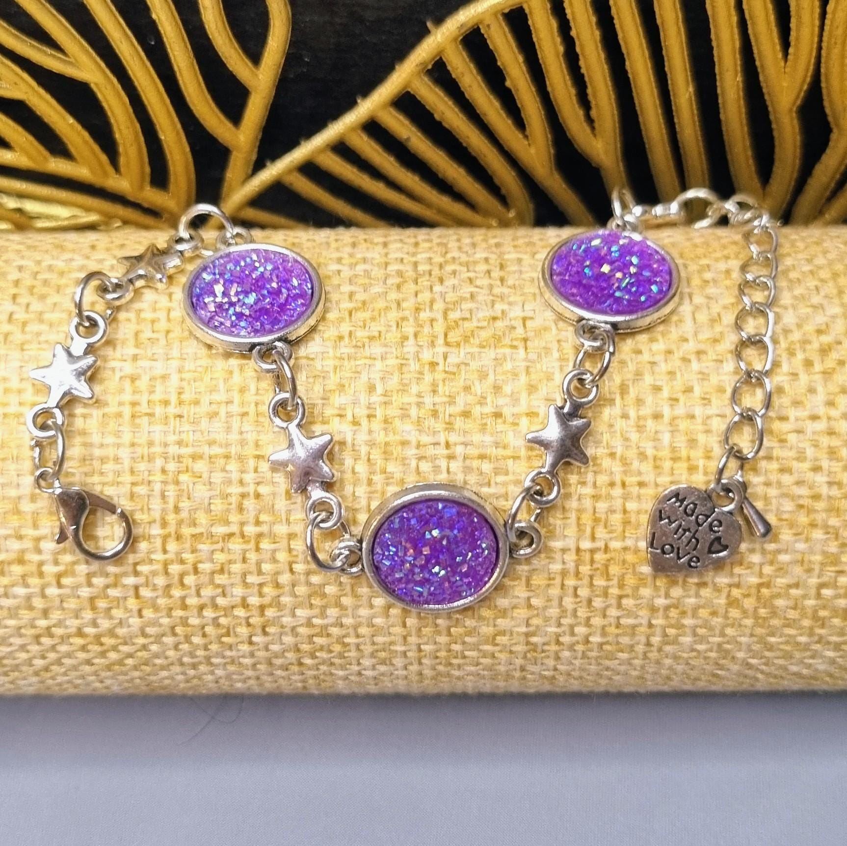 The 12 mm cabochons sparkle intensely in shades of purple-violet, depending on the light, creating a beautiful highlight on the wrist. The small star elements lend the bracelet a playful, feminine touch.