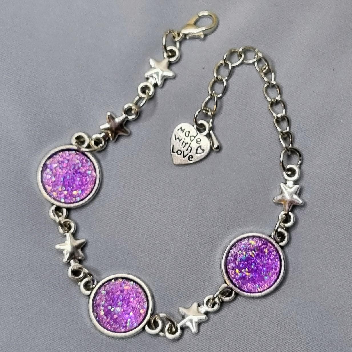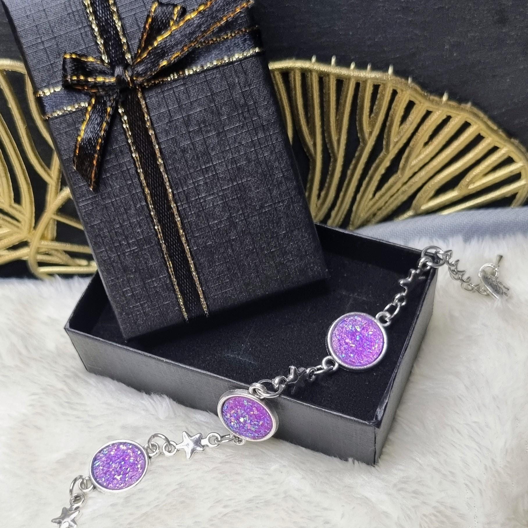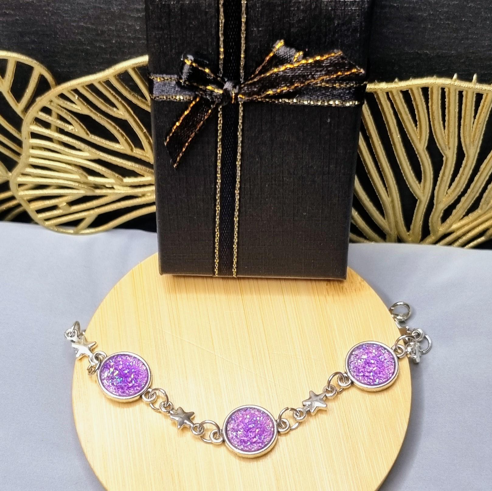 The 12 mm cabochons sparkle intensely in shades of purple-violet, depending on the light, creating a beautiful highlight on the wrist. The small star elements lend the bracelet a playful, feminine touch.