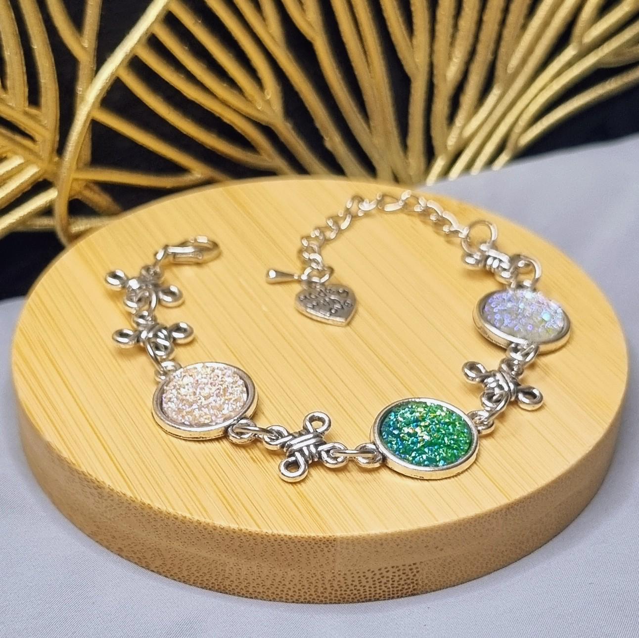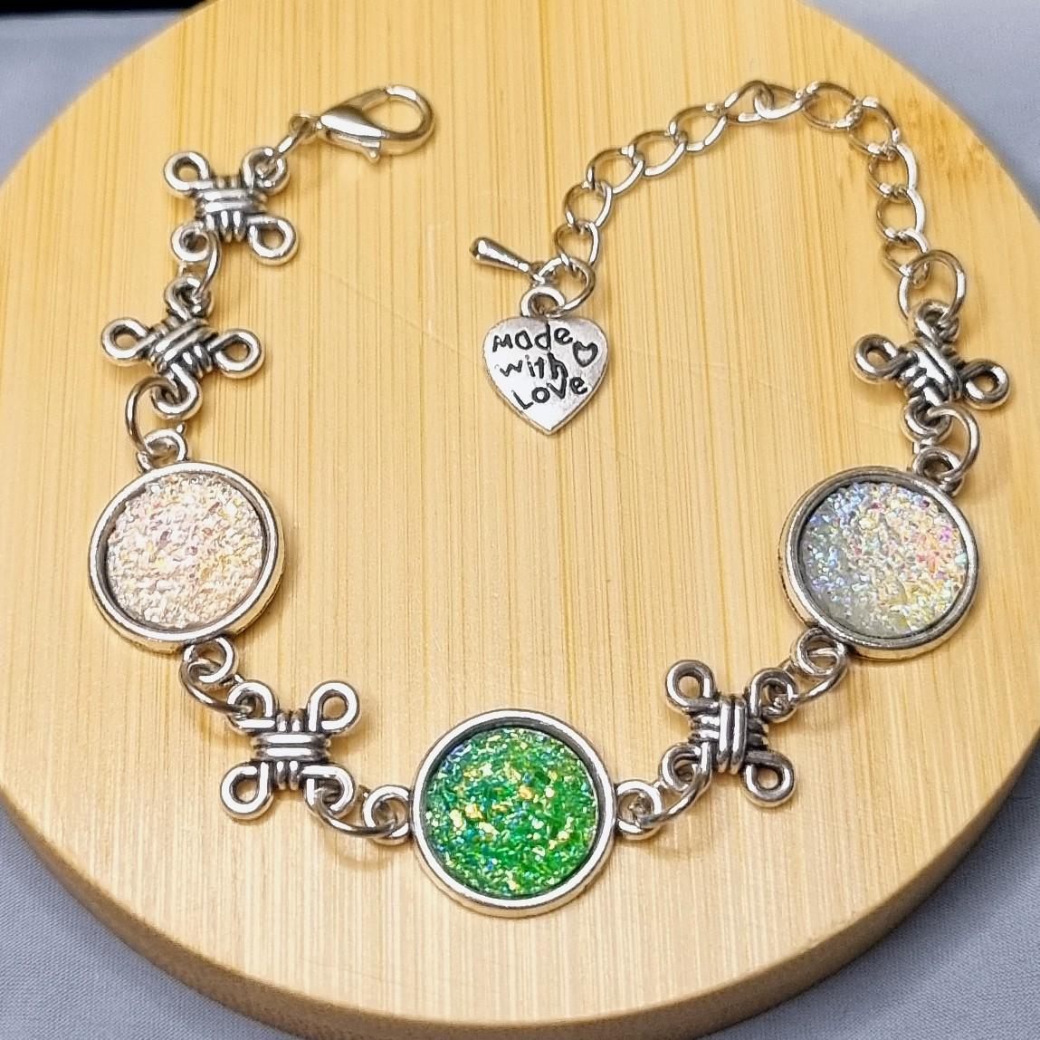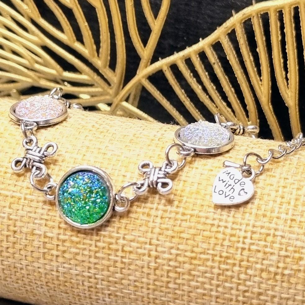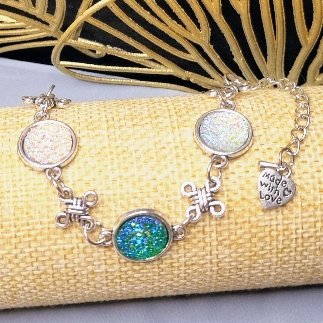 This elegant bracelet combines sparkling 12mm cabochons with artful knotted details, giving the design a special, almost mystical touch. Depending on the light, the cabochons shimmer intensely in white and green, creating a radiant focal point.