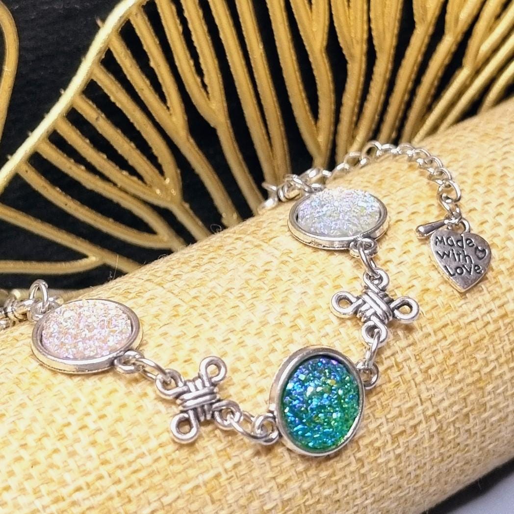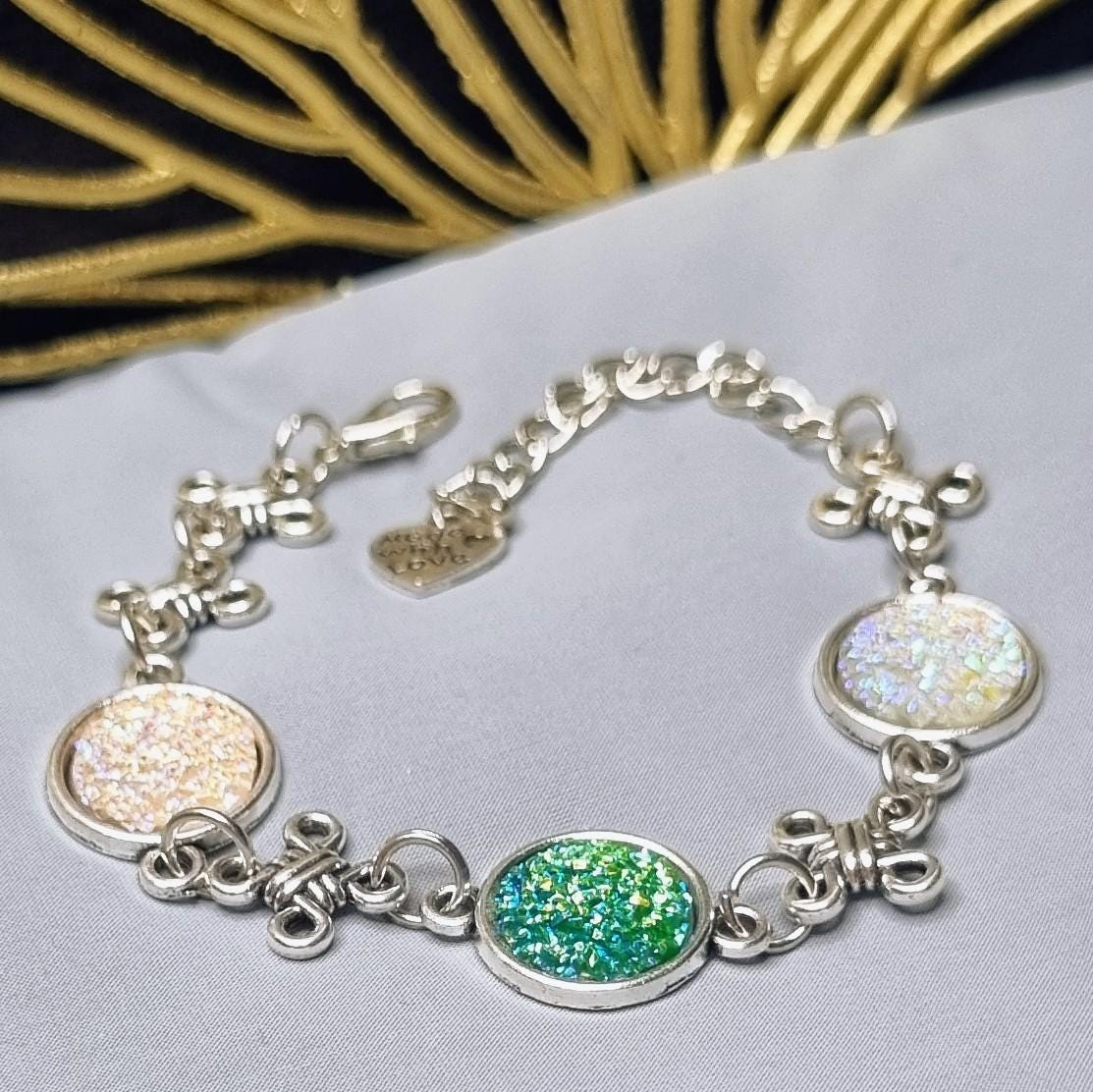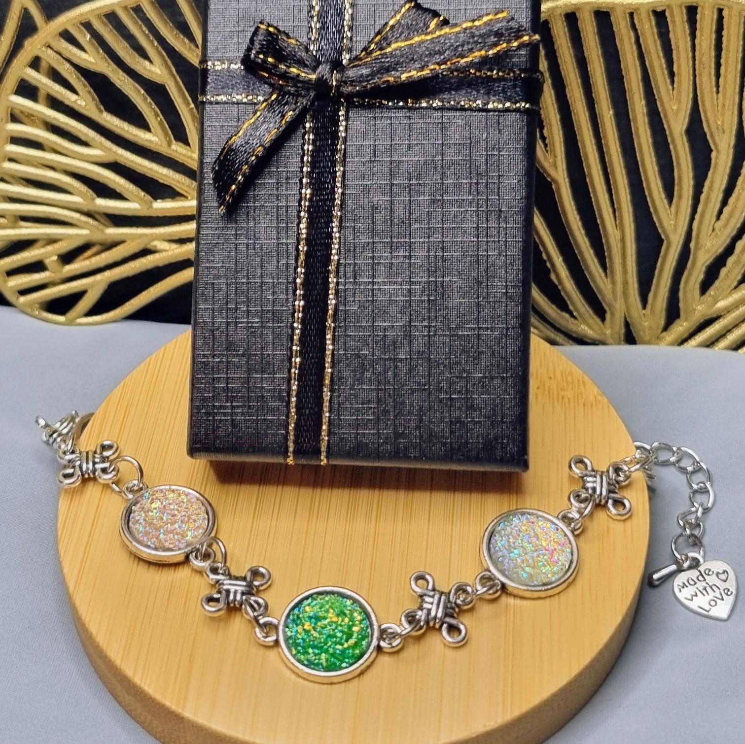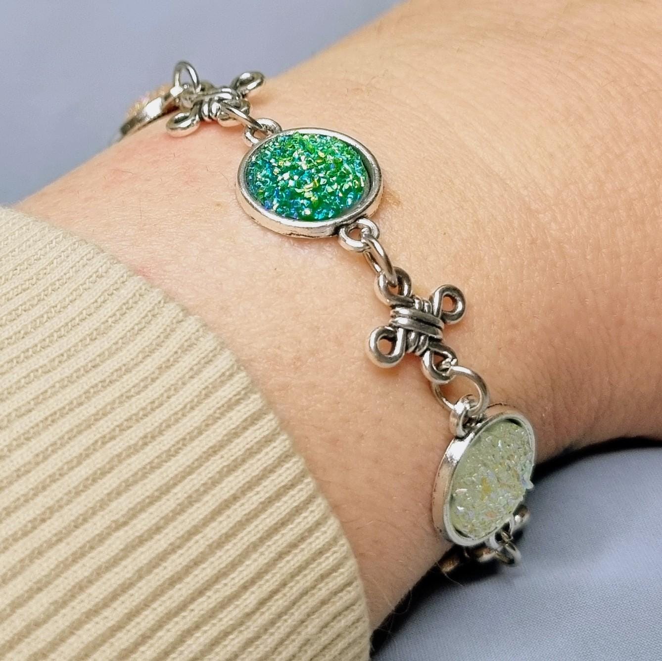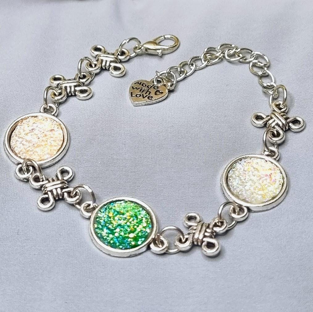 This elegant bracelet combines sparkling 12mm cabochons with artful knotted details, giving the design a special, almost mystical touch. Depending on the light, the cabochons shimmer intensely in white and green, creating a radiant focal point.