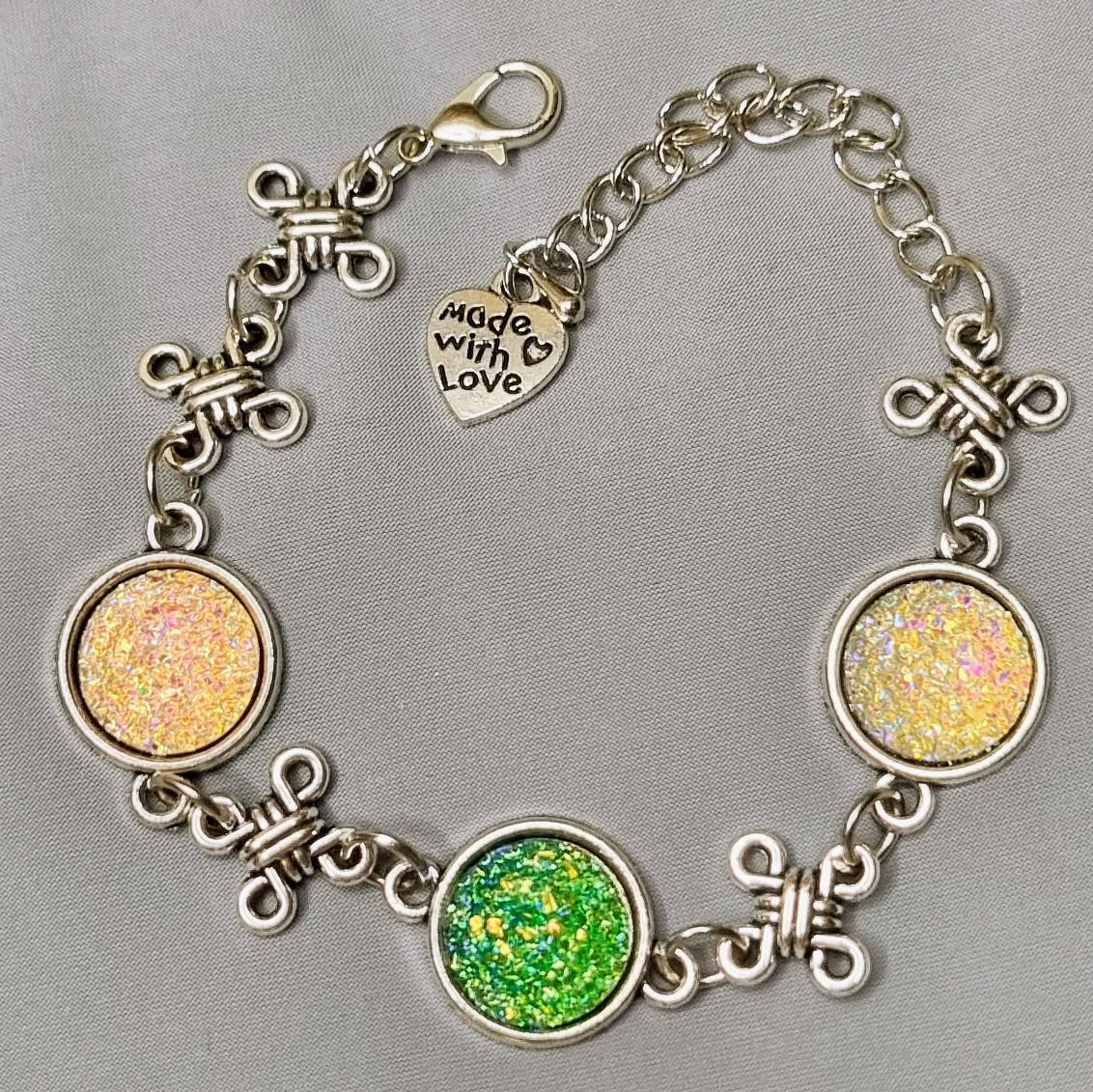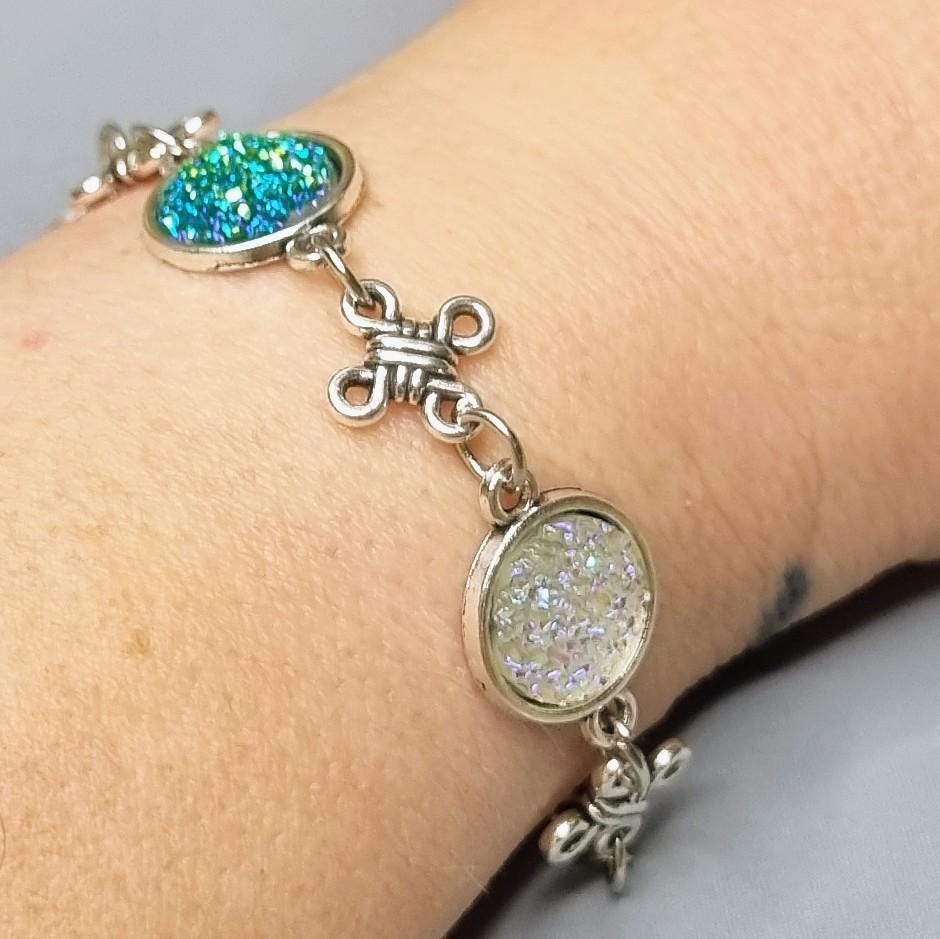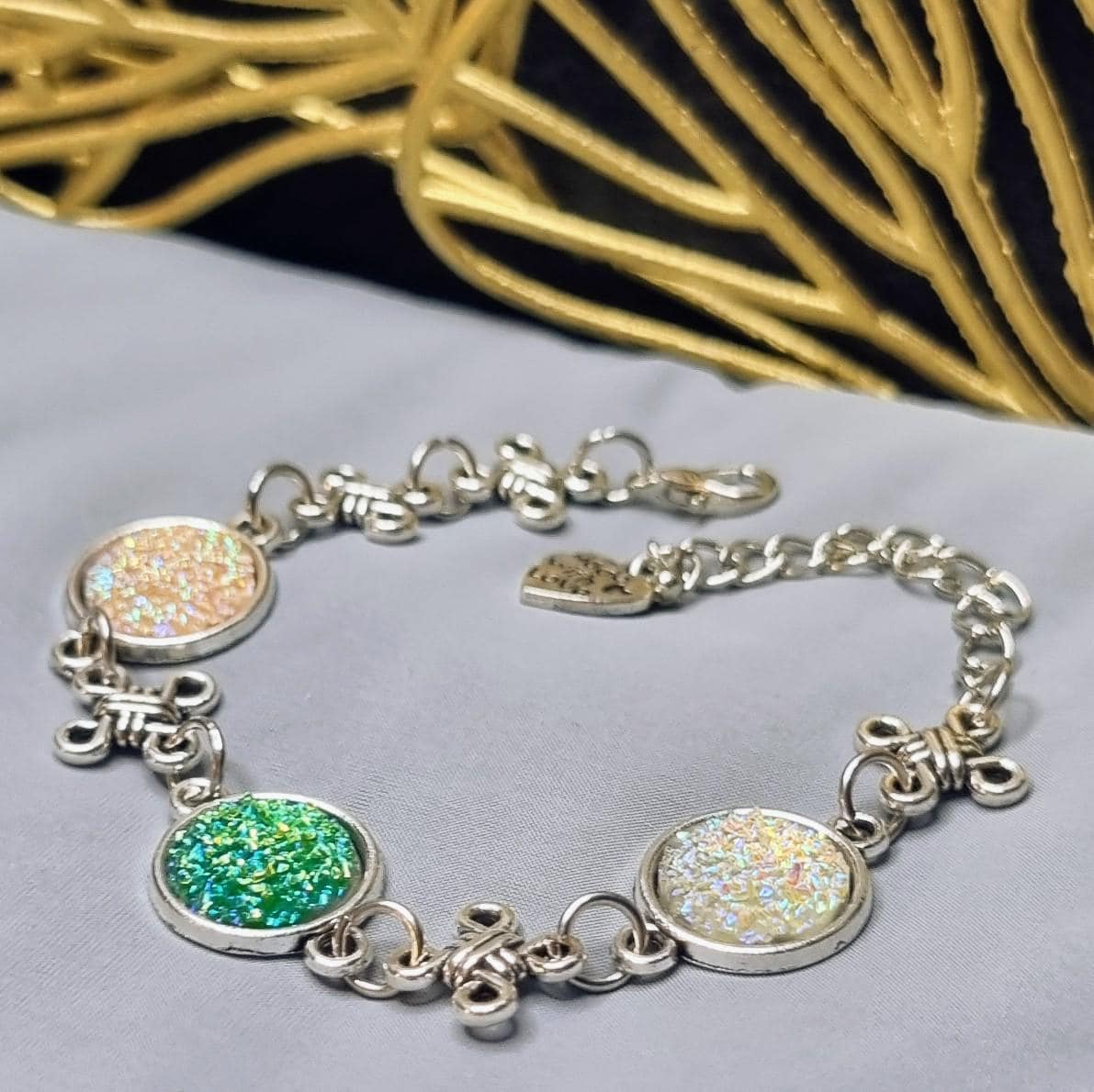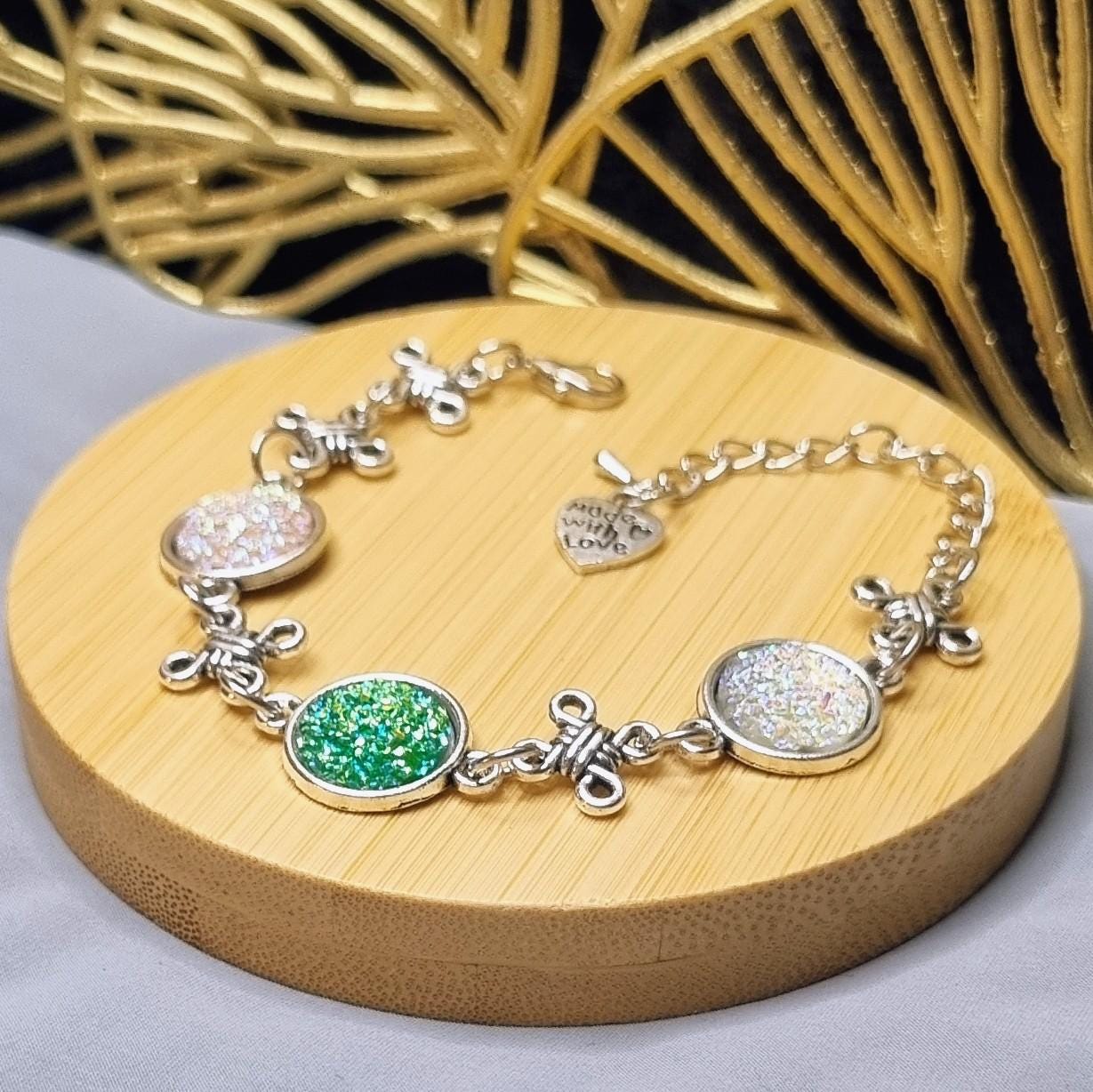 This elegant bracelet combines sparkling 12mm cabochons with artful knotted details, giving the design a special, almost mystical touch. Depending on the light, the cabochons shimmer intensely in white and green, creating a radiant focal point.