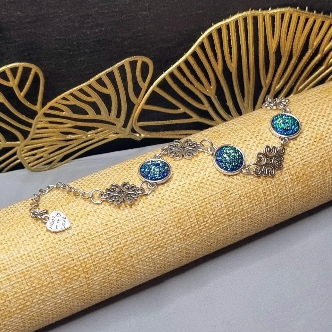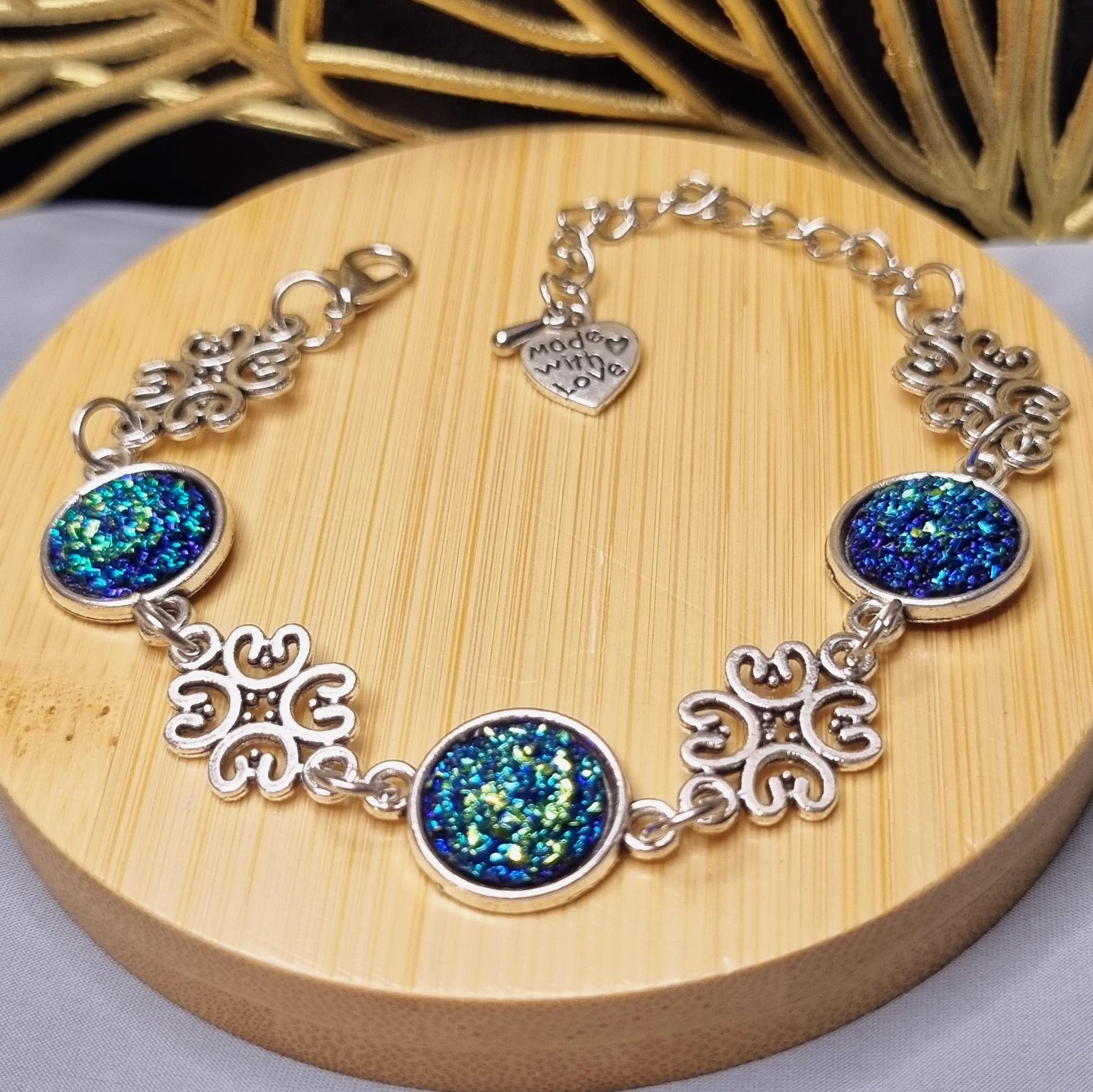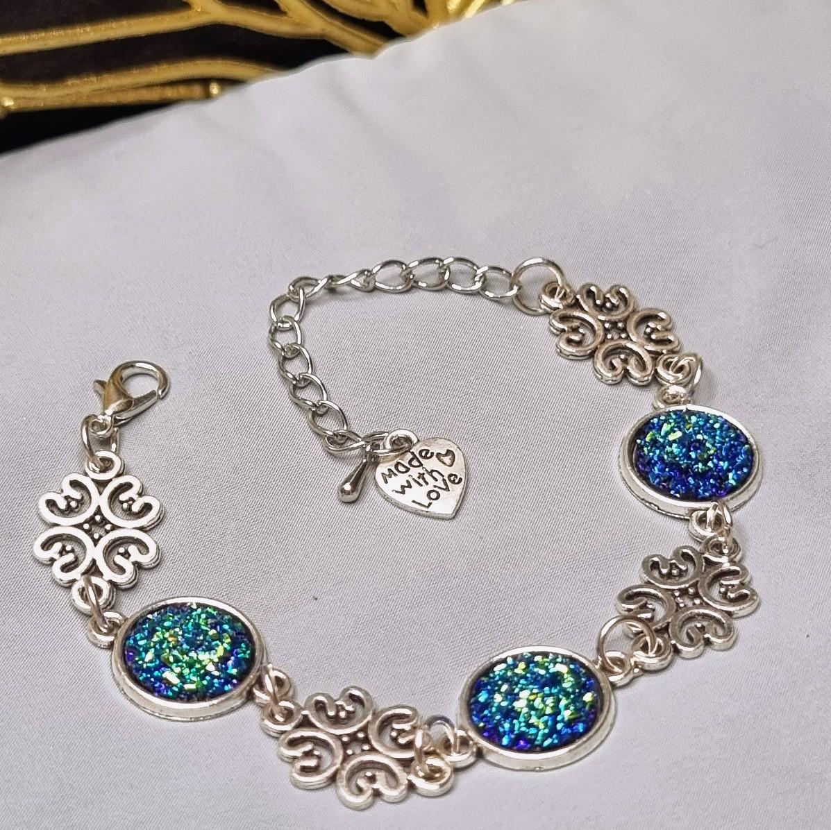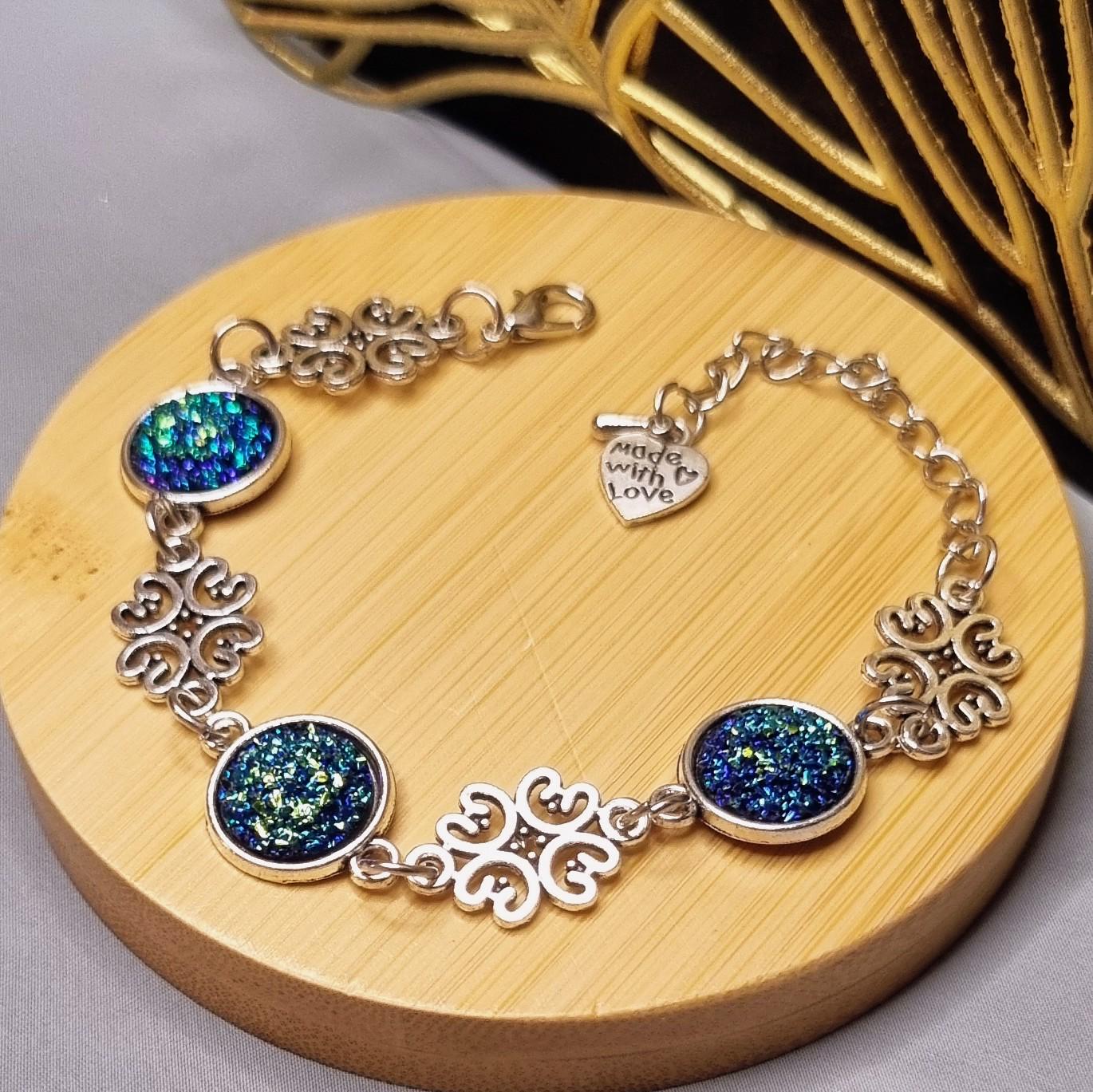 An exceptional bracelet that immediately catches the eye with its intensely shimmering 12mm cabochons in blue-green. The intricately detailed ornamental spacers lend the piece an elegant, almost filigree look.