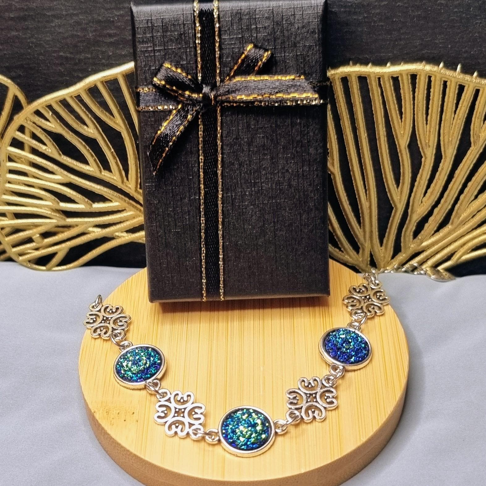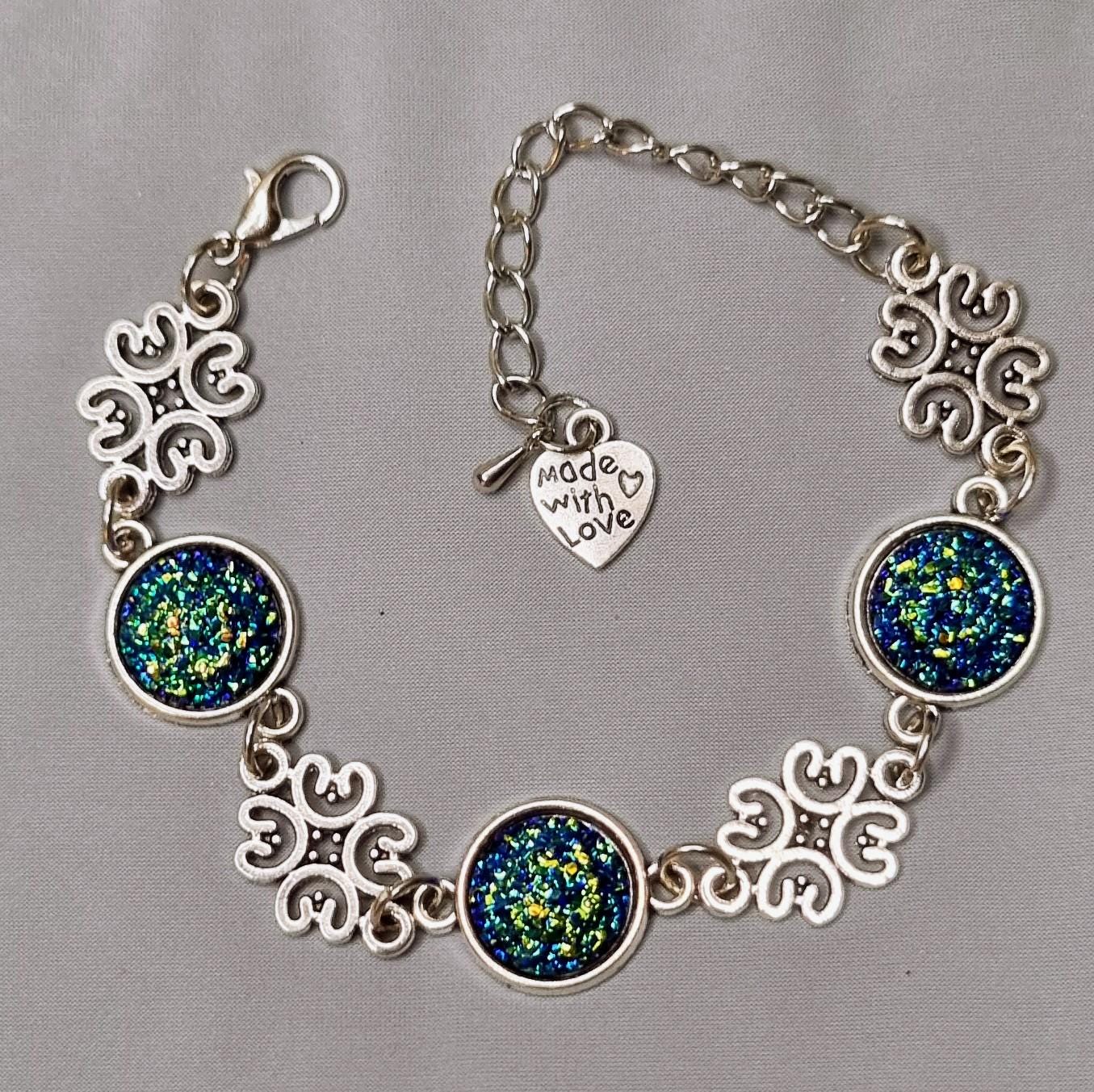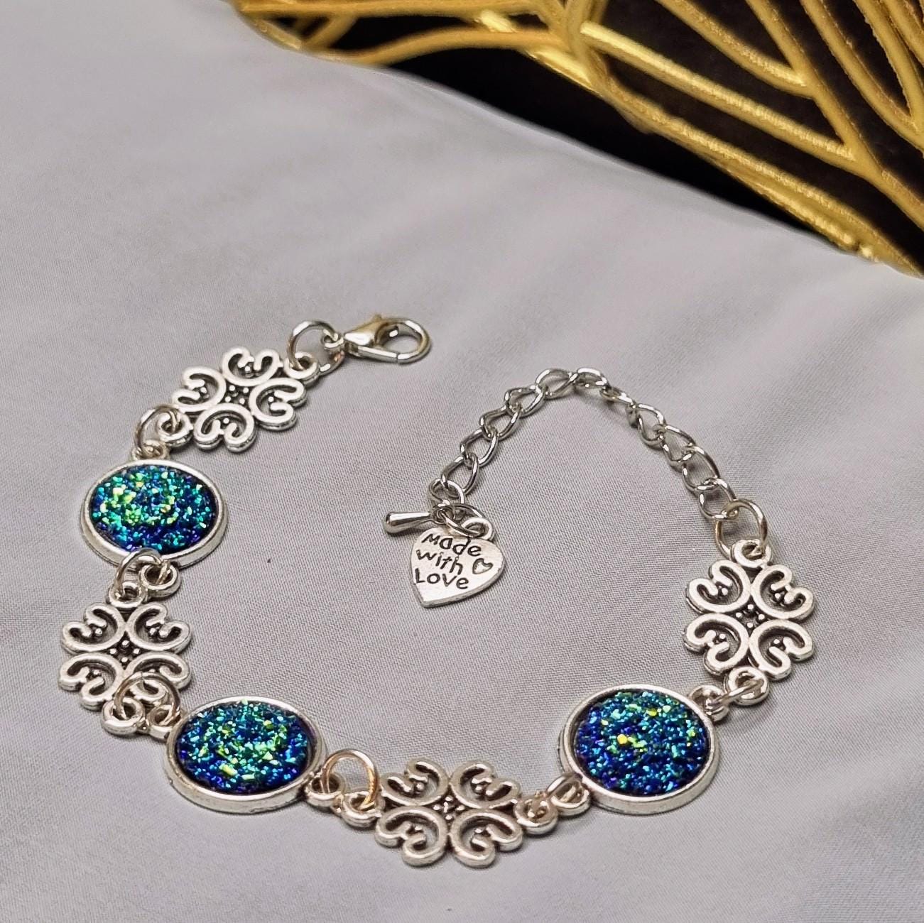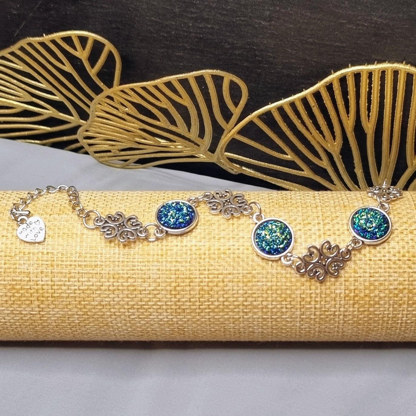 An exceptional bracelet that immediately catches the eye with its intensely shimmering 12mm cabochons in blue-green. The intricately detailed ornamental spacers lend the piece an elegant, almost filigree look.
