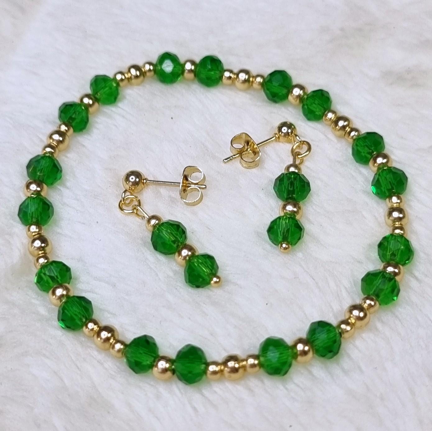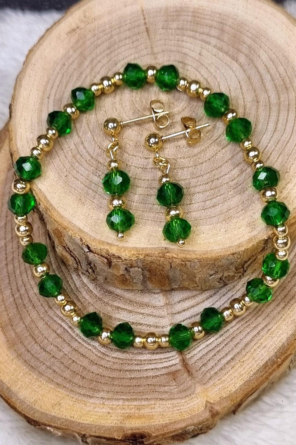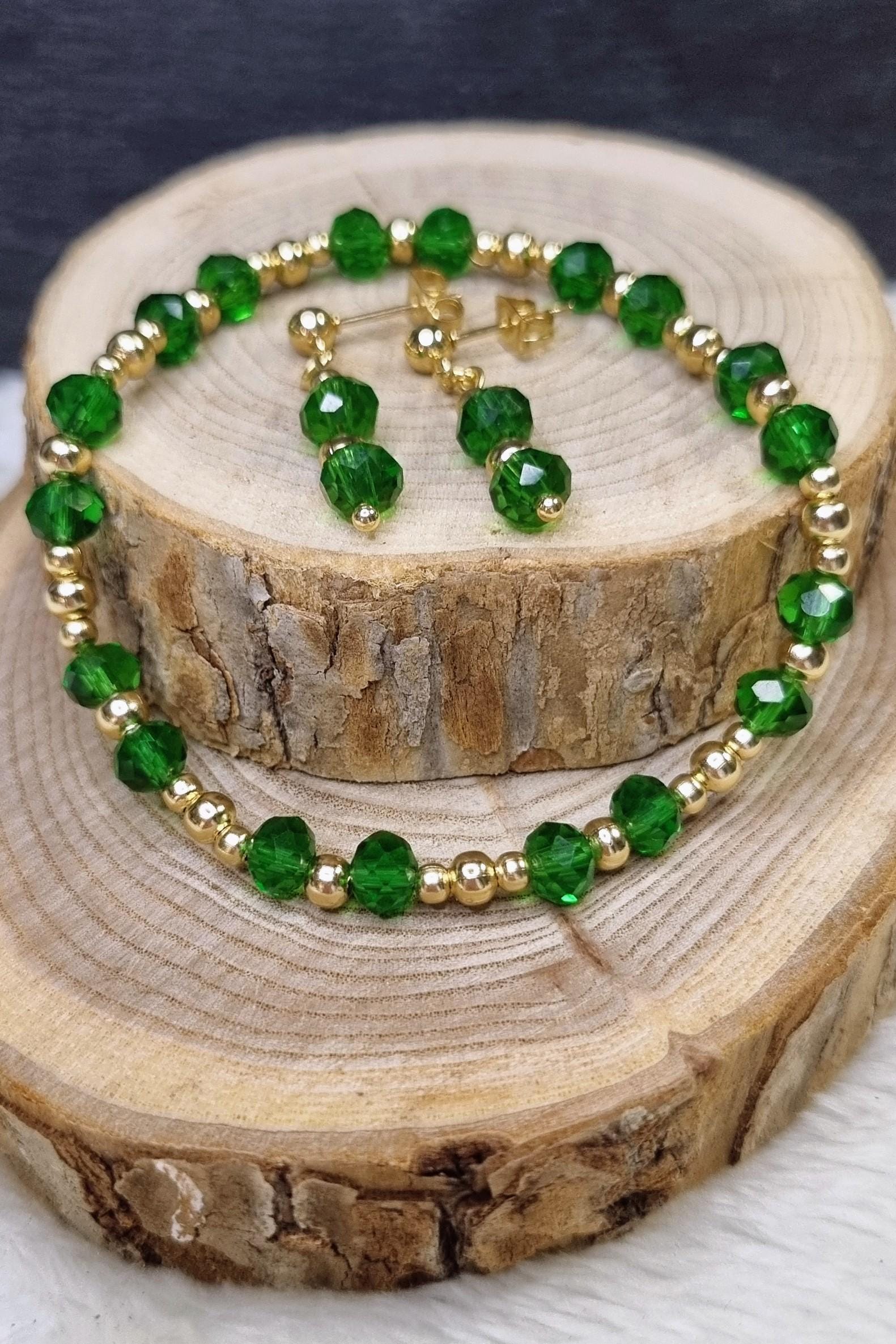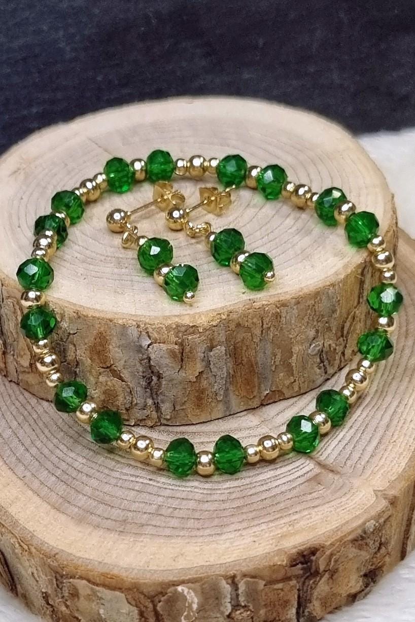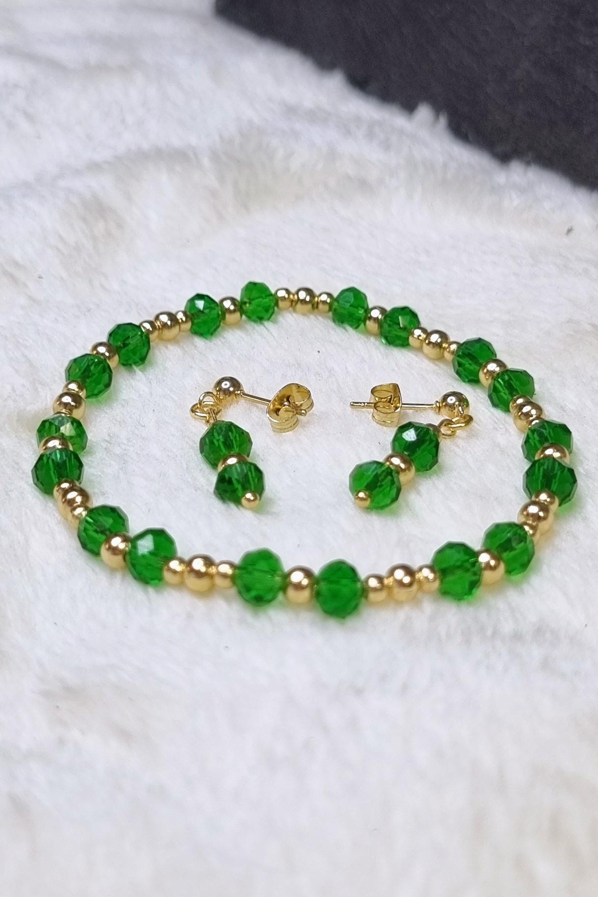 An elegant jewelry set in vibrant green, combined with gold-plated stainless steel for a warm, sophisticated look. The faceted glass beads add a subtle sparkle and harmonize beautifully with the gold-colored stainless steel spacer beads.