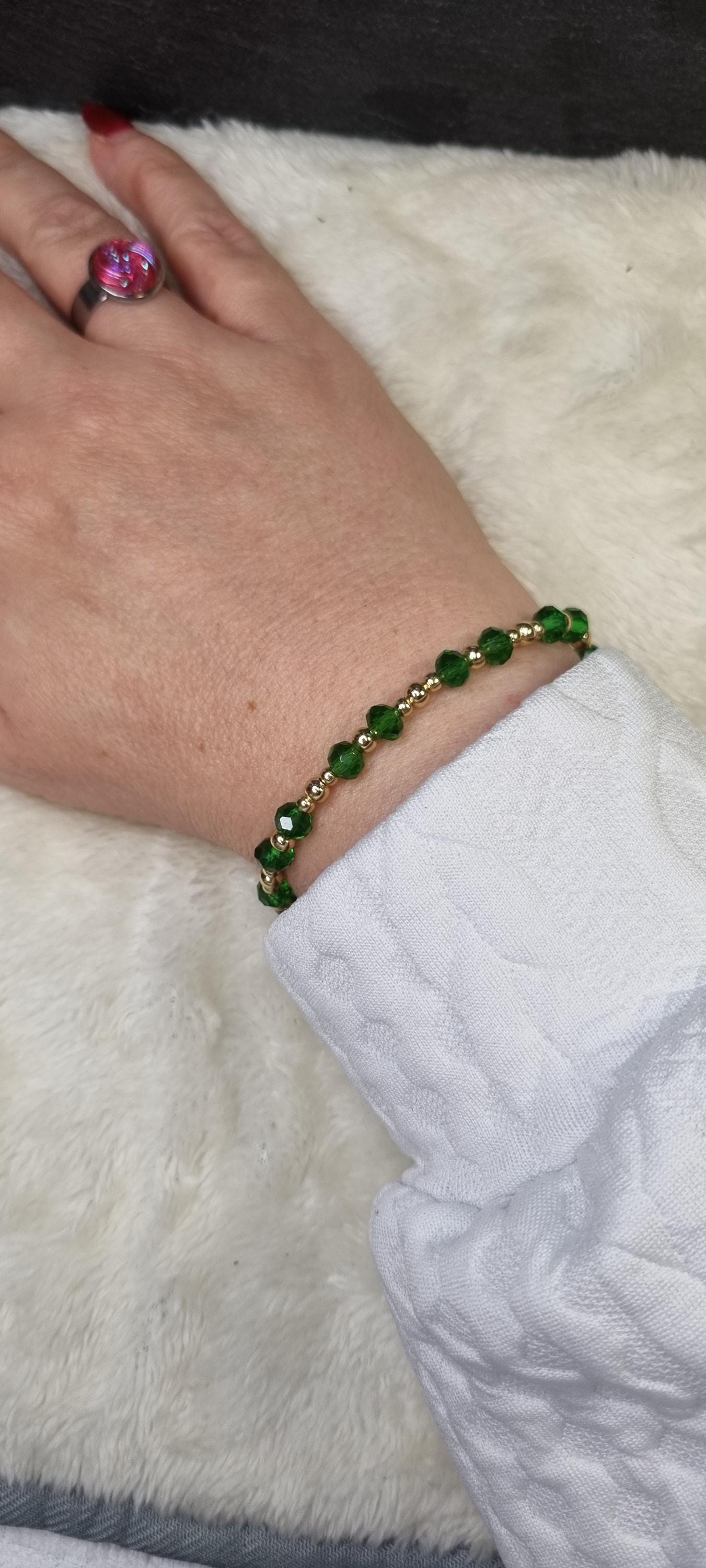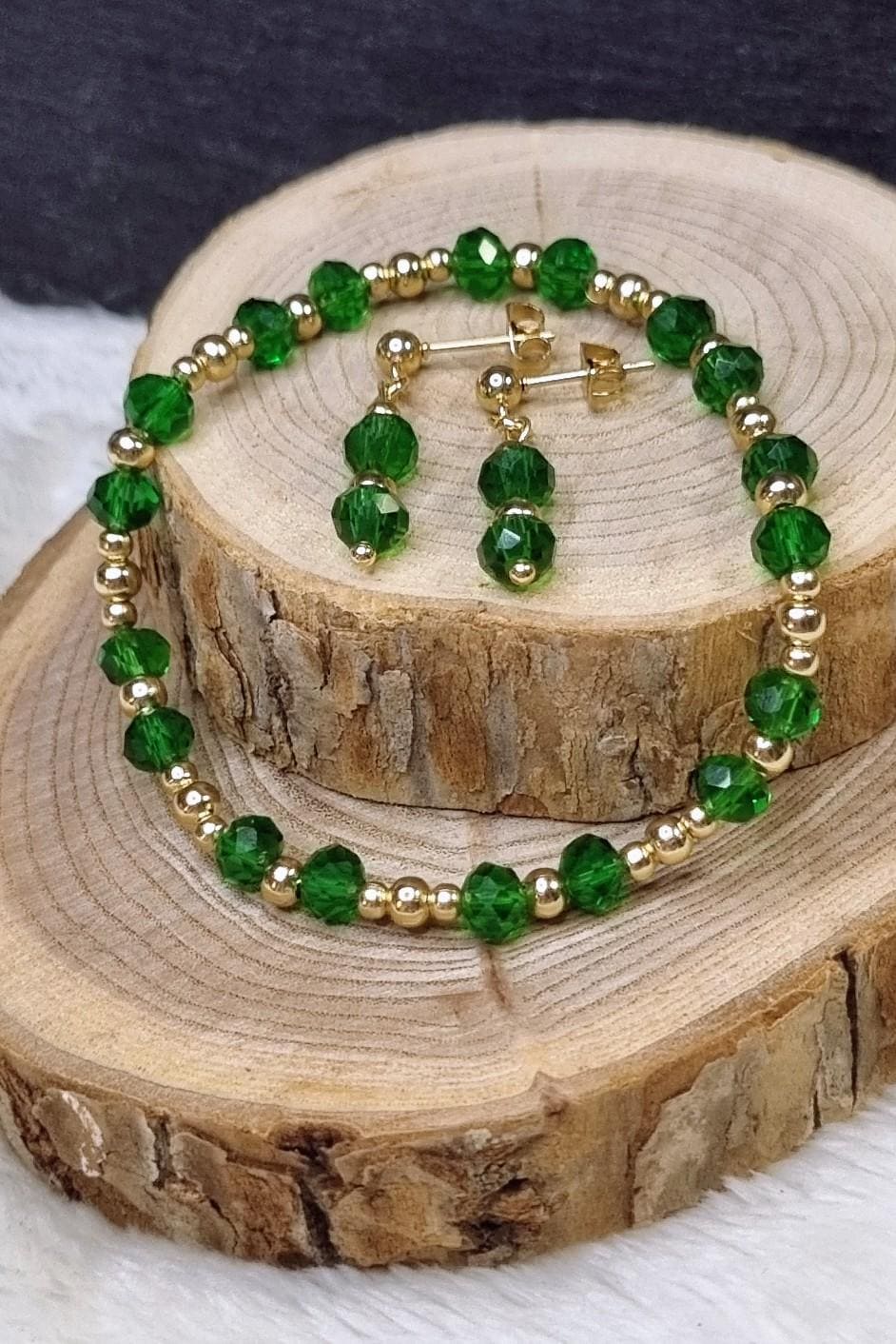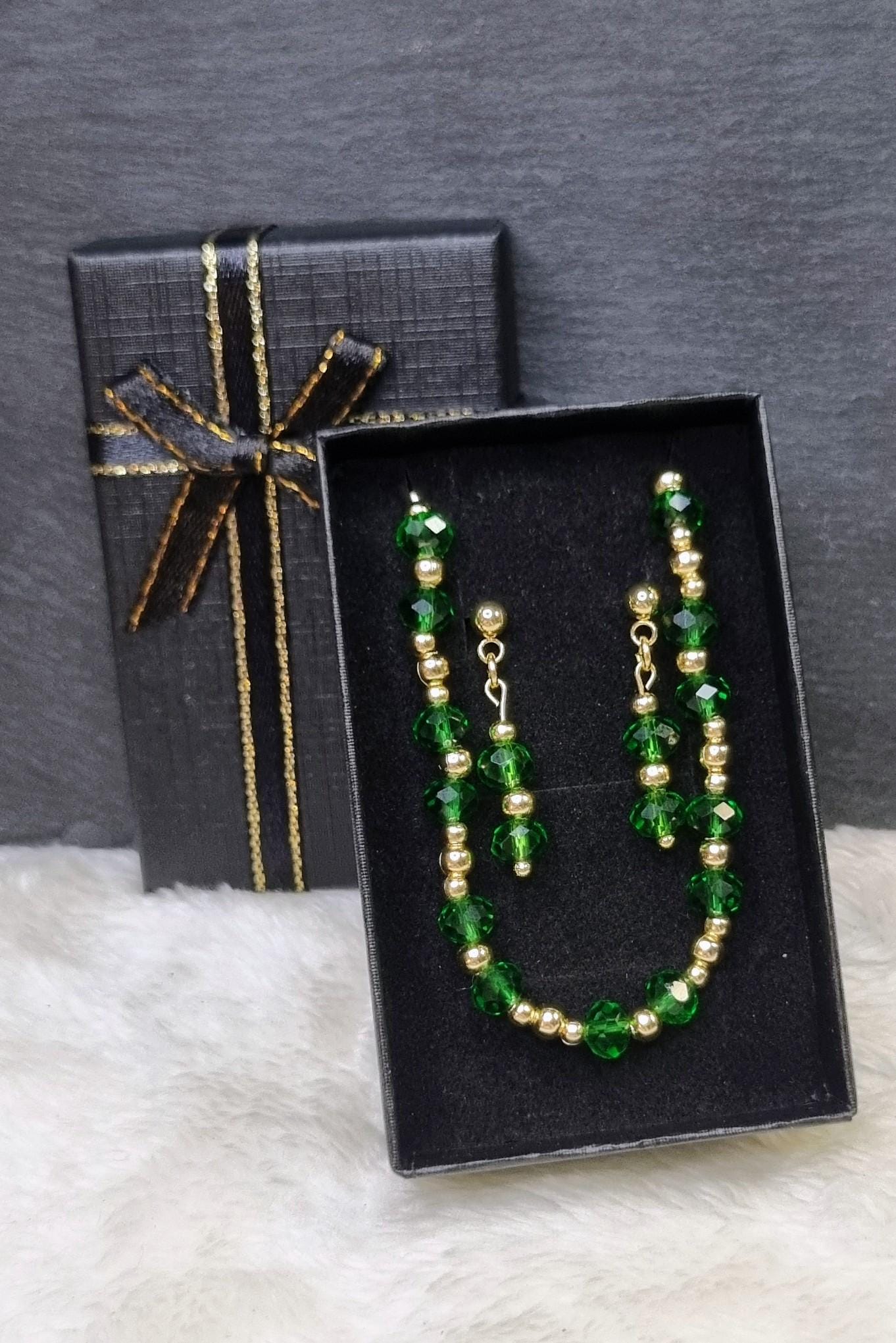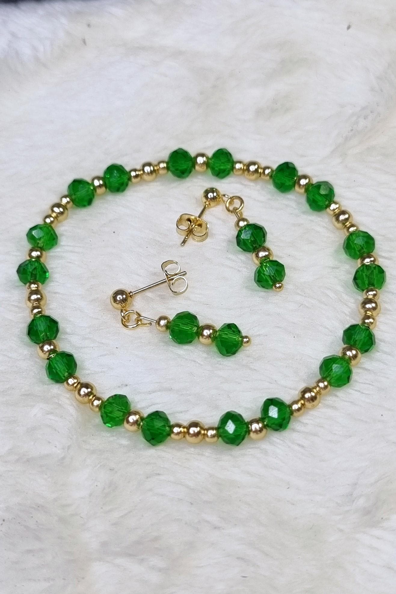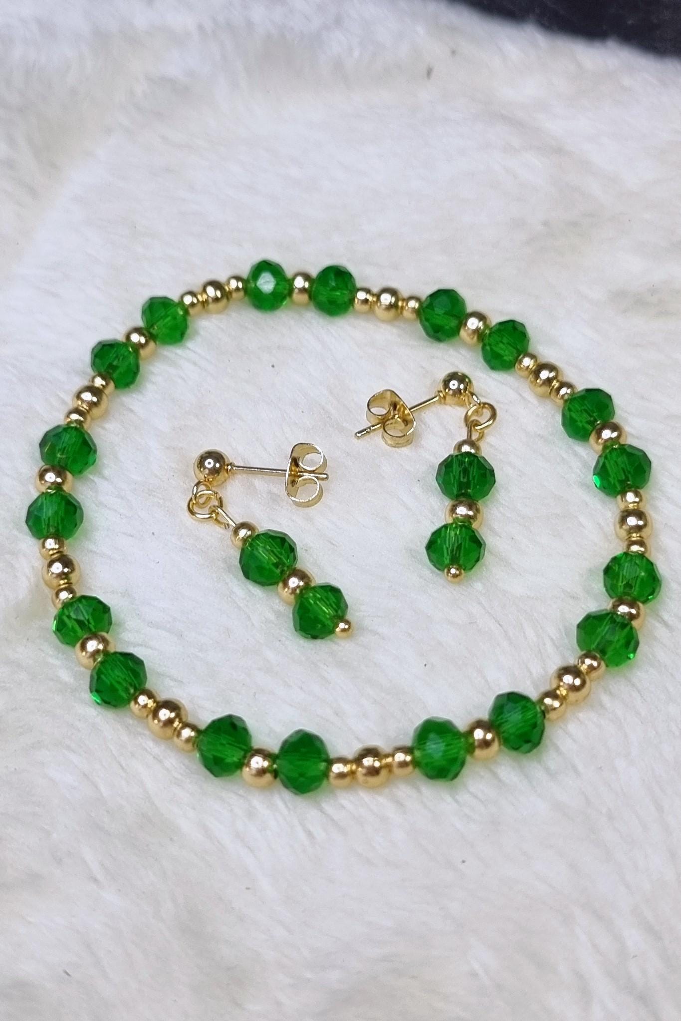 An elegant jewelry set in vibrant green, combined with gold-plated stainless steel for a warm, sophisticated look. The faceted glass beads add a subtle sparkle and harmonize beautifully with the gold-colored stainless steel spacer beads.