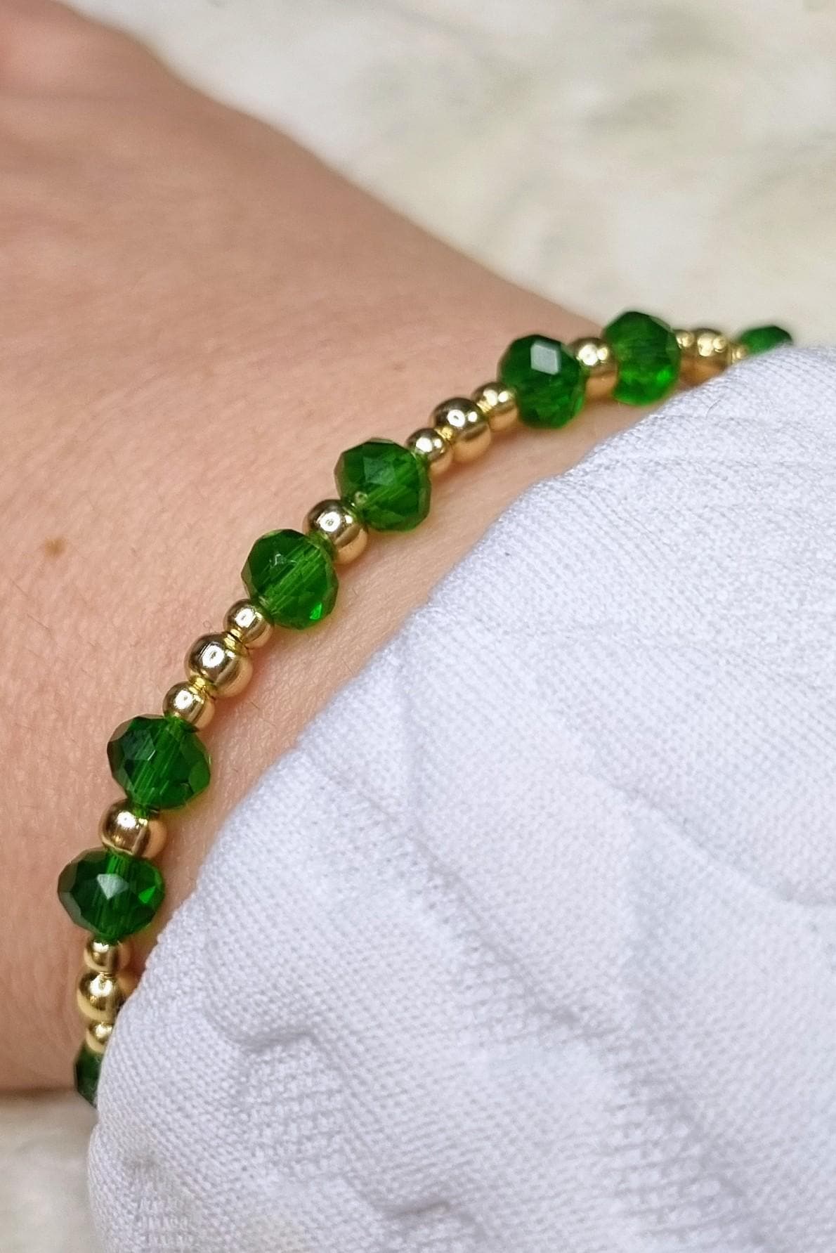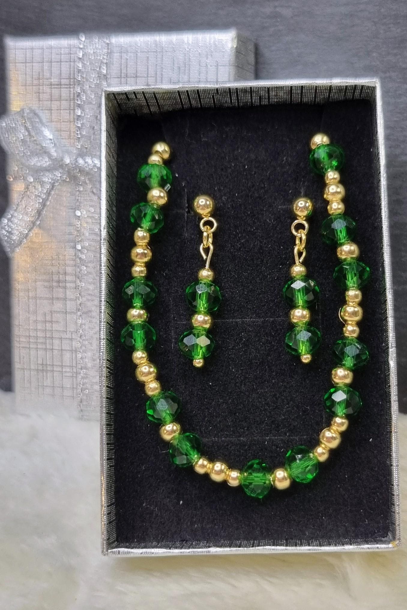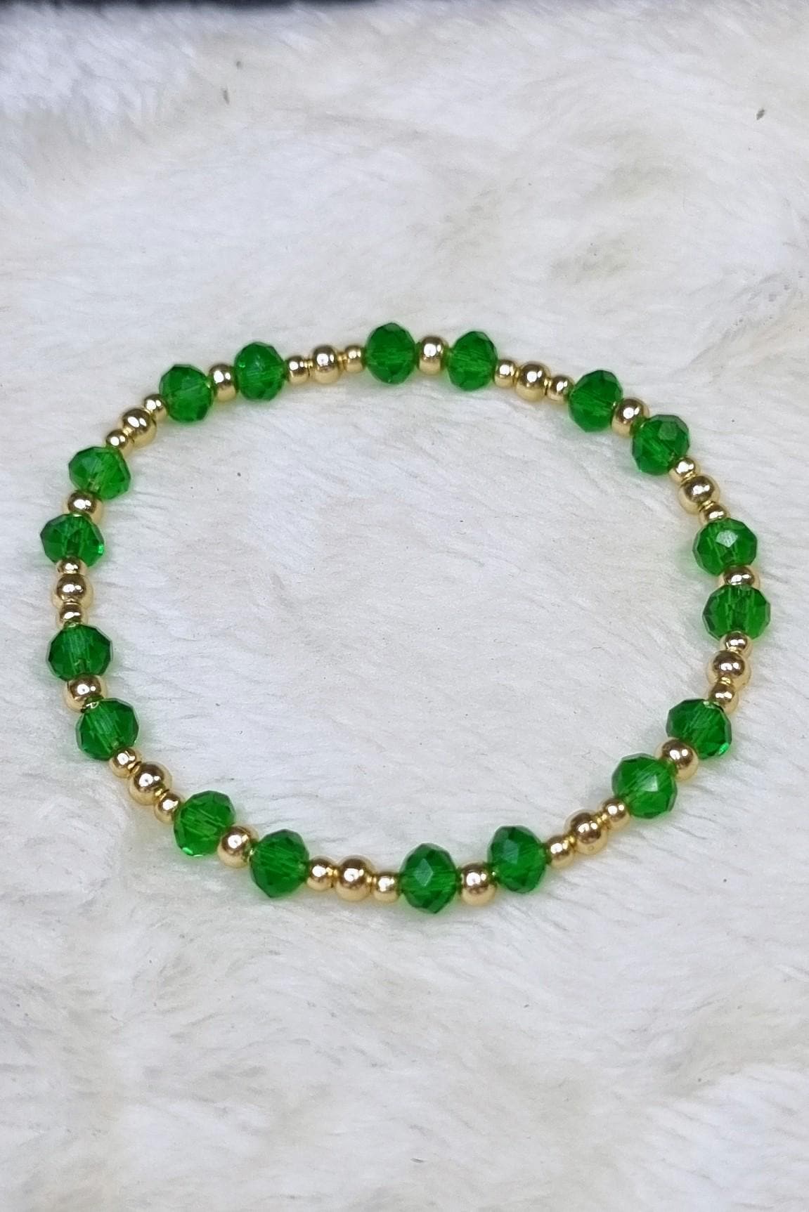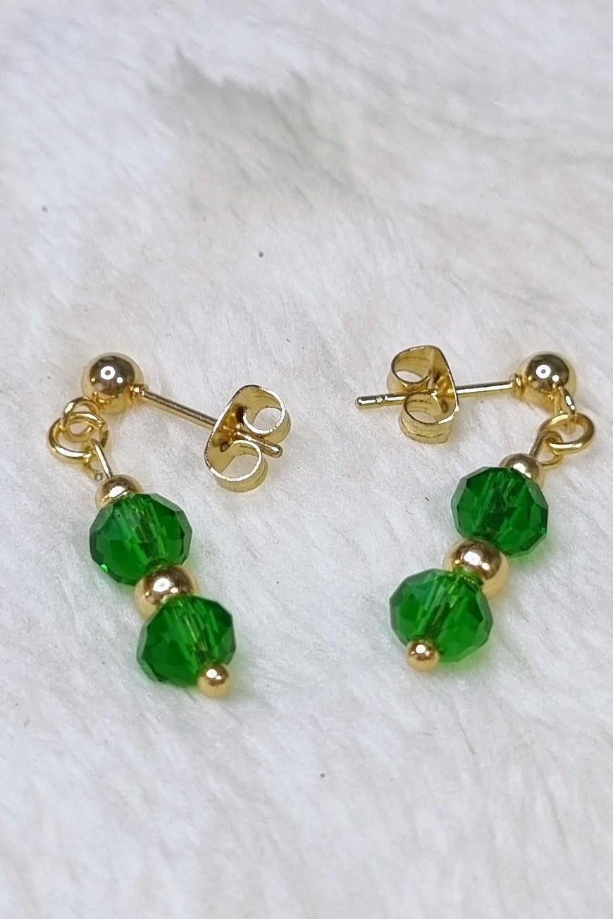 An elegant jewelry set in vibrant green, combined with gold-plated stainless steel for a warm, sophisticated look. The faceted glass beads add a subtle sparkle and harmonize beautifully with the gold-colored stainless steel spacer beads.