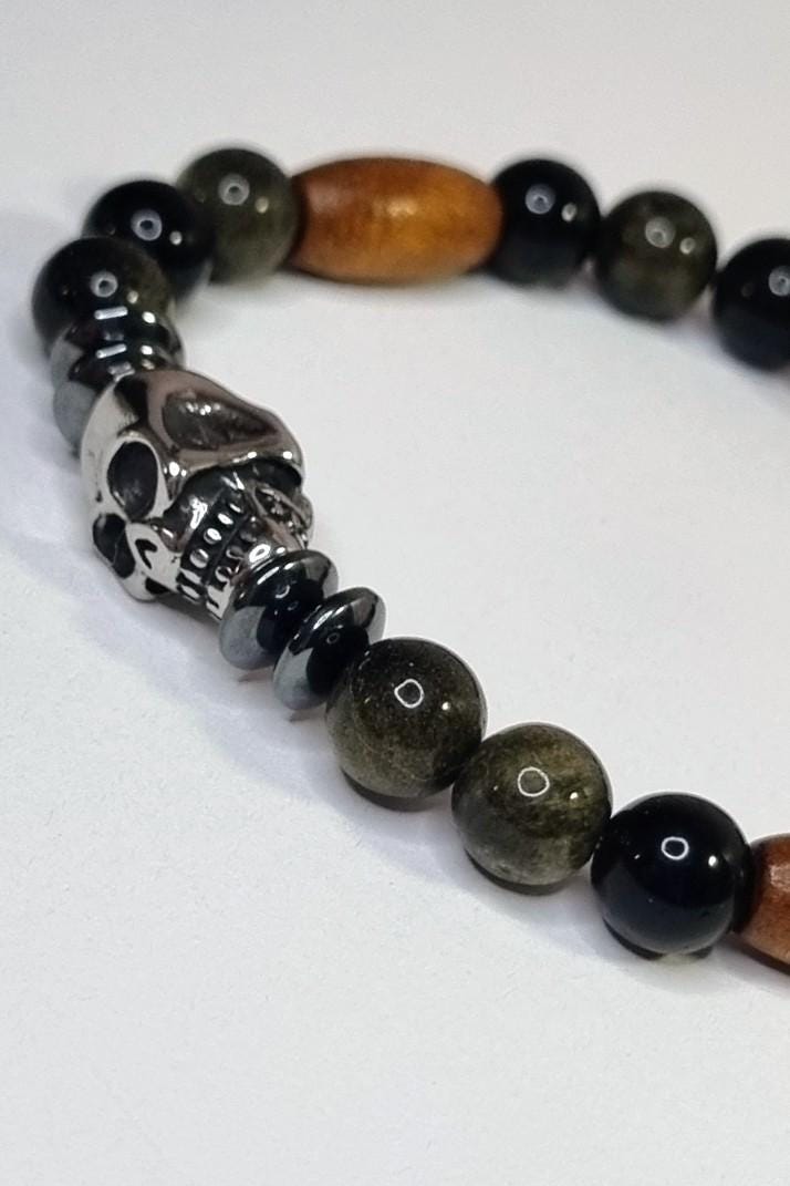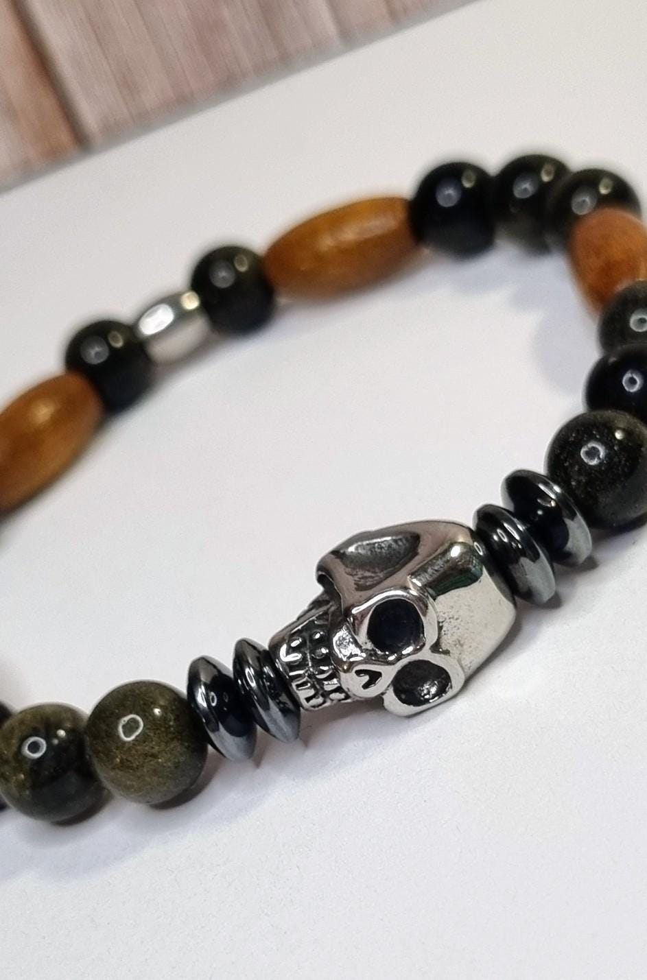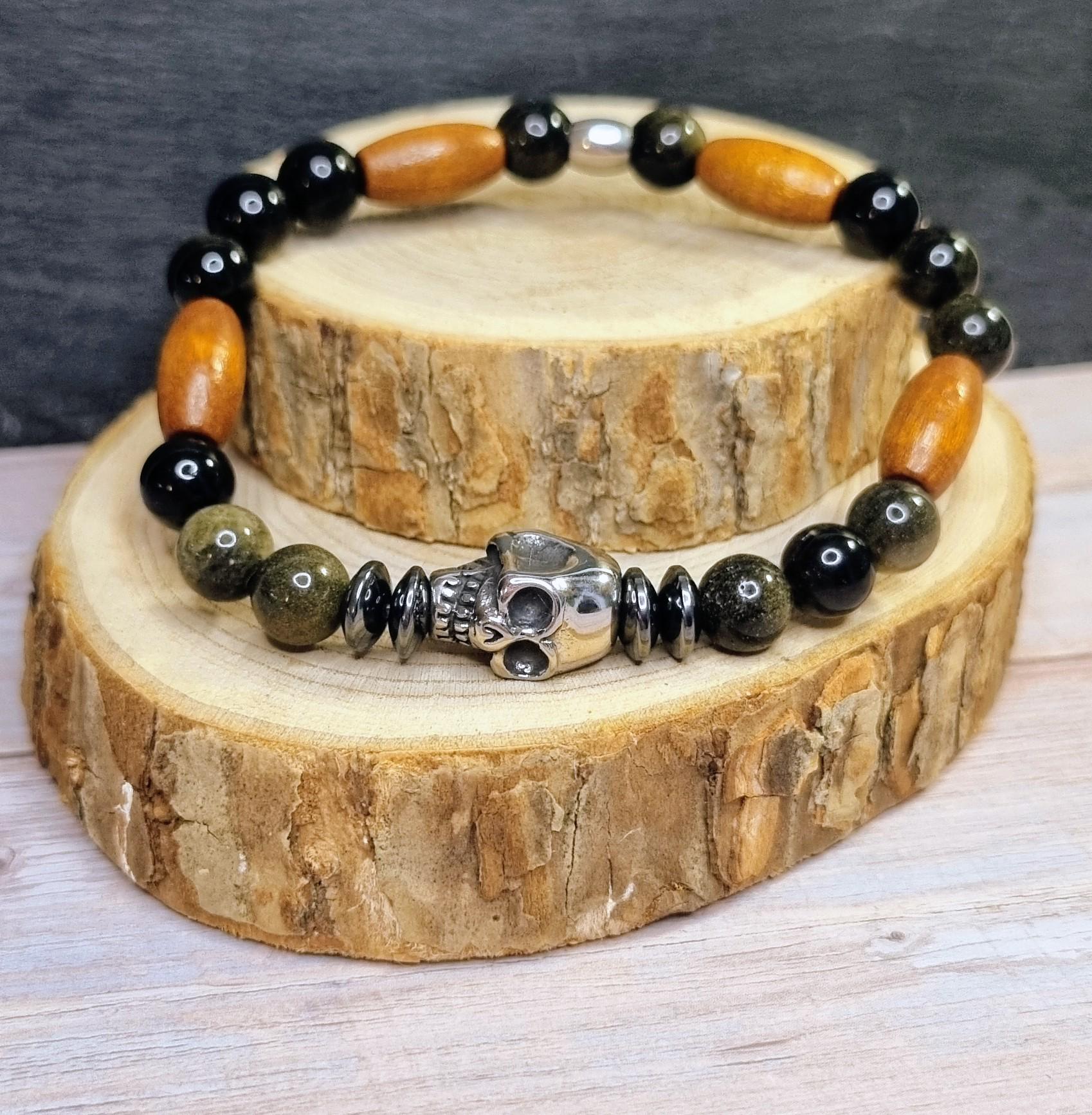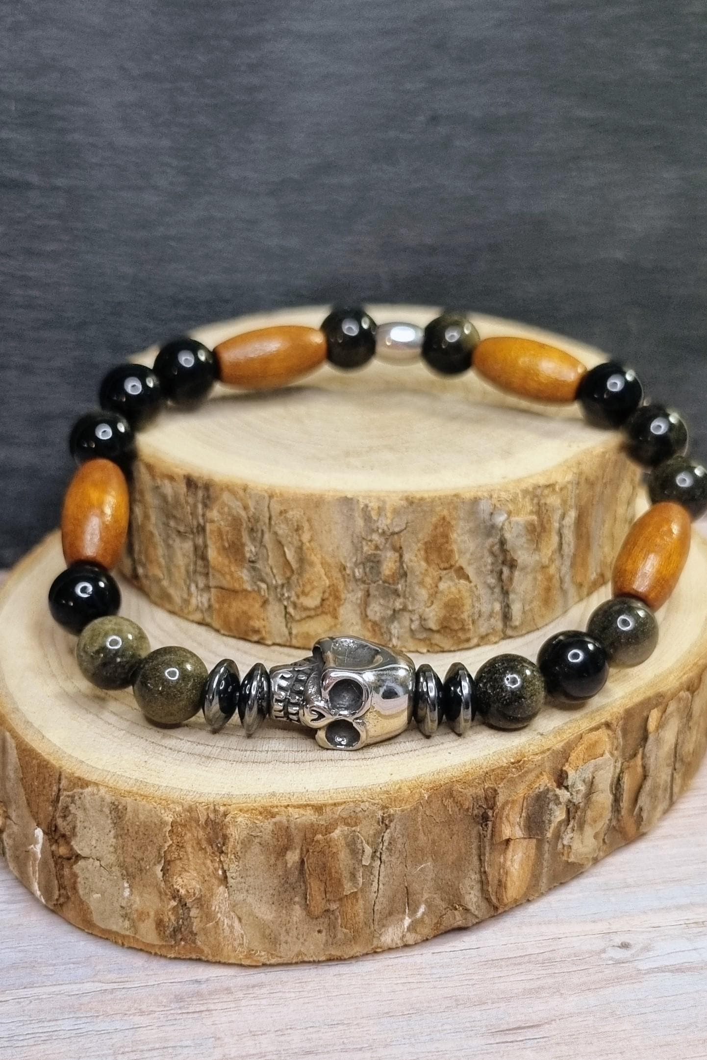 A striking and masculine bracelet made of genuine obsidian beads (8 mm), combined with hematite spacer beads and distinctive oval wooden beads. A stainless steel skull forms the centerpiece, giving the bracelet a strong, edgy look – without appearing cluttered.