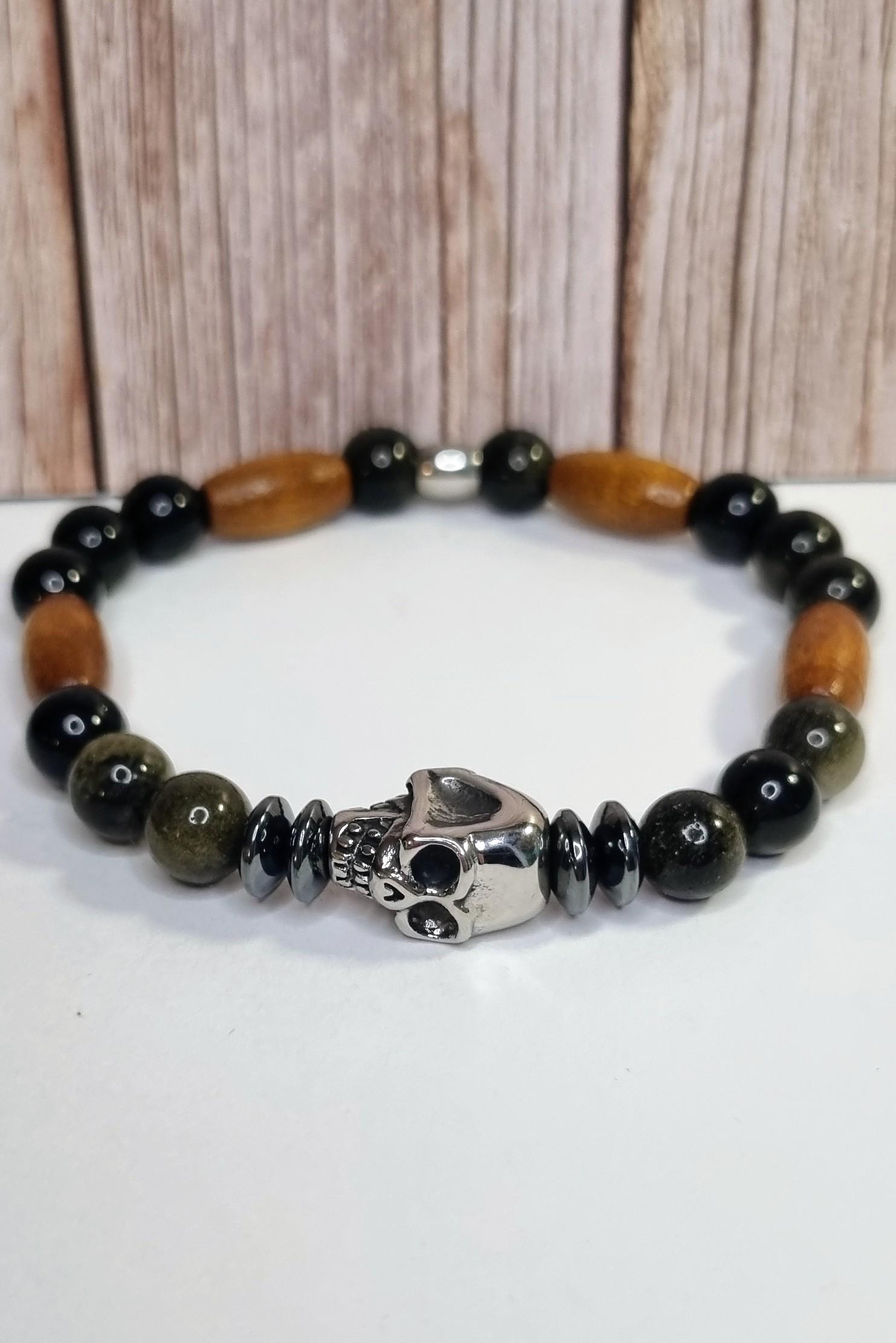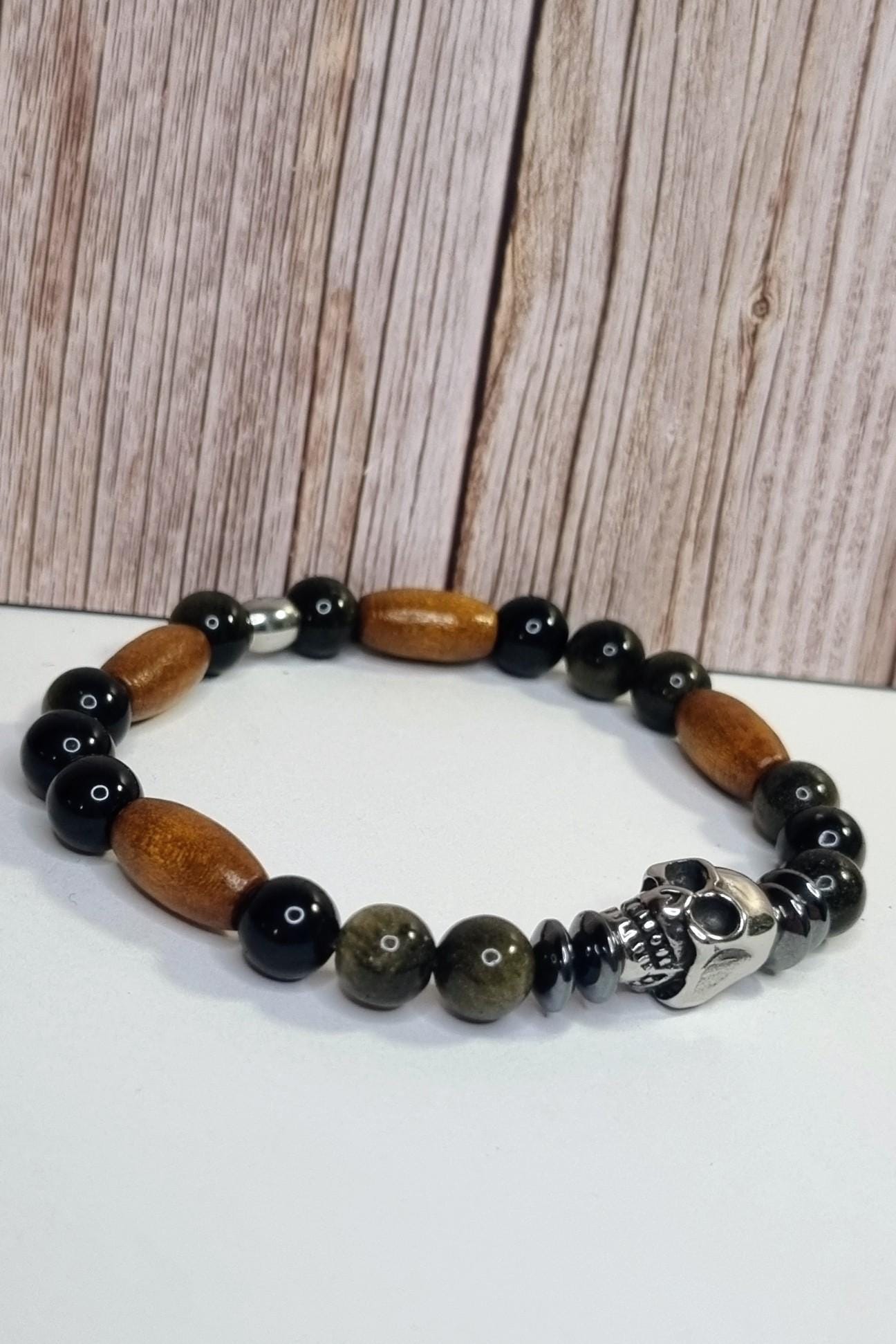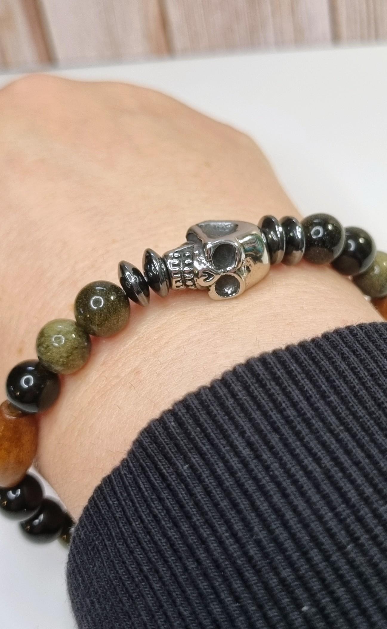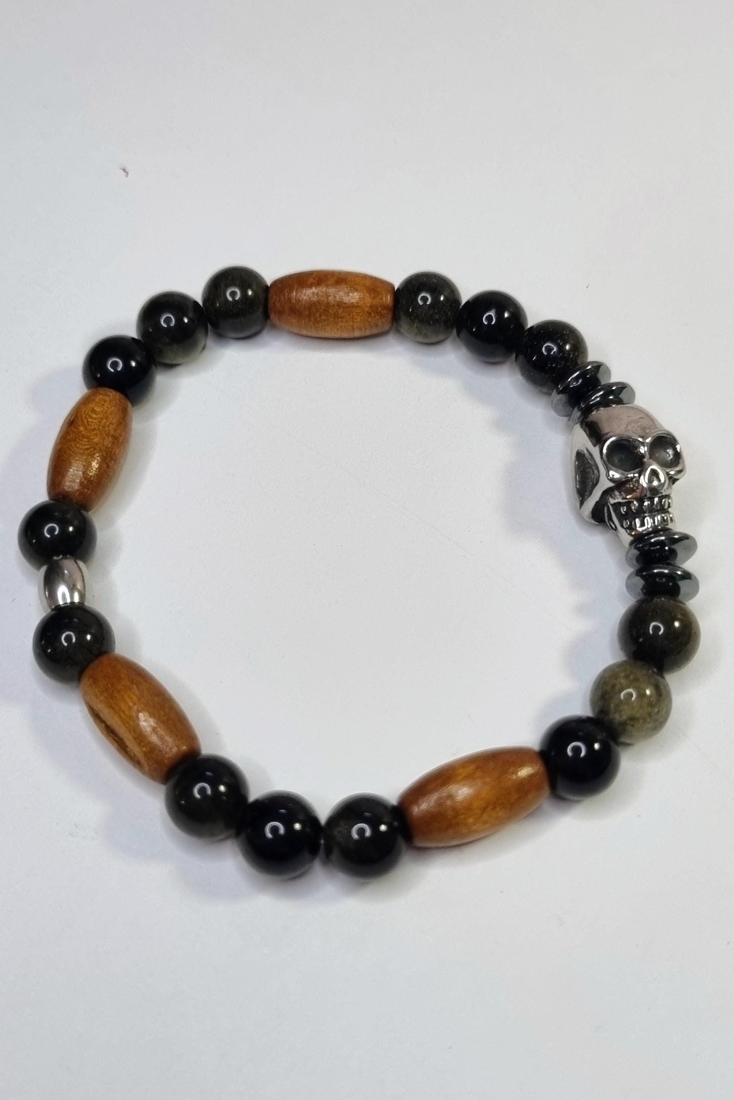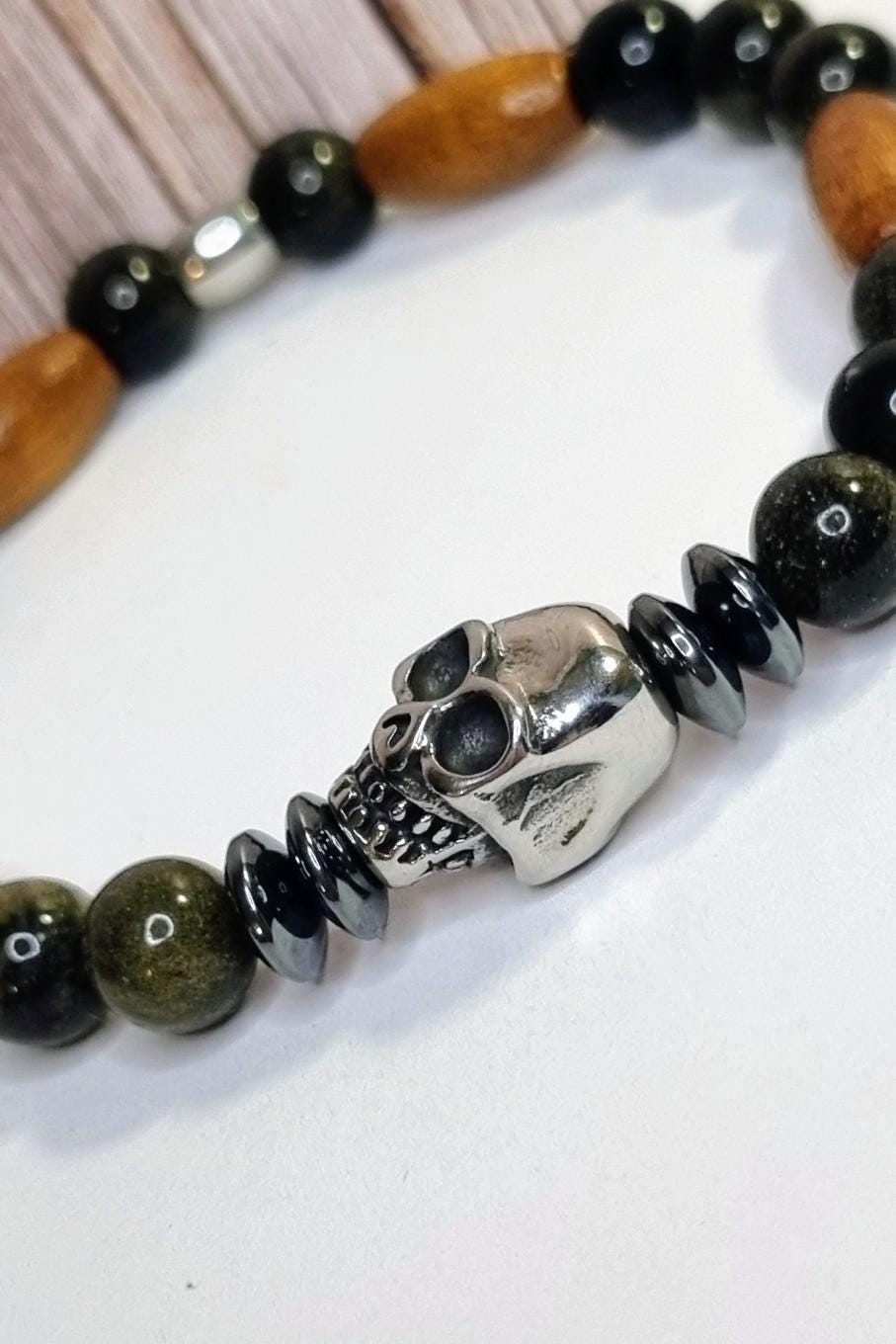 A striking and masculine bracelet made of genuine obsidian beads (8 mm), combined with hematite spacer beads and distinctive oval wooden beads. A stainless steel skull forms the centerpiece, giving the bracelet a strong, edgy look – without appearing cluttered.