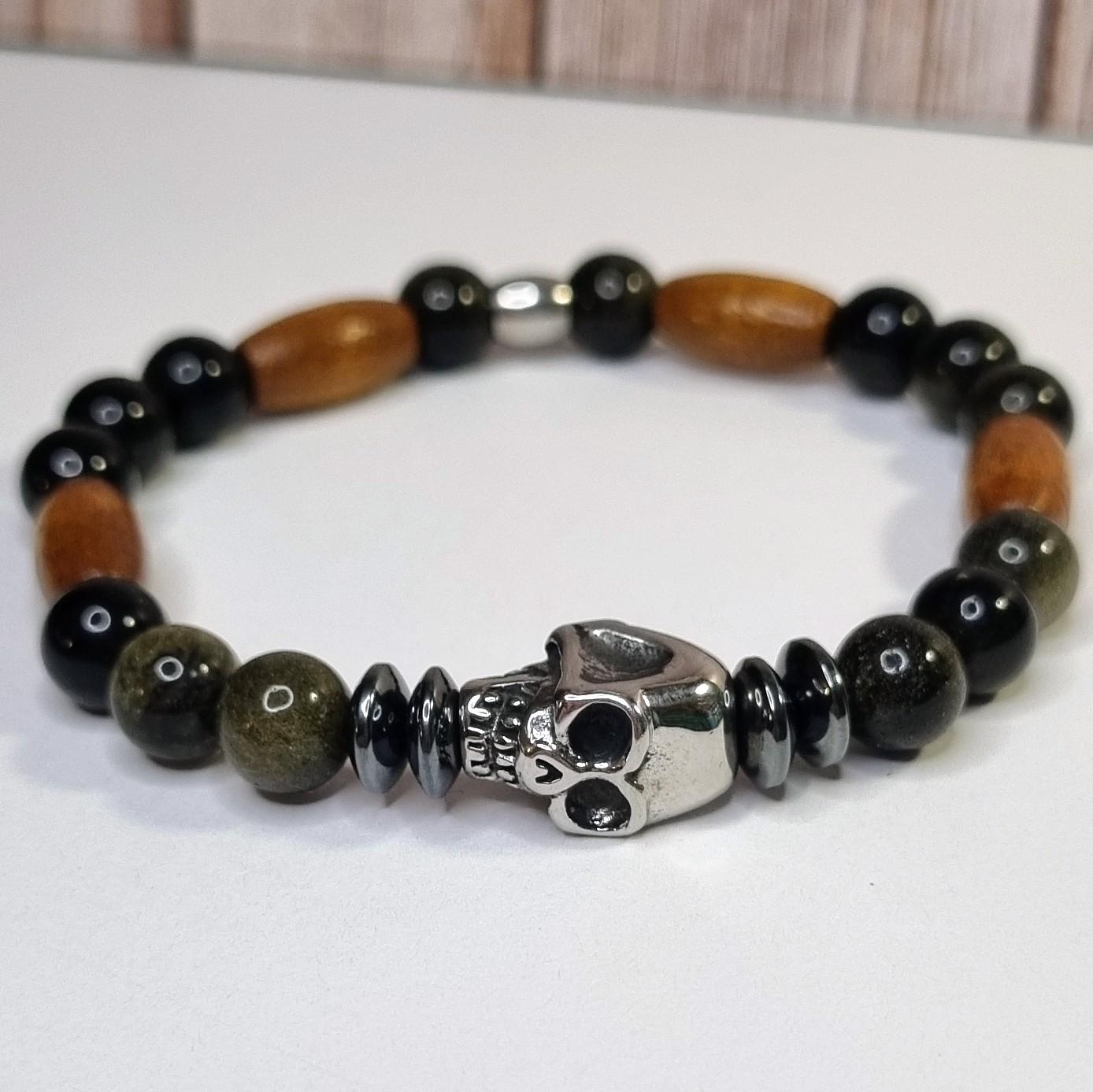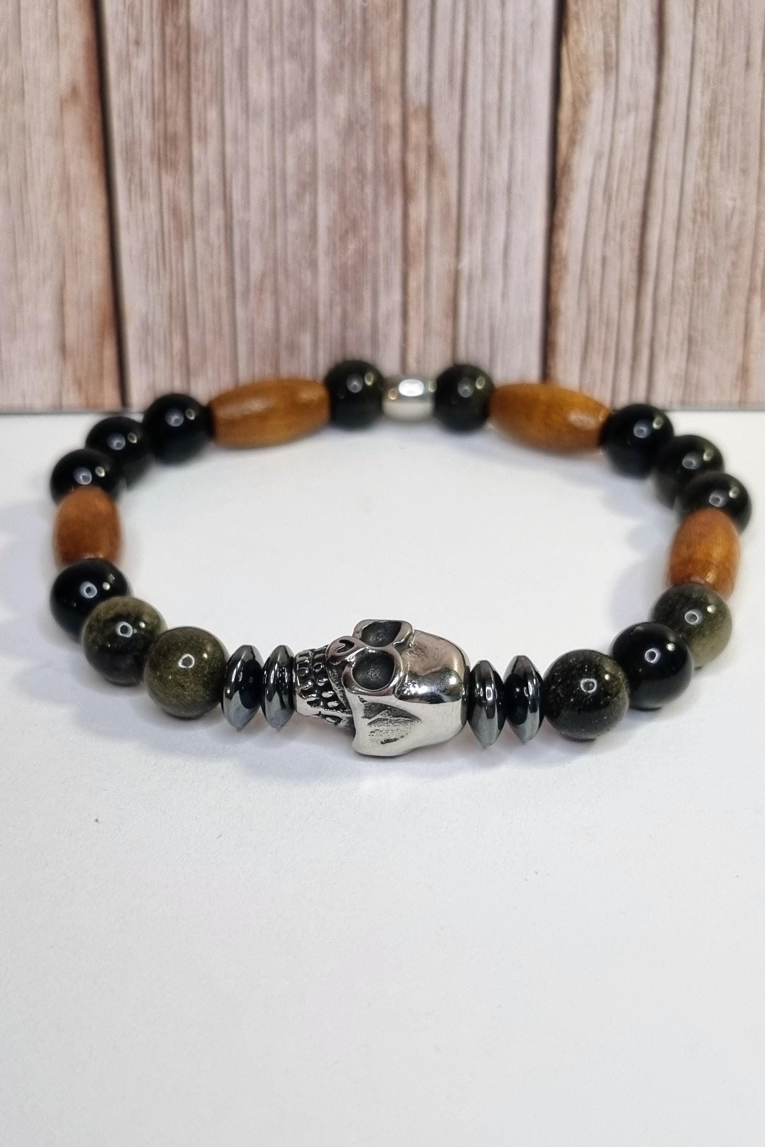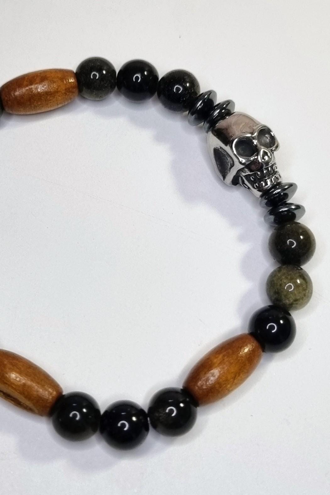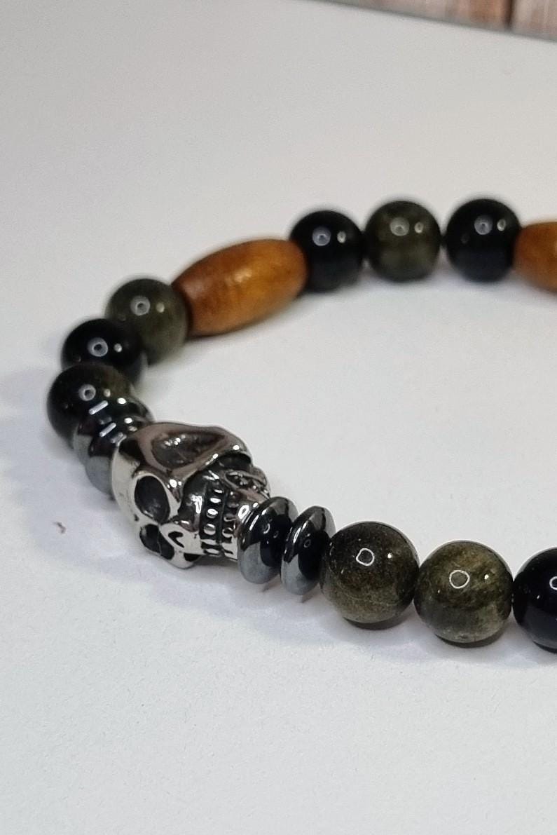 A striking and masculine bracelet made of genuine obsidian beads (8 mm), combined with hematite spacer beads and distinctive oval wooden beads. A stainless steel skull forms the centerpiece, giving the bracelet a strong, edgy look – without appearing cluttered.