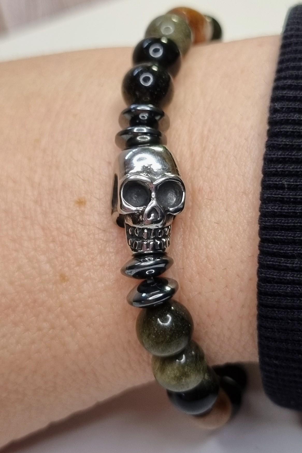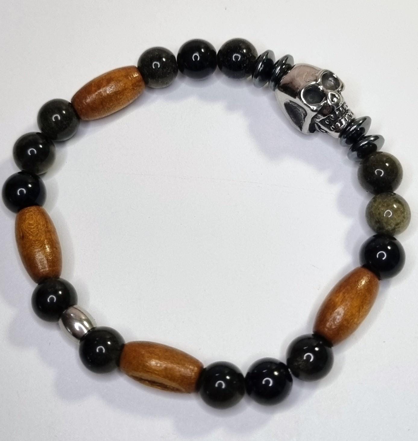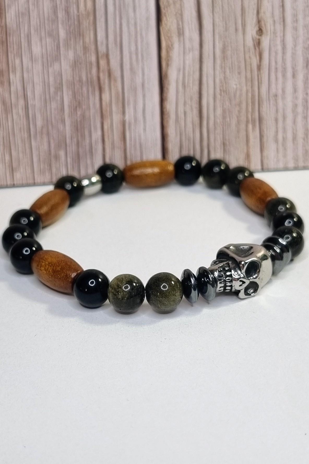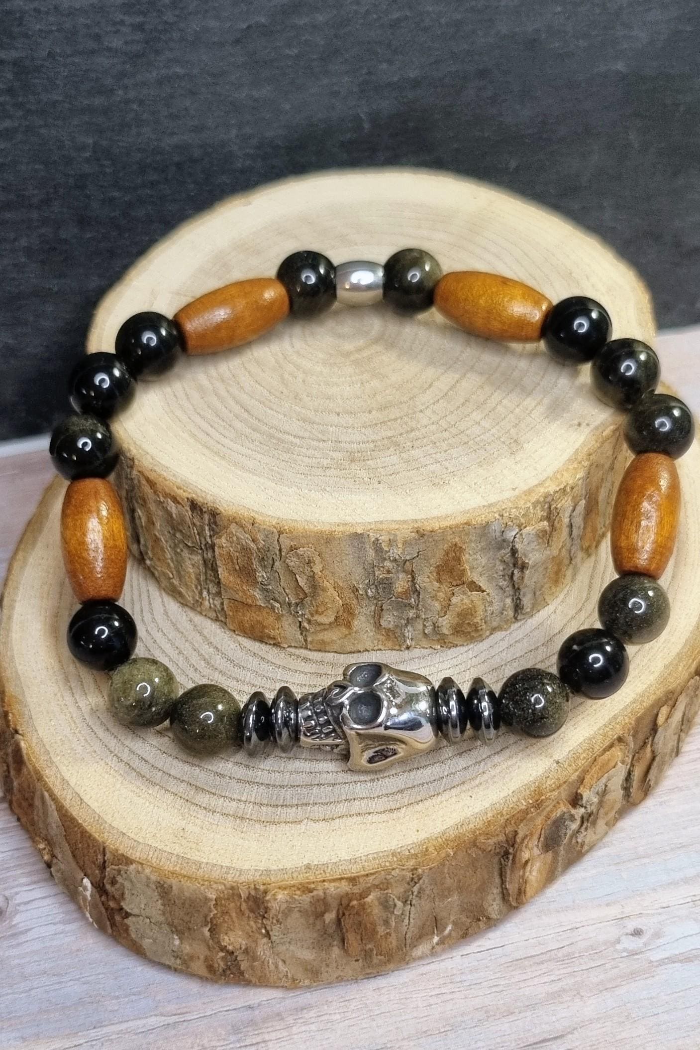 A striking and masculine bracelet made of genuine obsidian beads (8 mm), combined with hematite spacer beads and distinctive oval wooden beads. A stainless steel skull forms the centerpiece, giving the bracelet a strong, edgy look – without appearing cluttered.