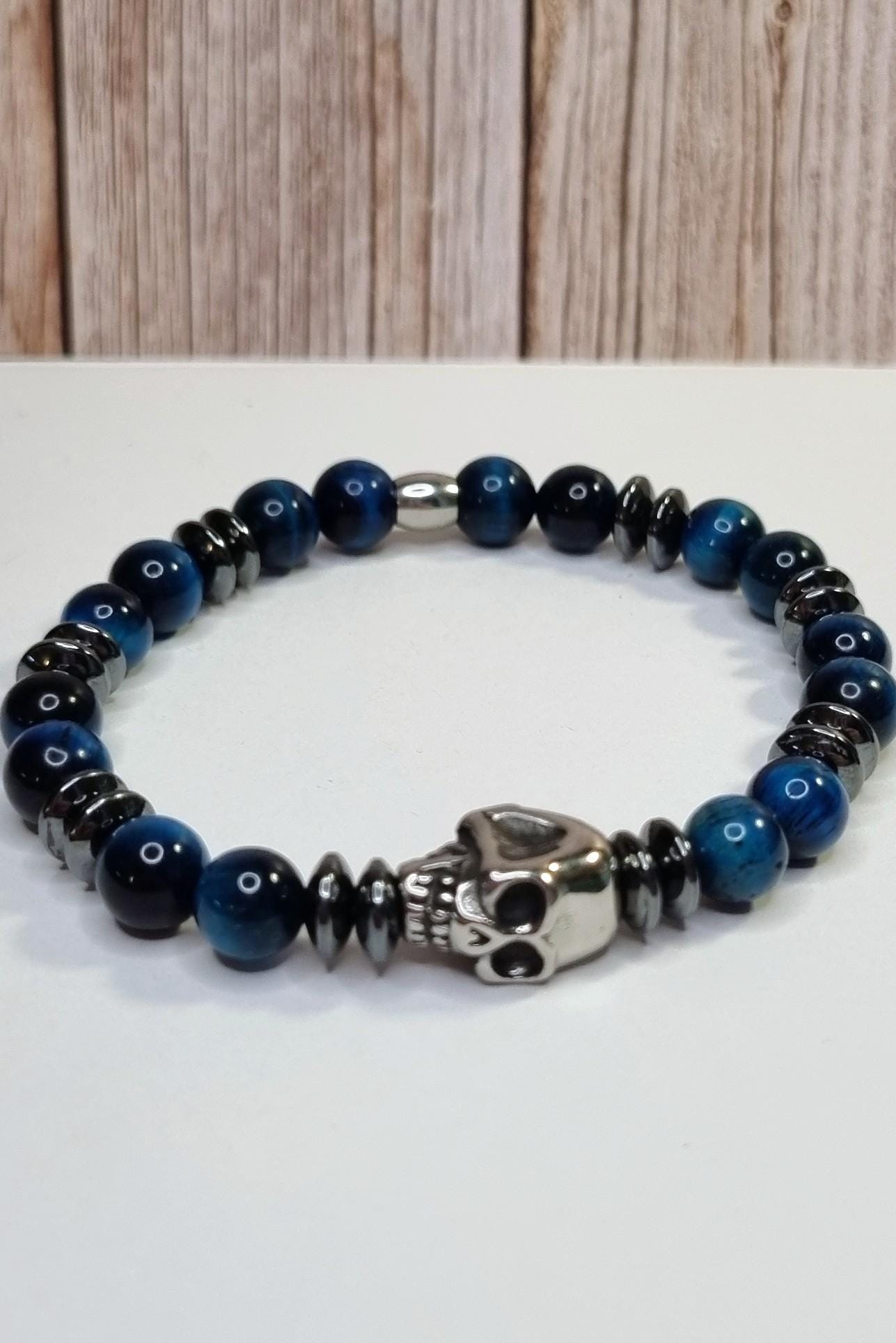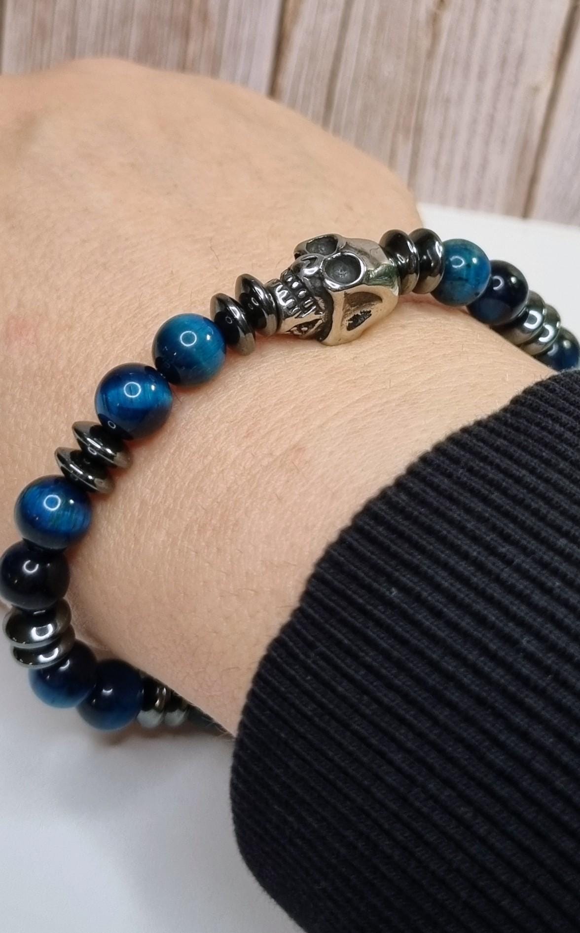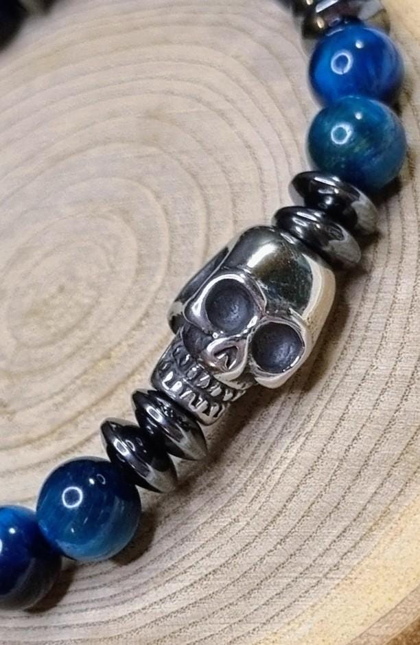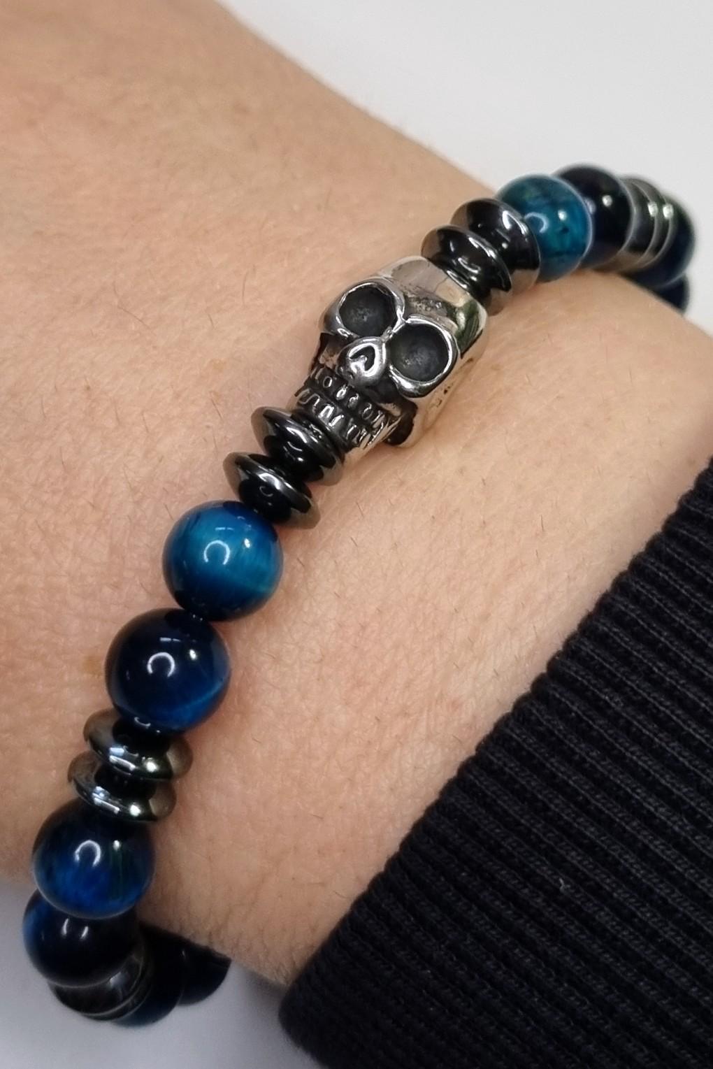 An exceptional men's bracelet made of blue tiger's eye (8 mm), combined with hematite spacer beads and a detailed stainless steel skull. The tiger's eye's unique coloring displays impressive depth and reflections in blue and dark tones – a true eye-catcher.