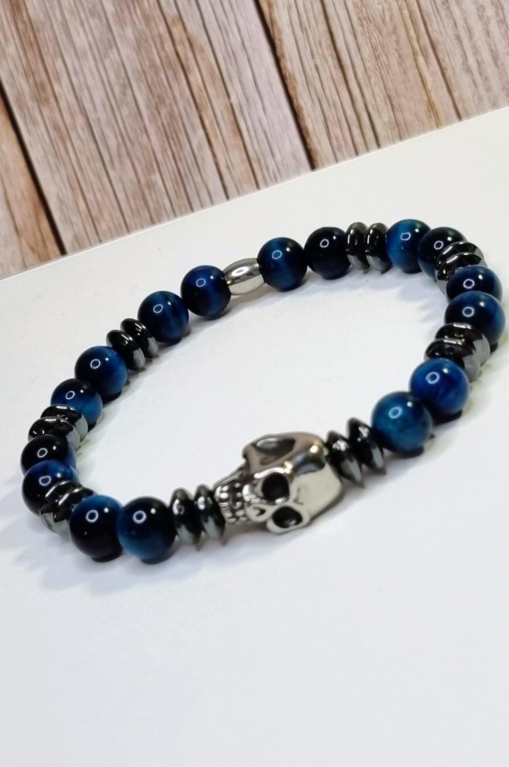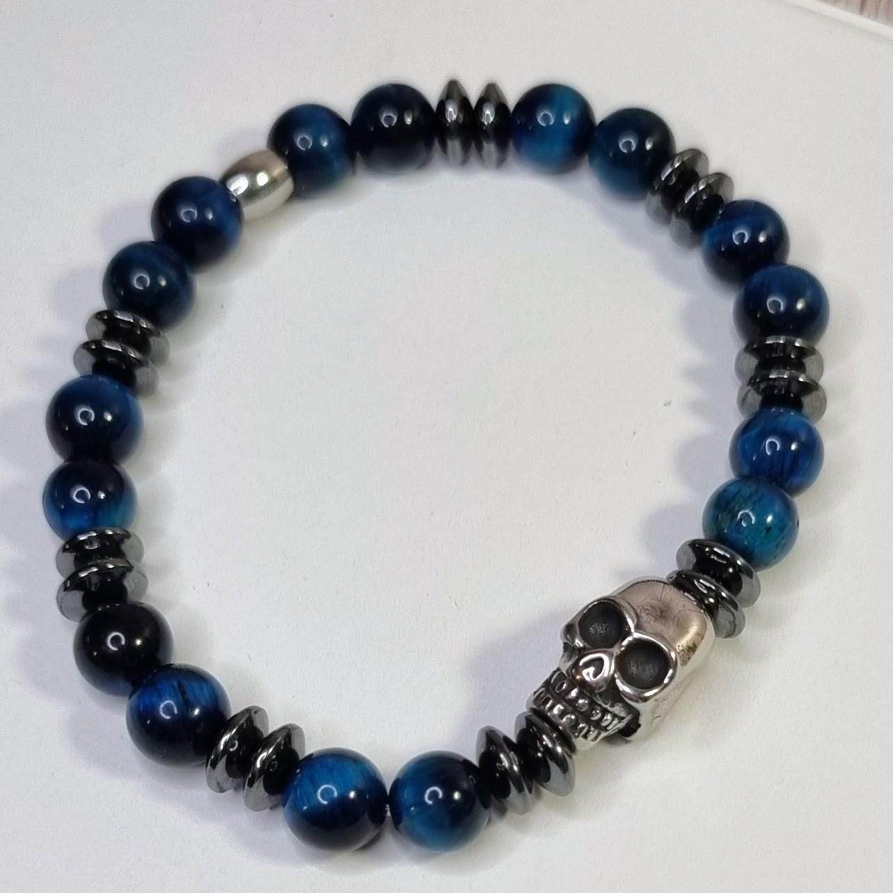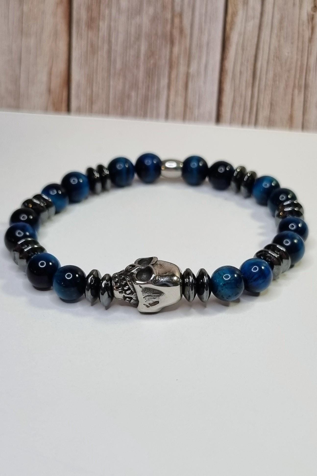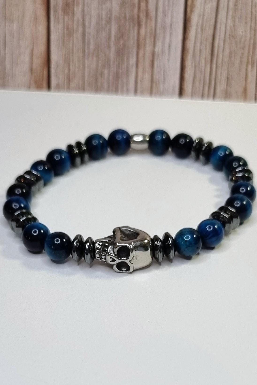 An exceptional men's bracelet made of blue tiger's eye (8 mm), combined with hematite spacer beads and a detailed stainless steel skull. The tiger's eye's unique coloring displays impressive depth and reflections in blue and dark tones – a true eye-catcher.