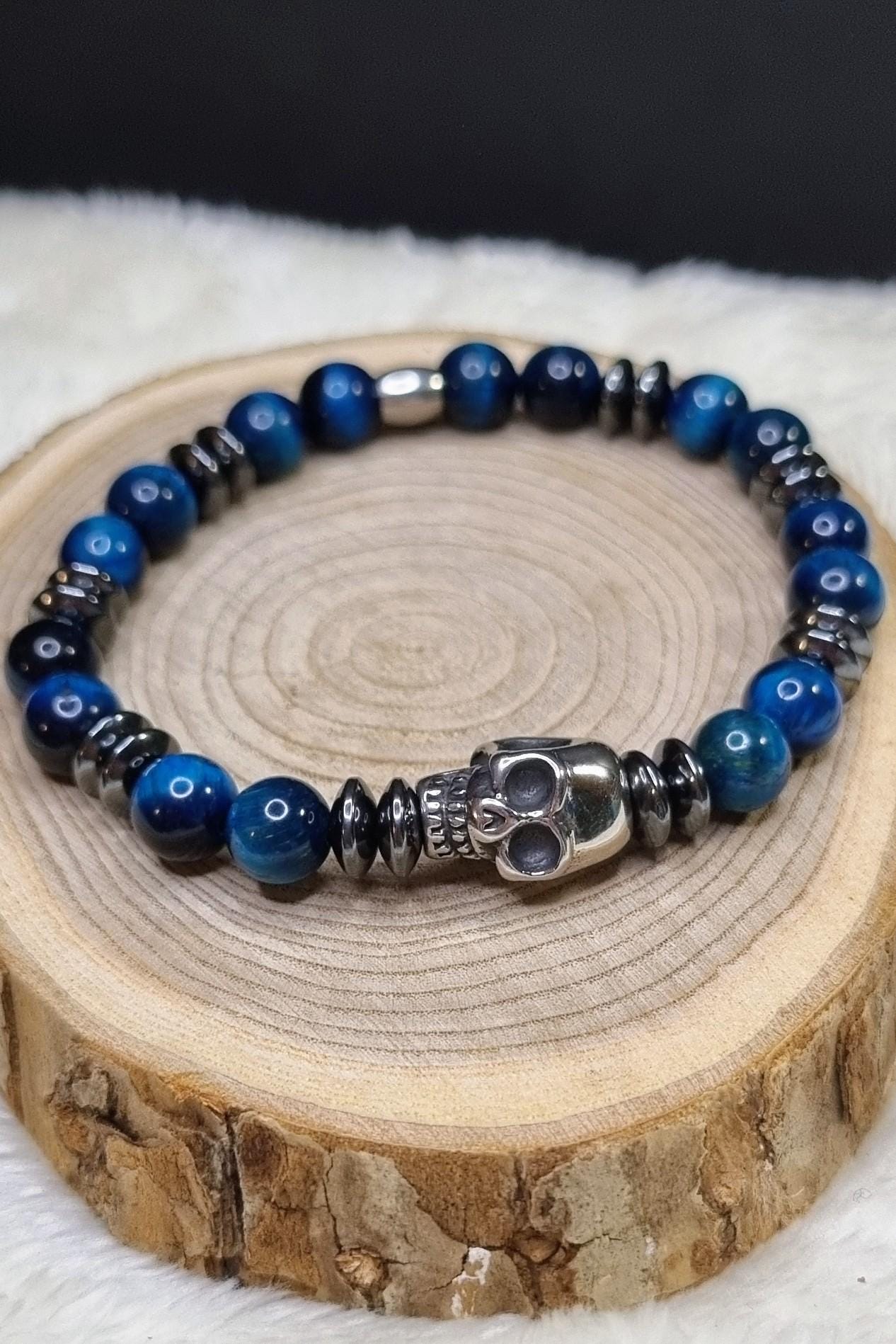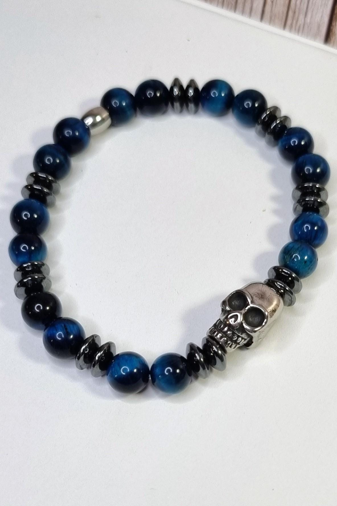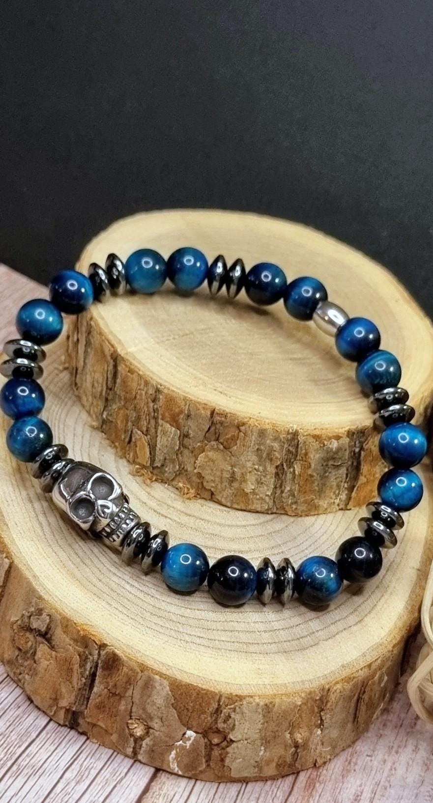 An exceptional men's bracelet made of blue tiger's eye (8 mm), combined with hematite spacer beads and a detailed stainless steel skull. The tiger's eye's unique coloring displays impressive depth and reflections in blue and dark tones – a true eye-catcher.