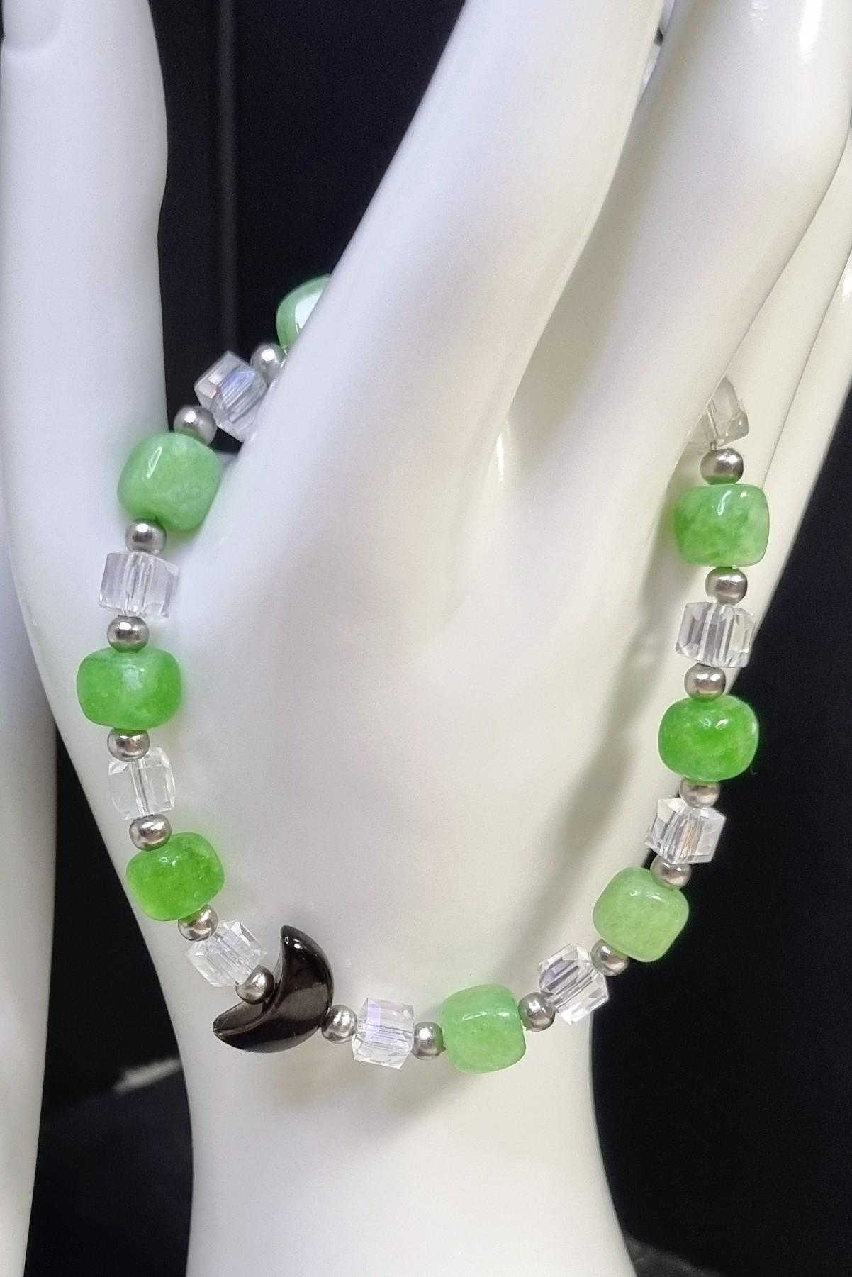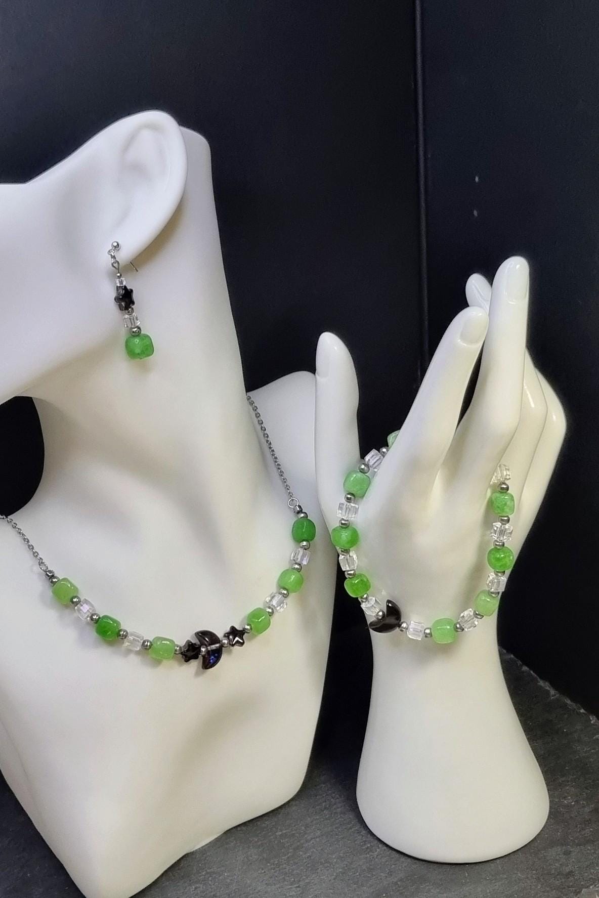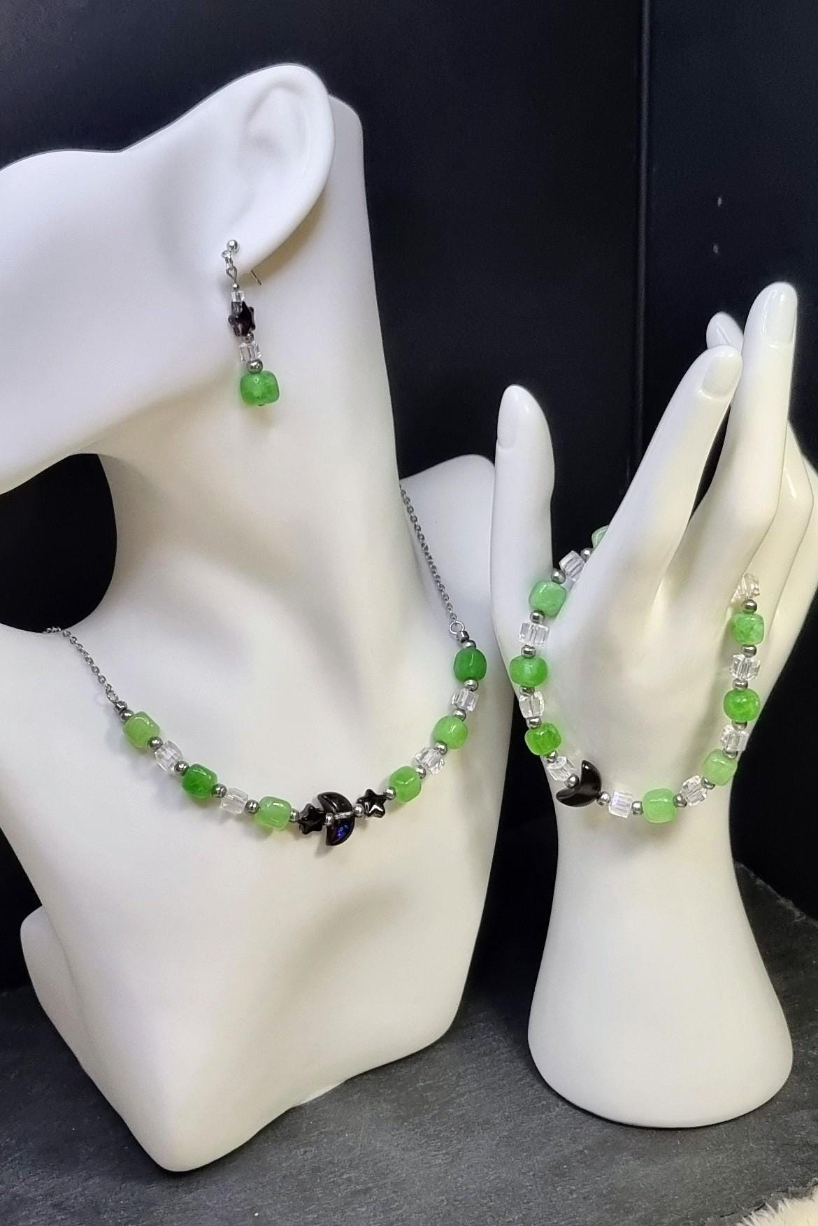 This handcrafted jewelry set made of peridot, stainless steel and crystal glass represents lightness, freshness and new energy.