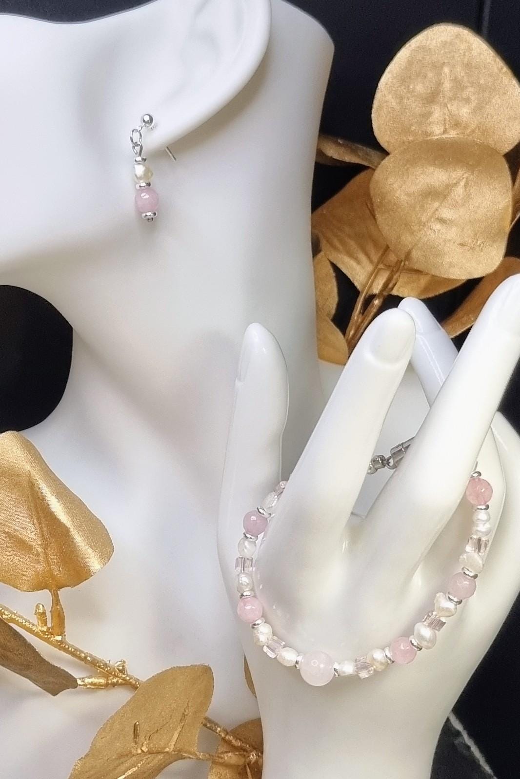 Rose quartz symbolizes love, harmony and self-care, while the irregular structure of freshwater pearls gives each piece of jewelry an individual touch.