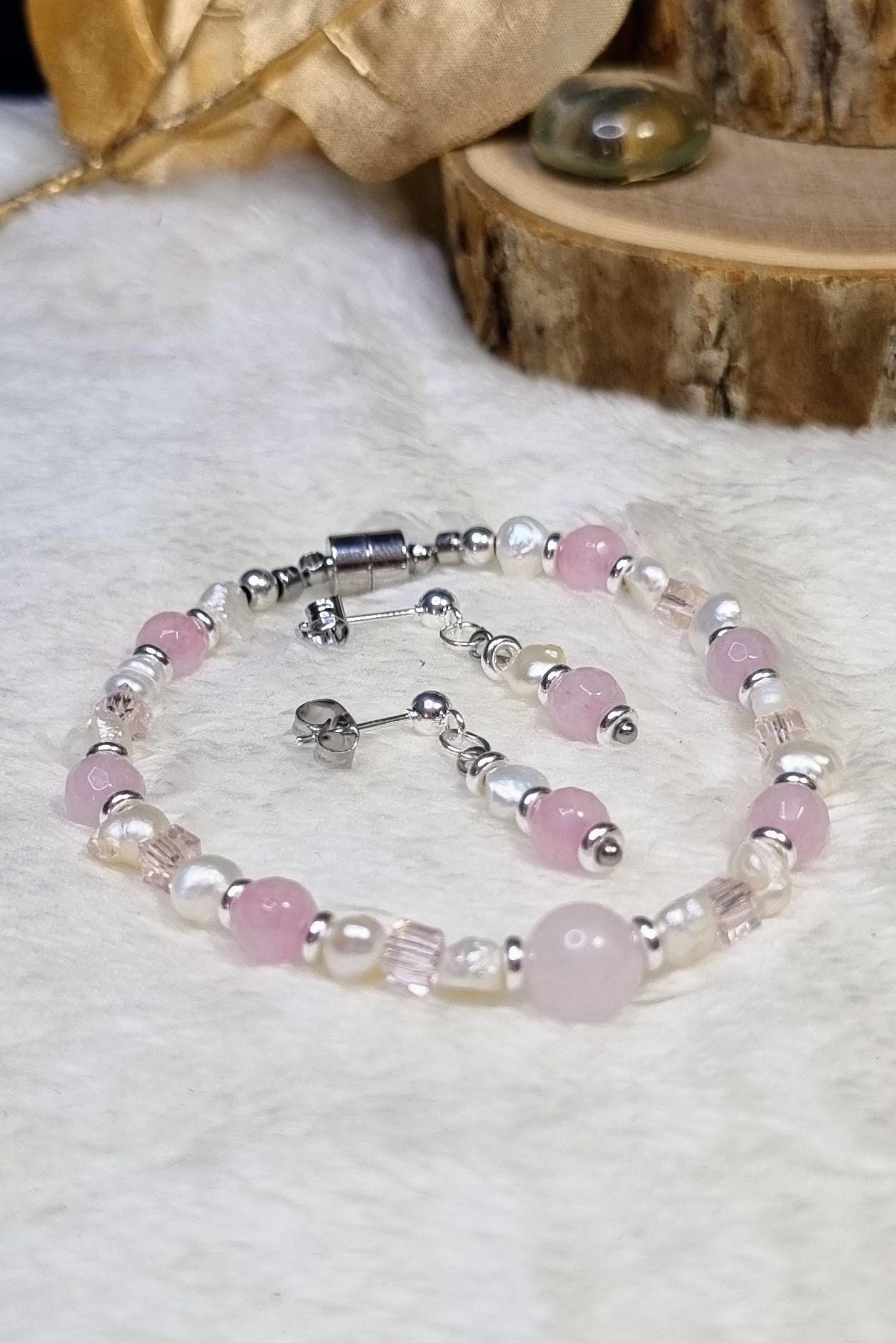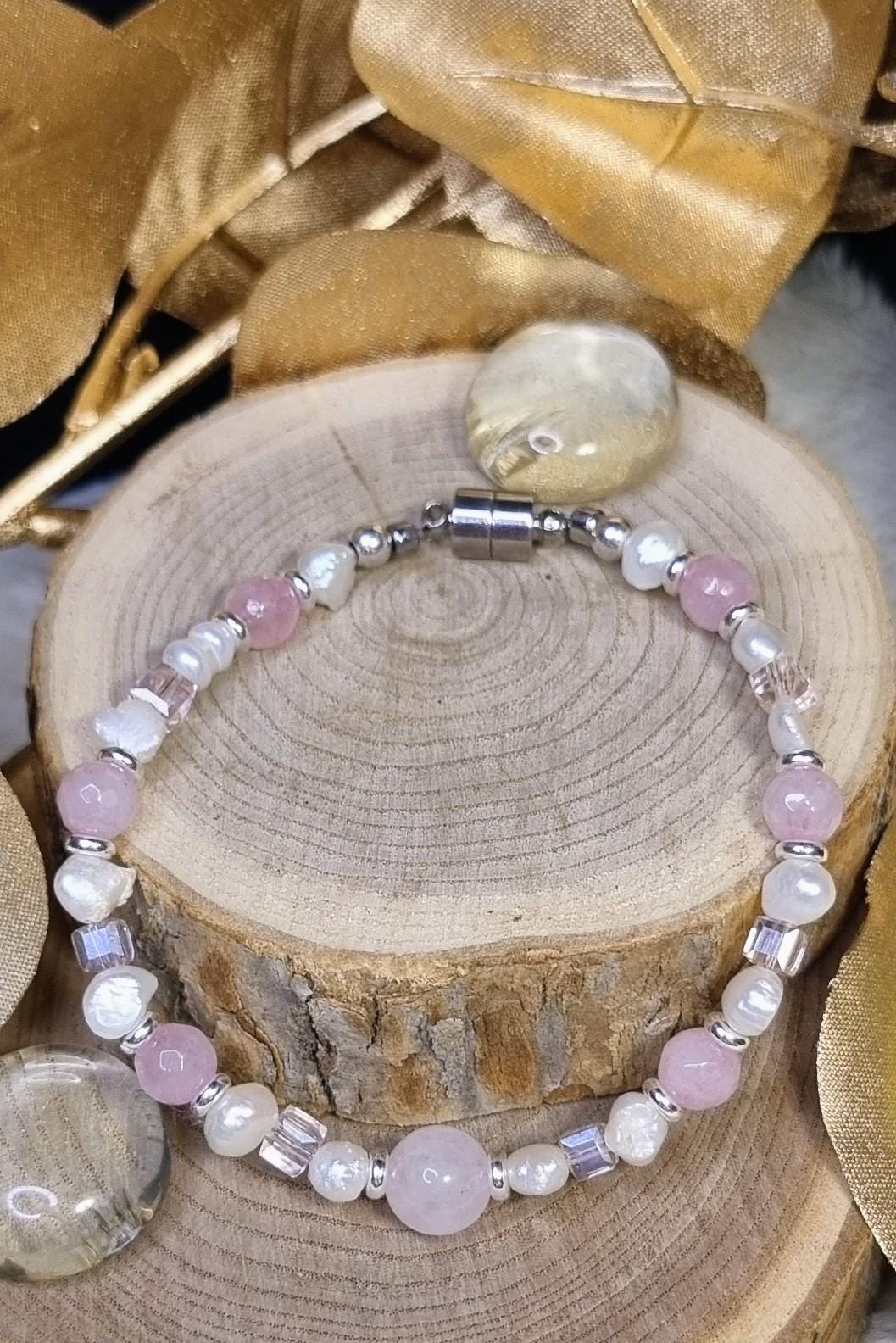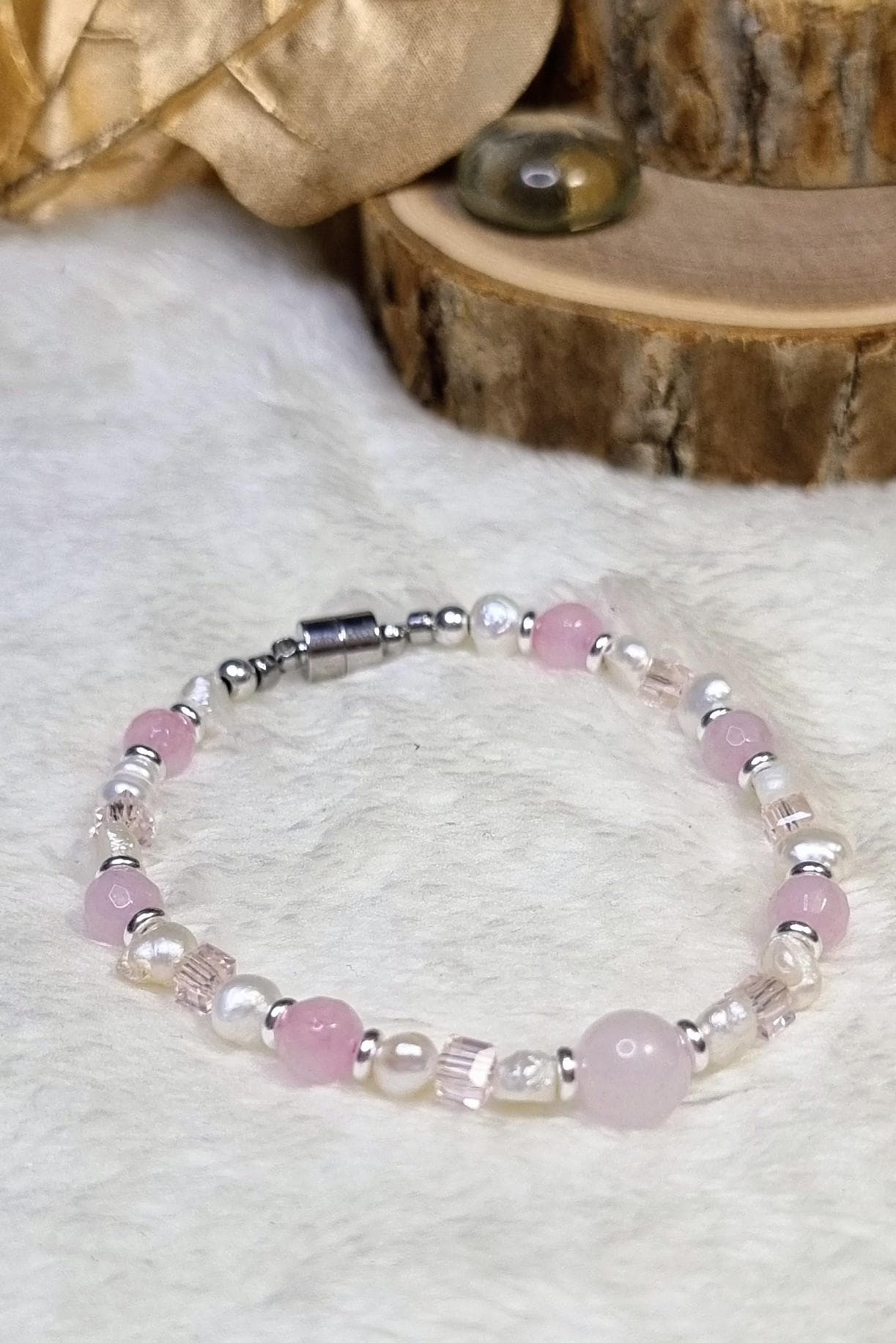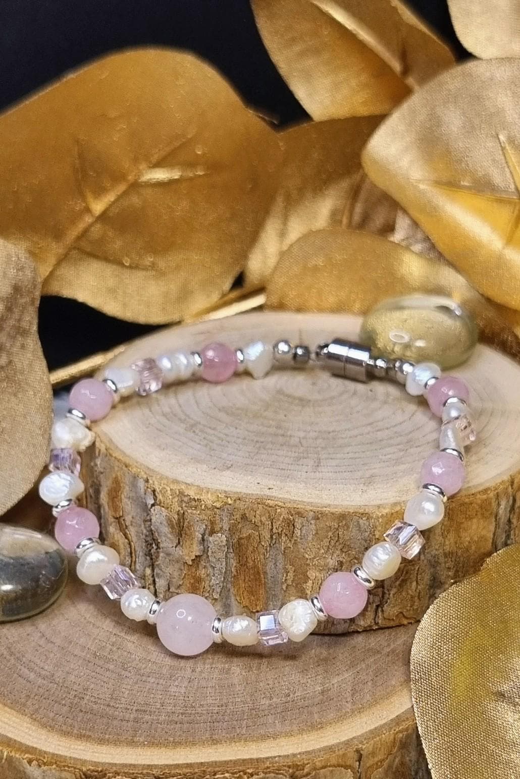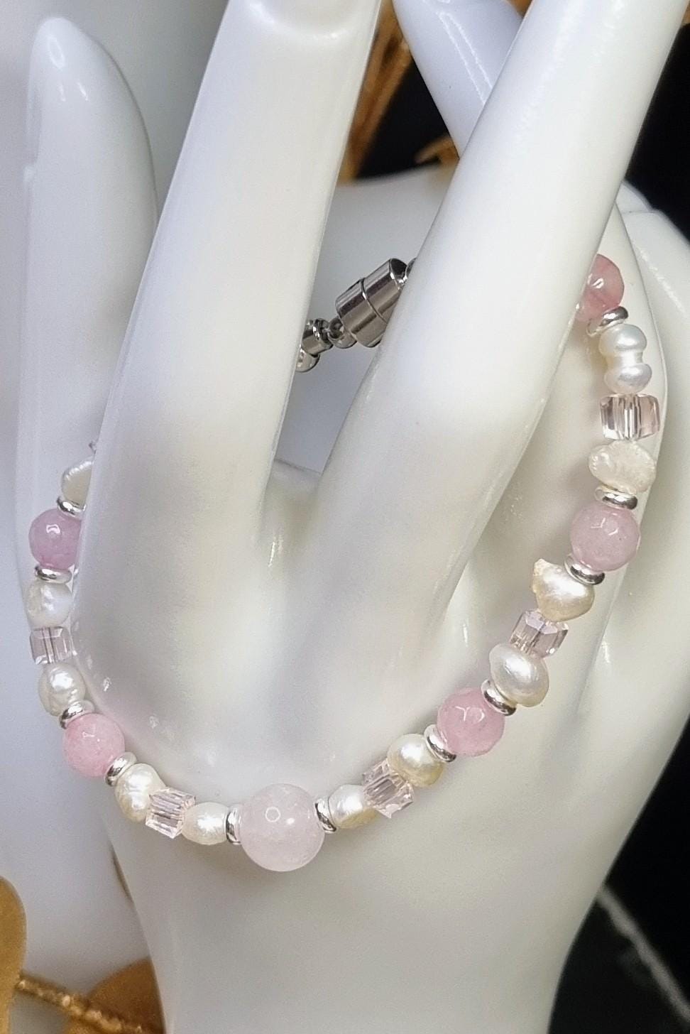 This handcrafted bracelet combines the gentle radiance of rose quartz with the natural elegance of freshwater pearls and sparkling crystal glass beads.