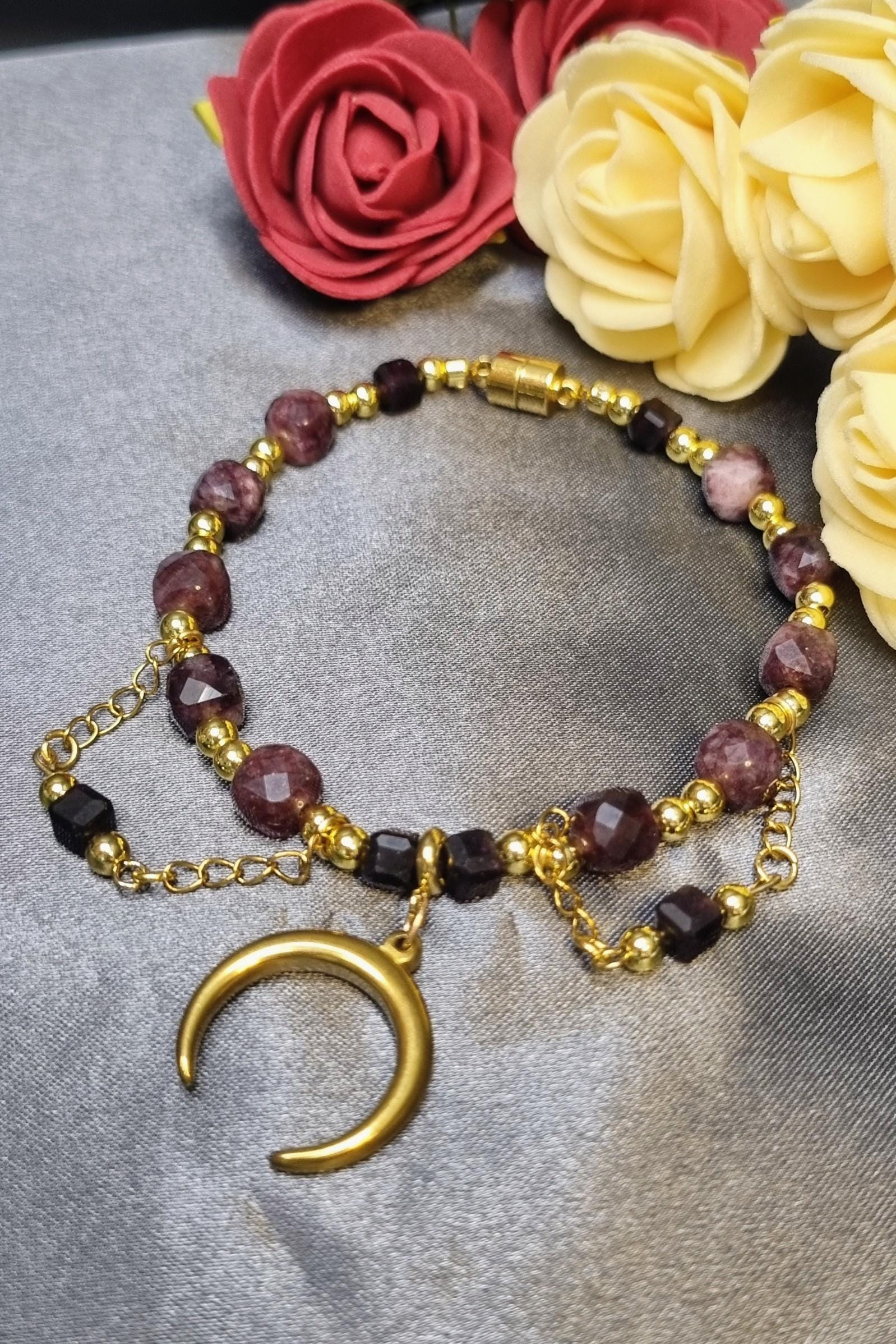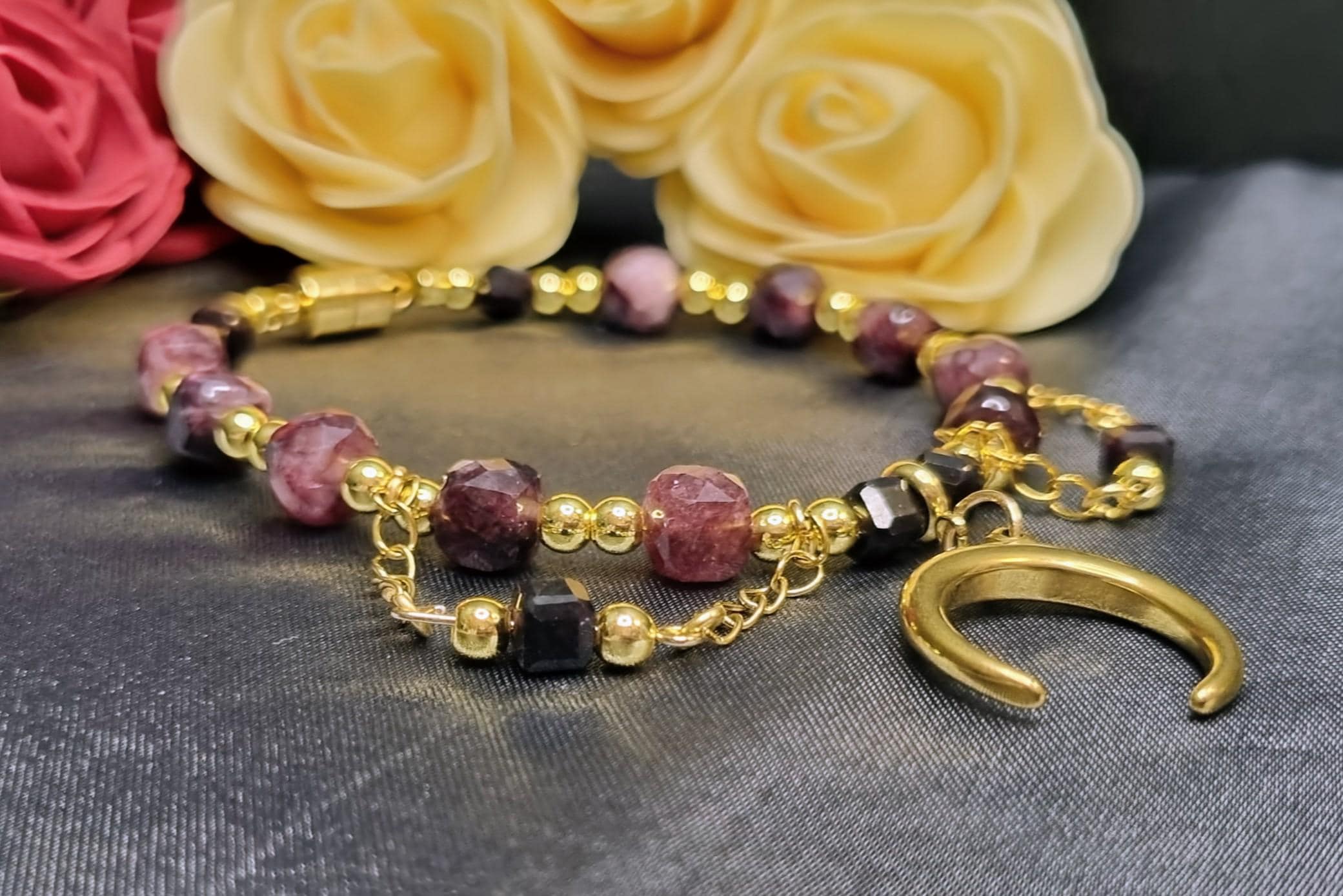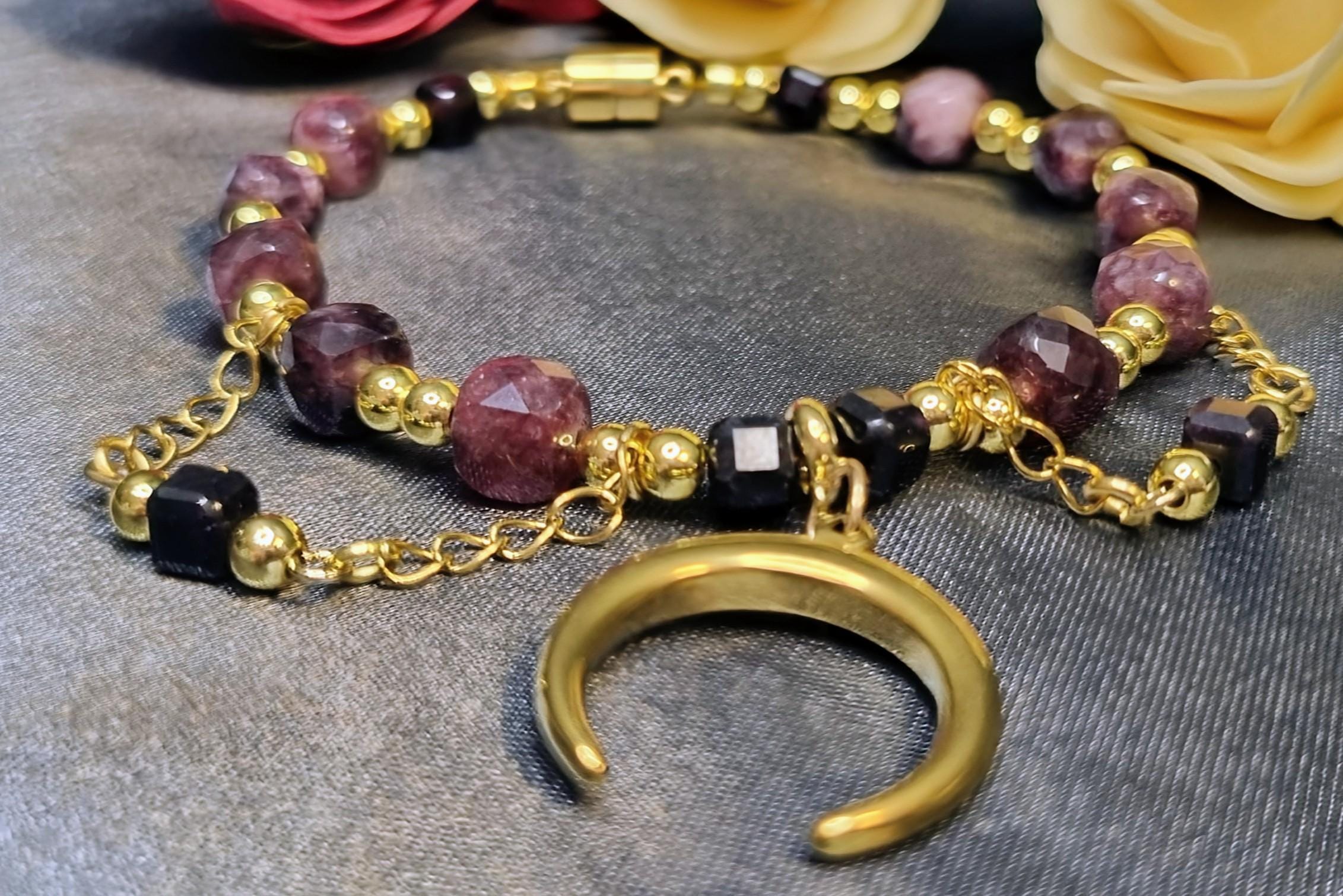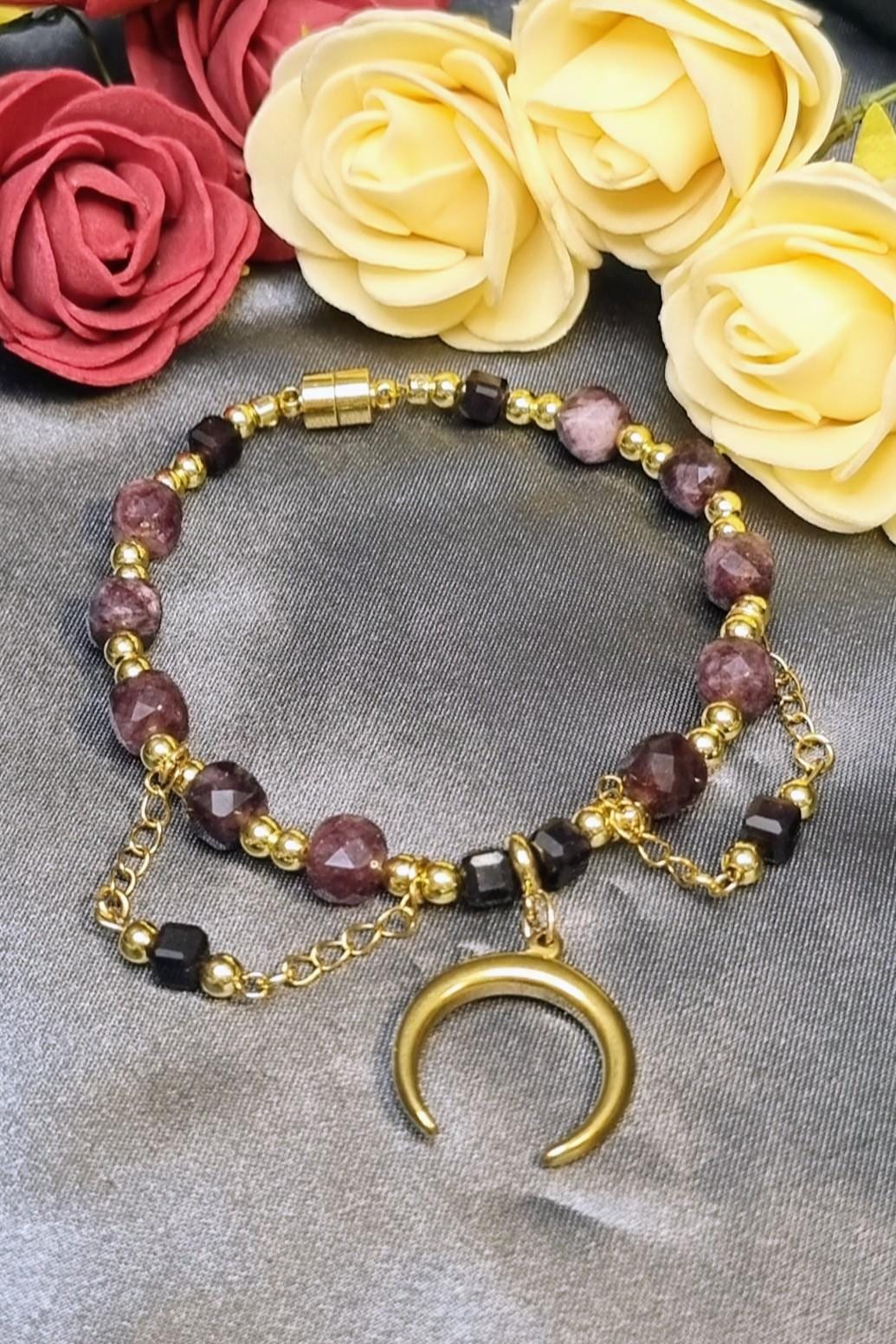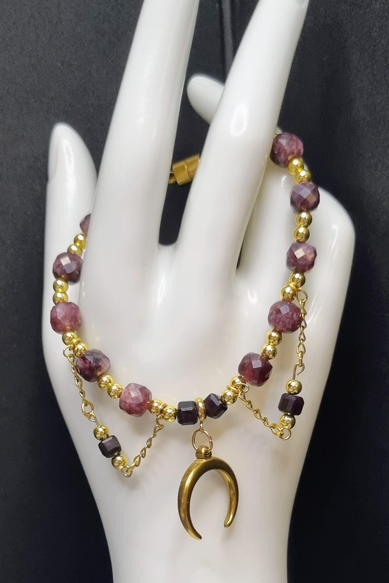 Garnet Bracelet • Gold-plated stainless steel • Faceted 6 & 4 mm garnet stones • Magnetic clasp • Moon pendant • Handmade
