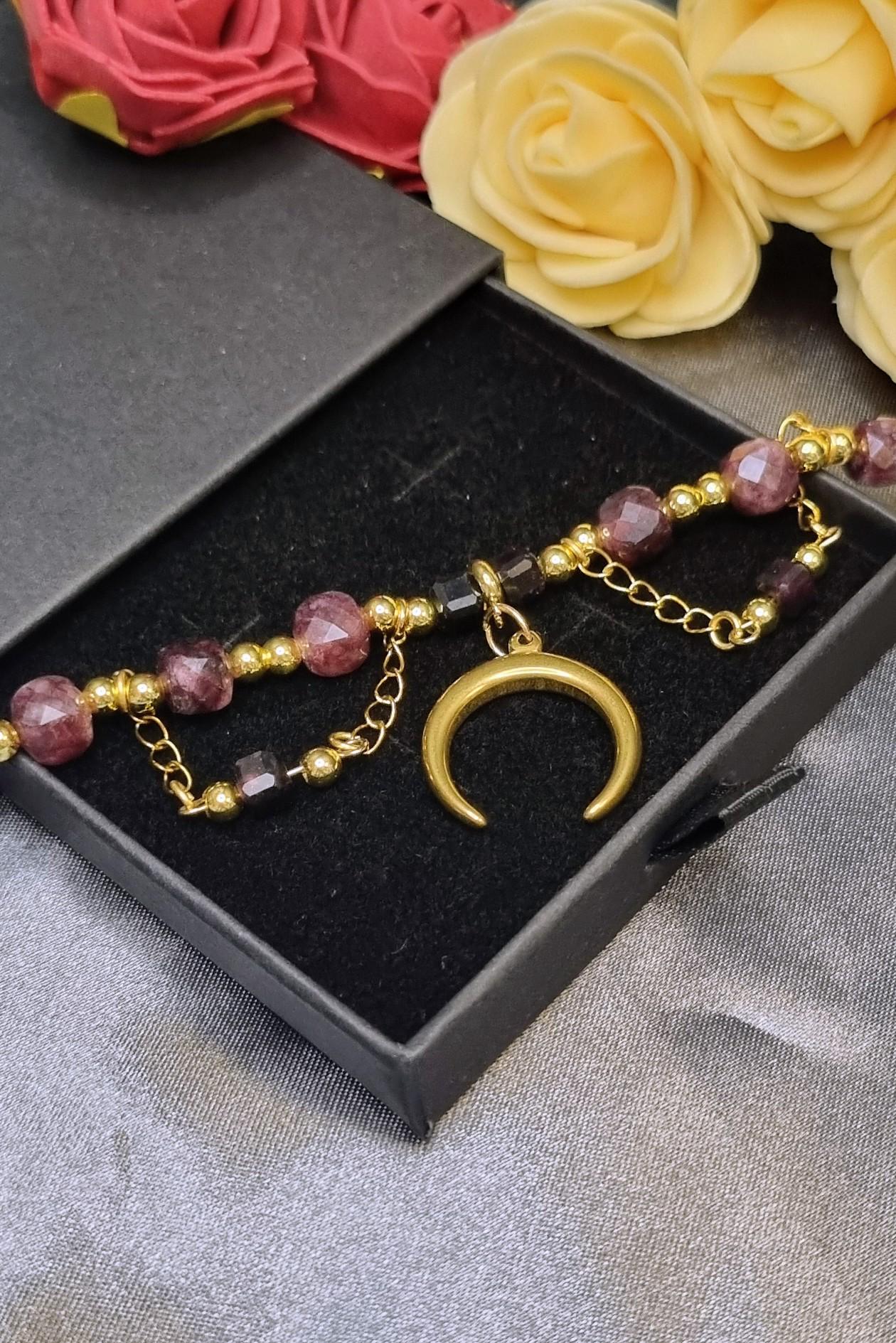 Elegant bracelet made of gold-plated stainless steel with faceted garnet stones in 6 mm and 4 mm sizes. Features a secure magnetic clasp and a modern moon charm — sophisticated, high-quality, and comfortable to wear.