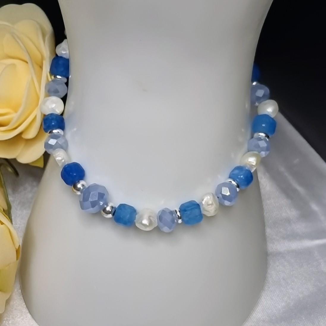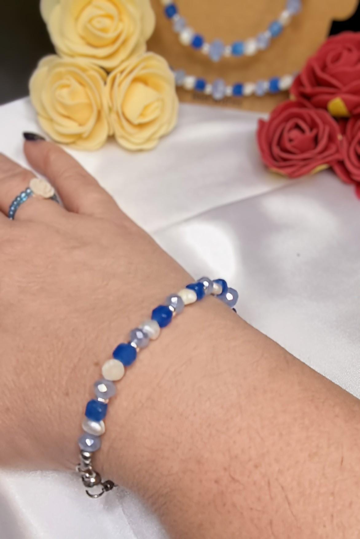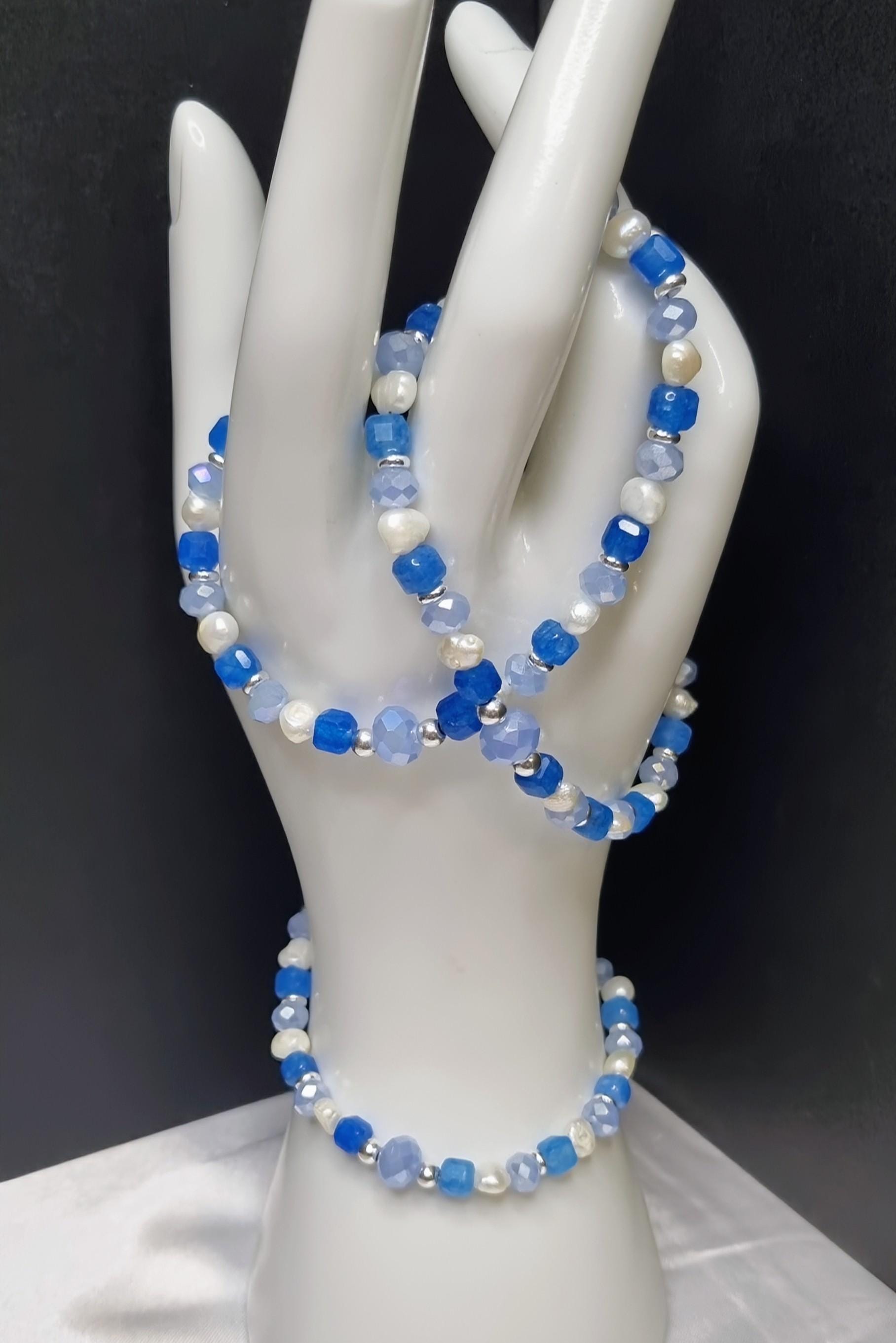 High-quality stainless steel bracelet with magnetic clasp – combining 6 mm faceted glass beads, an 8 mm spacer glass bead, apatite cube beads, and small freshwater pearls. Fresh blue and natural tones, modern and easy to wear.
