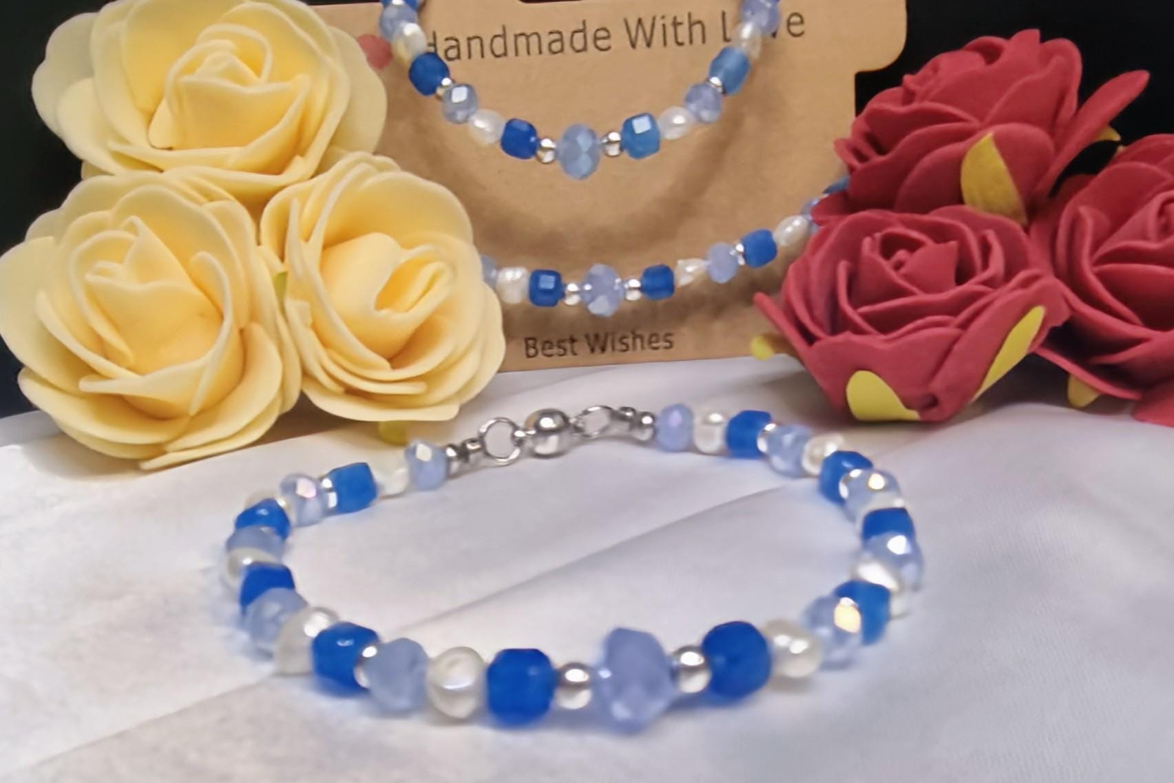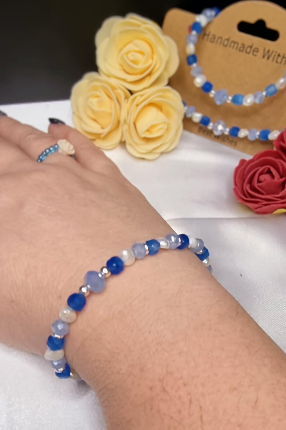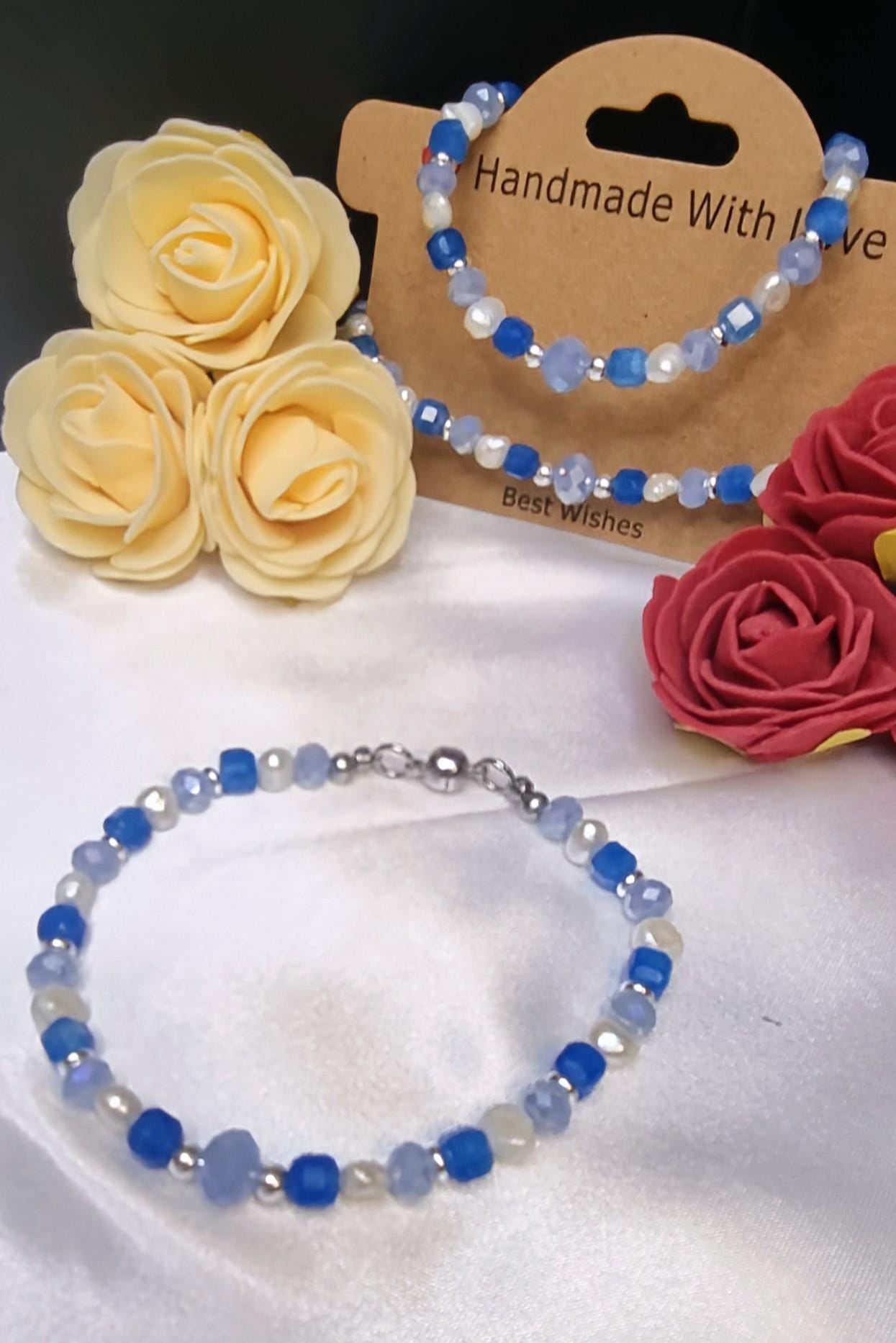 High-quality stainless steel bracelet with magnetic clasp – combining 6 mm faceted glass beads, an 8 mm spacer glass bead, apatite cube beads, and small freshwater pearls. Fresh blue and natural tones, modern and easy to wear.
