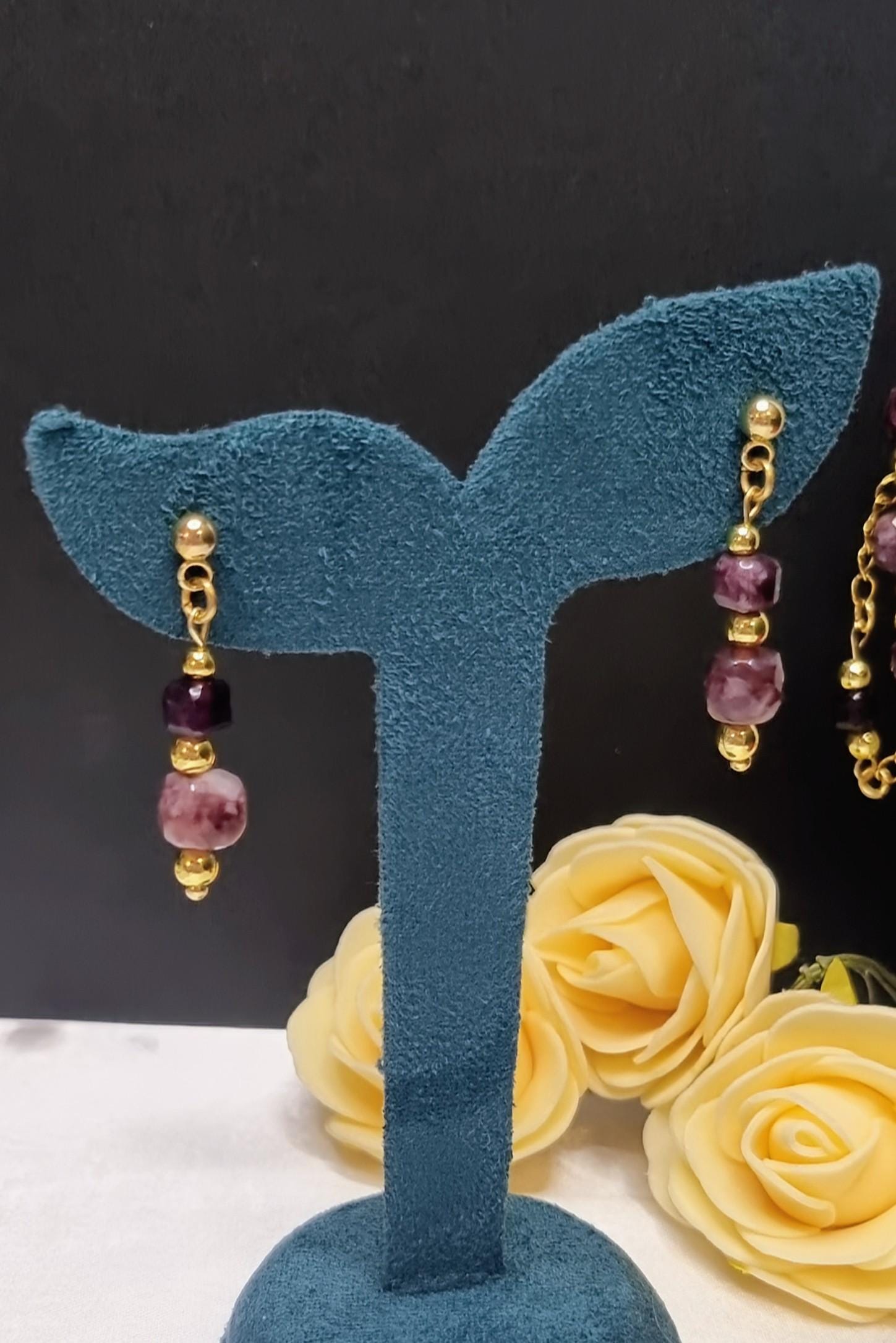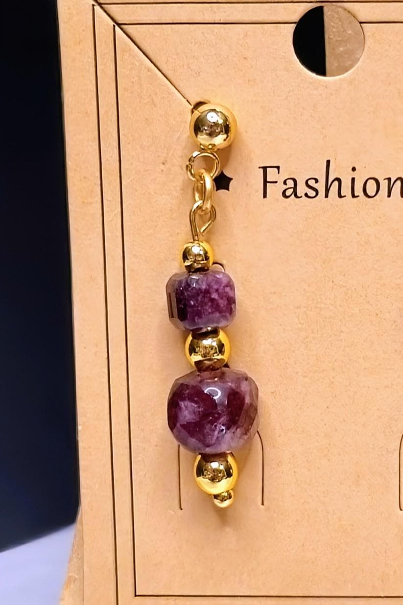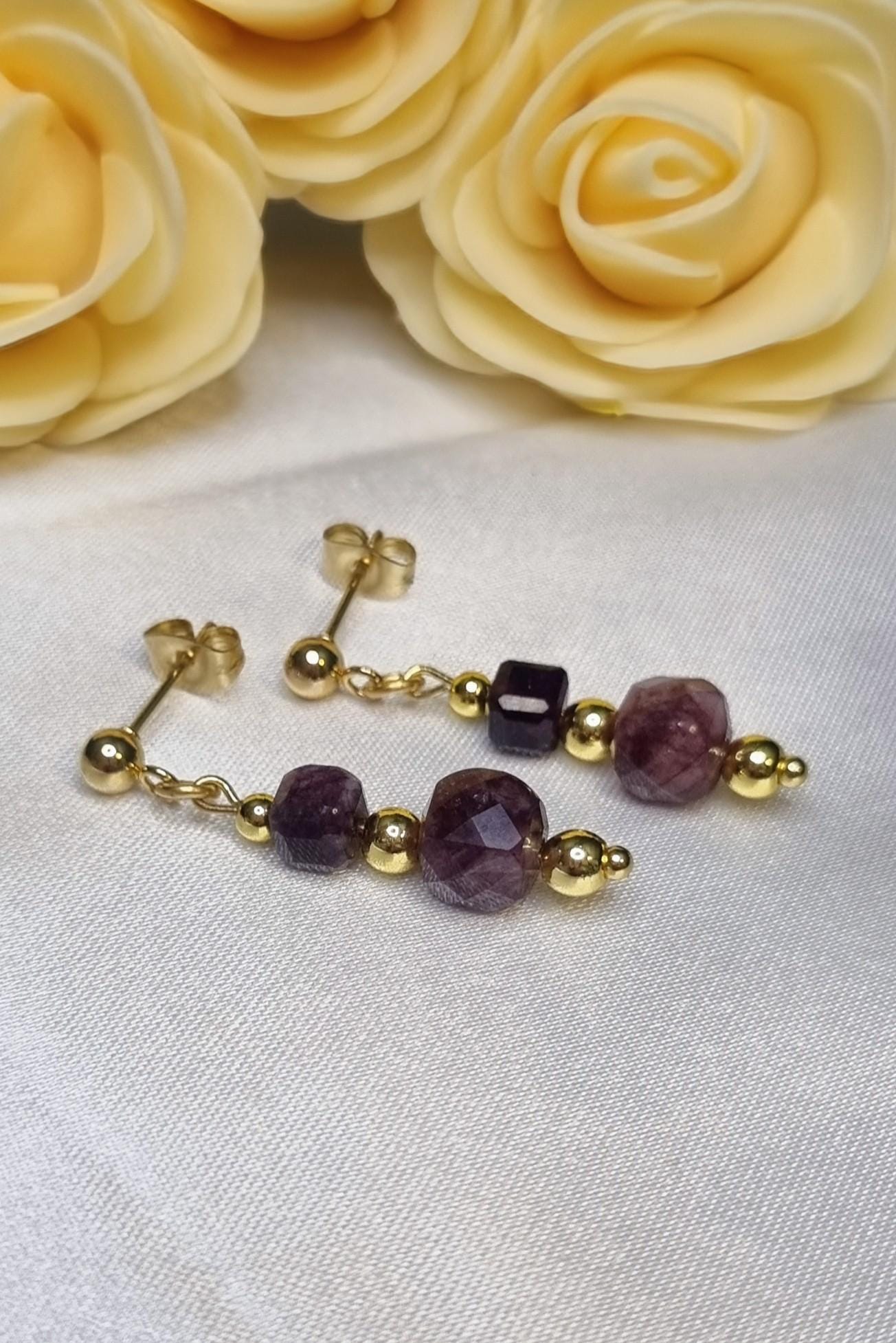 Elegant earrings in gold-plated stainless steel with faceted garnet beads — a combination of round and square stone shapes for a modern, sophisticated look. Lightweight, high-quality, and comfortable to wear.