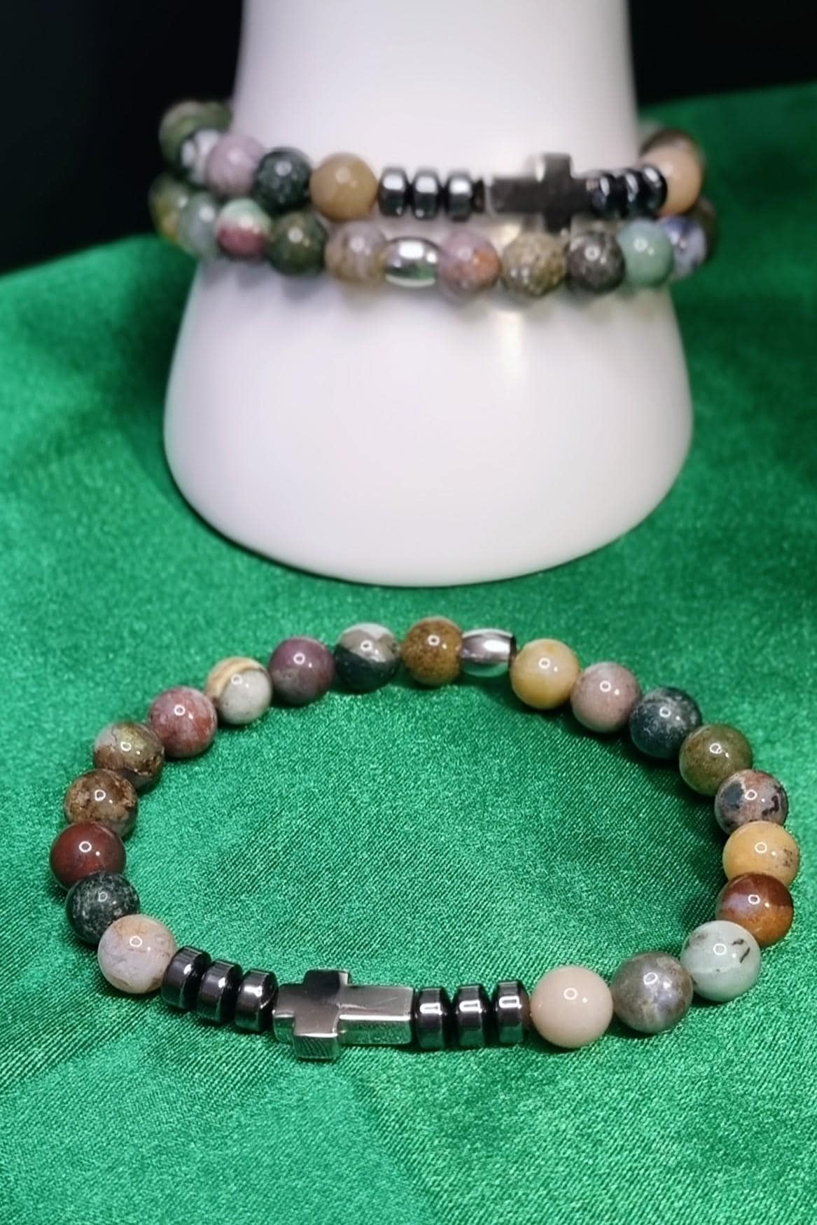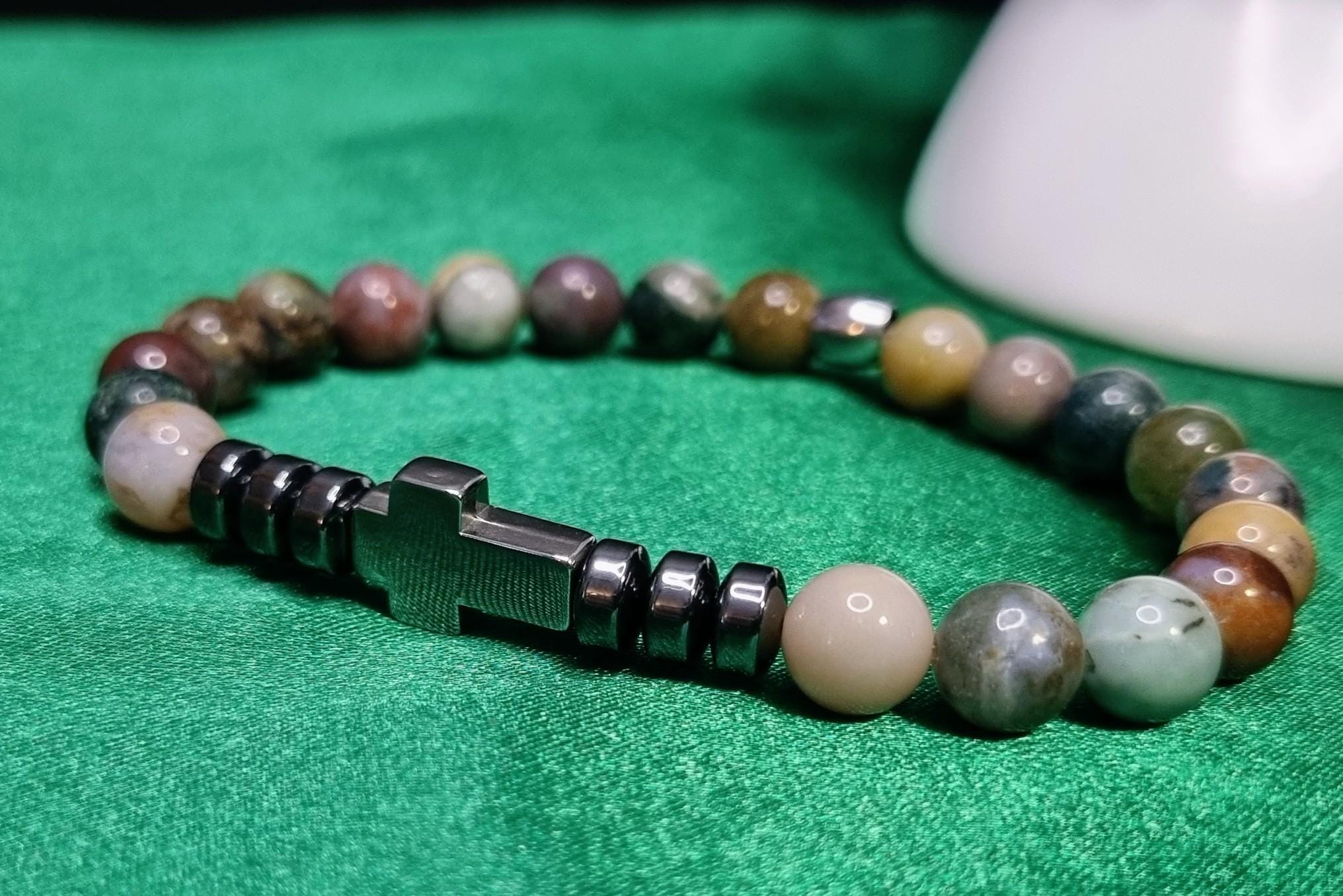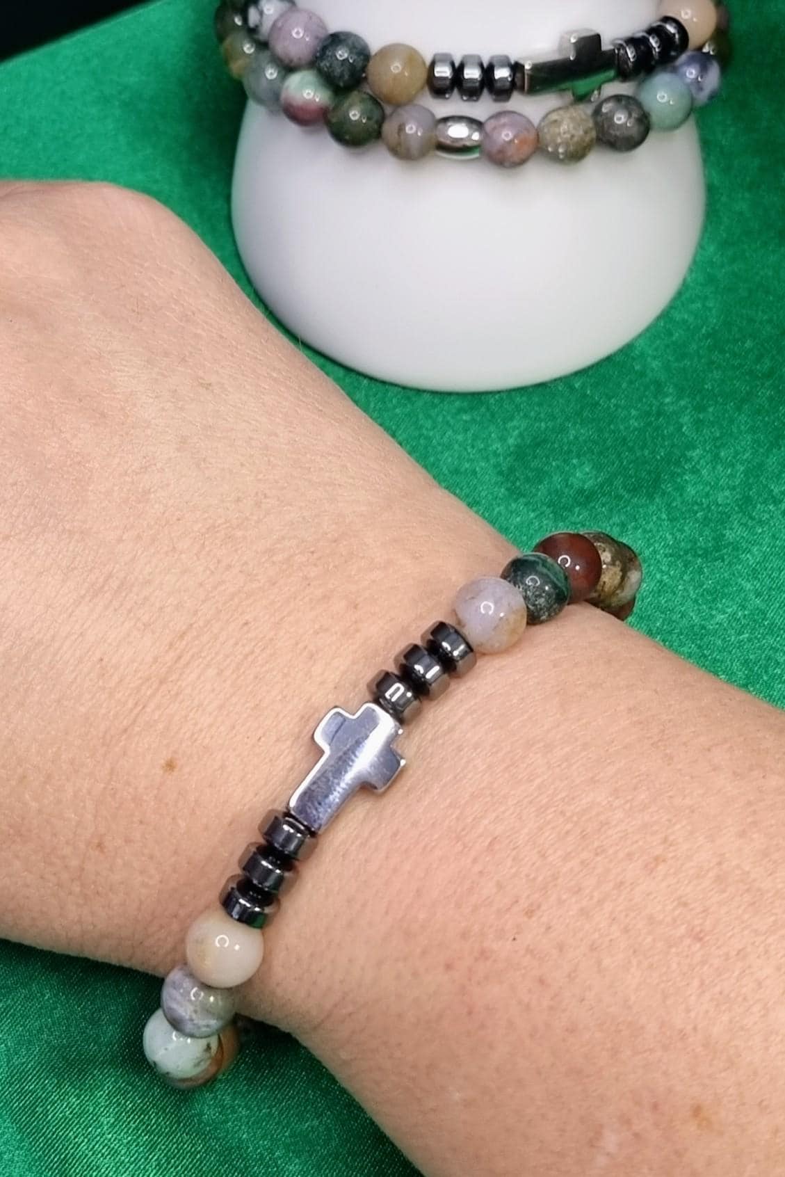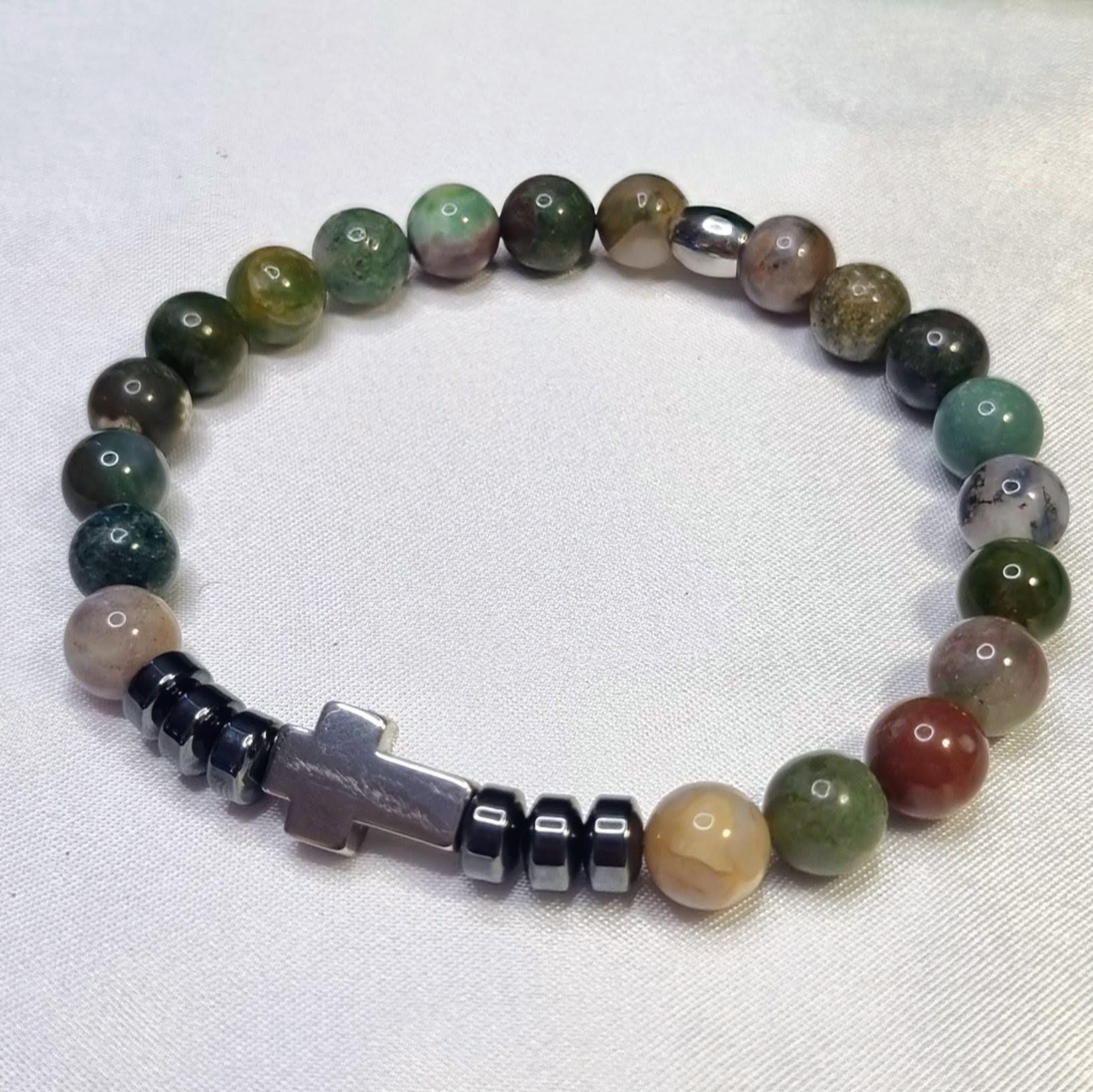 Men's bracelet • Indian agate 8 mm • elastic • stainless steel cross • hematite rondelles • handmade