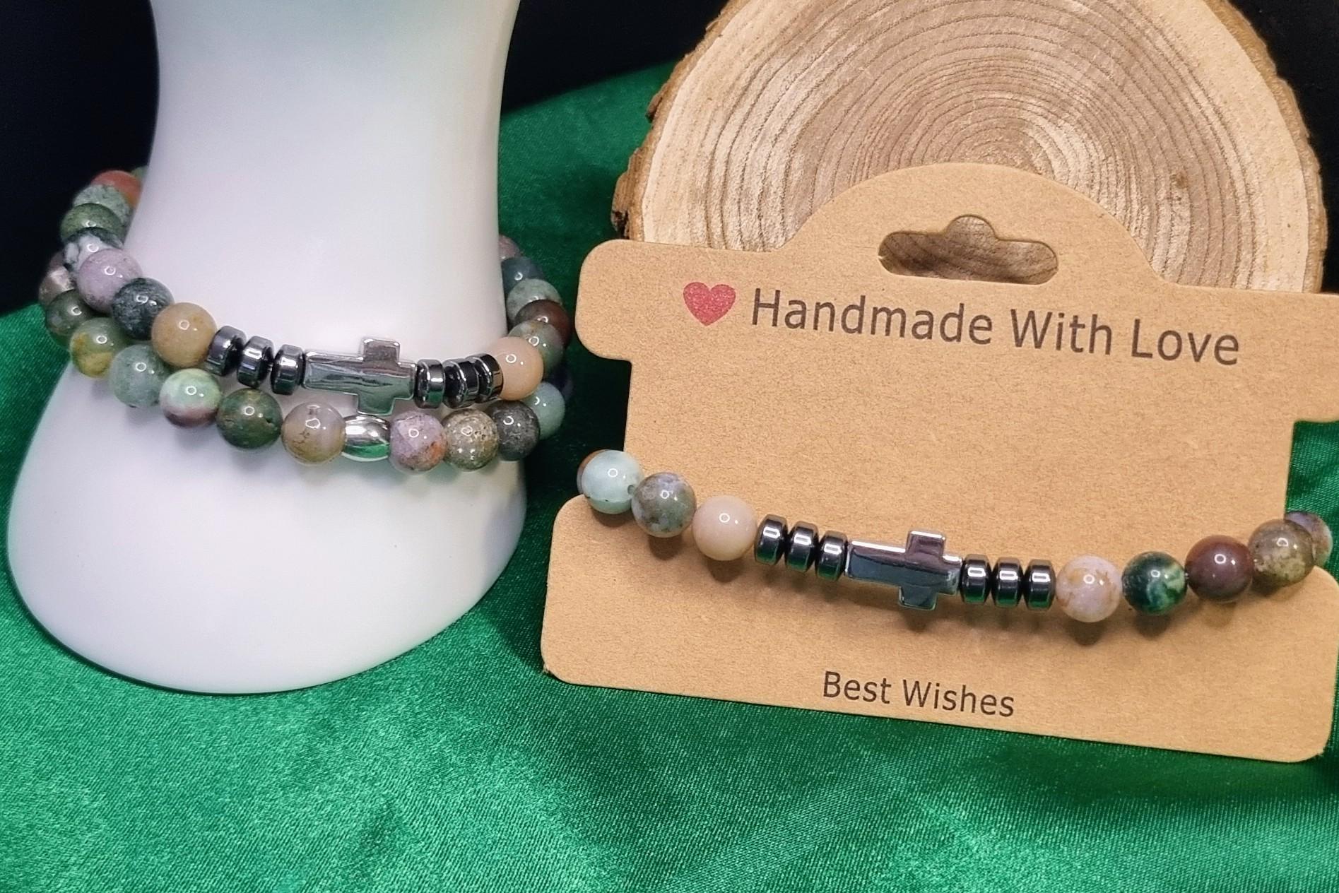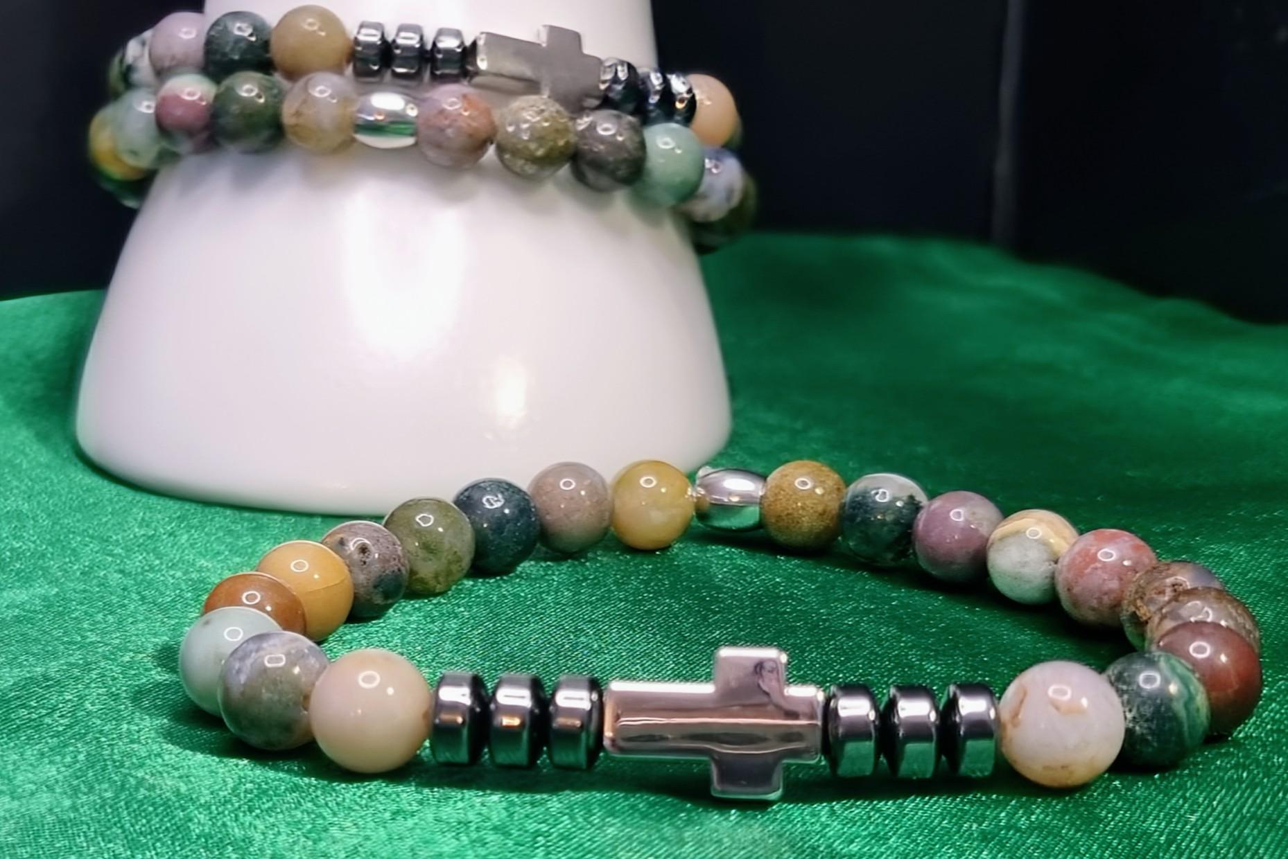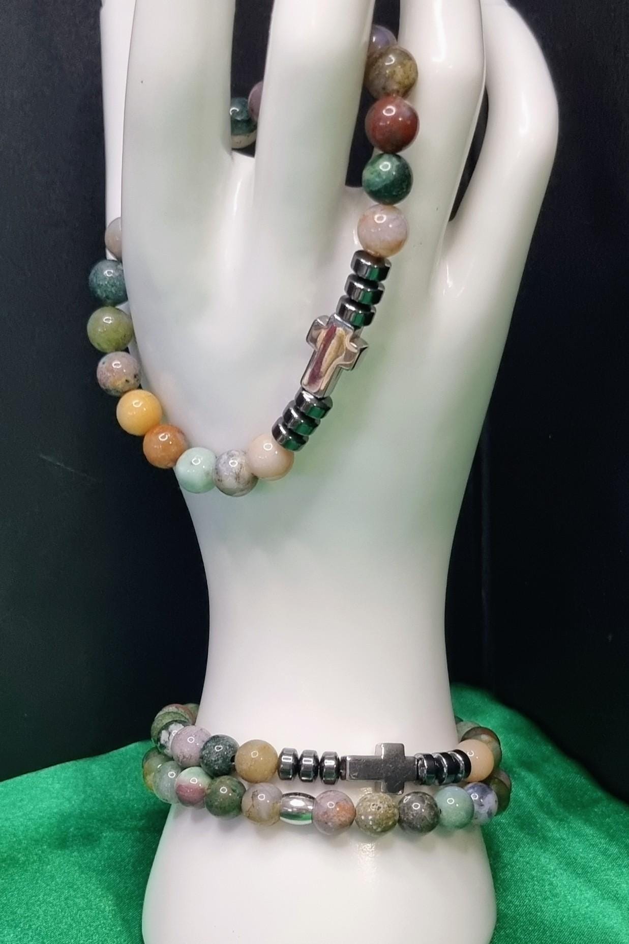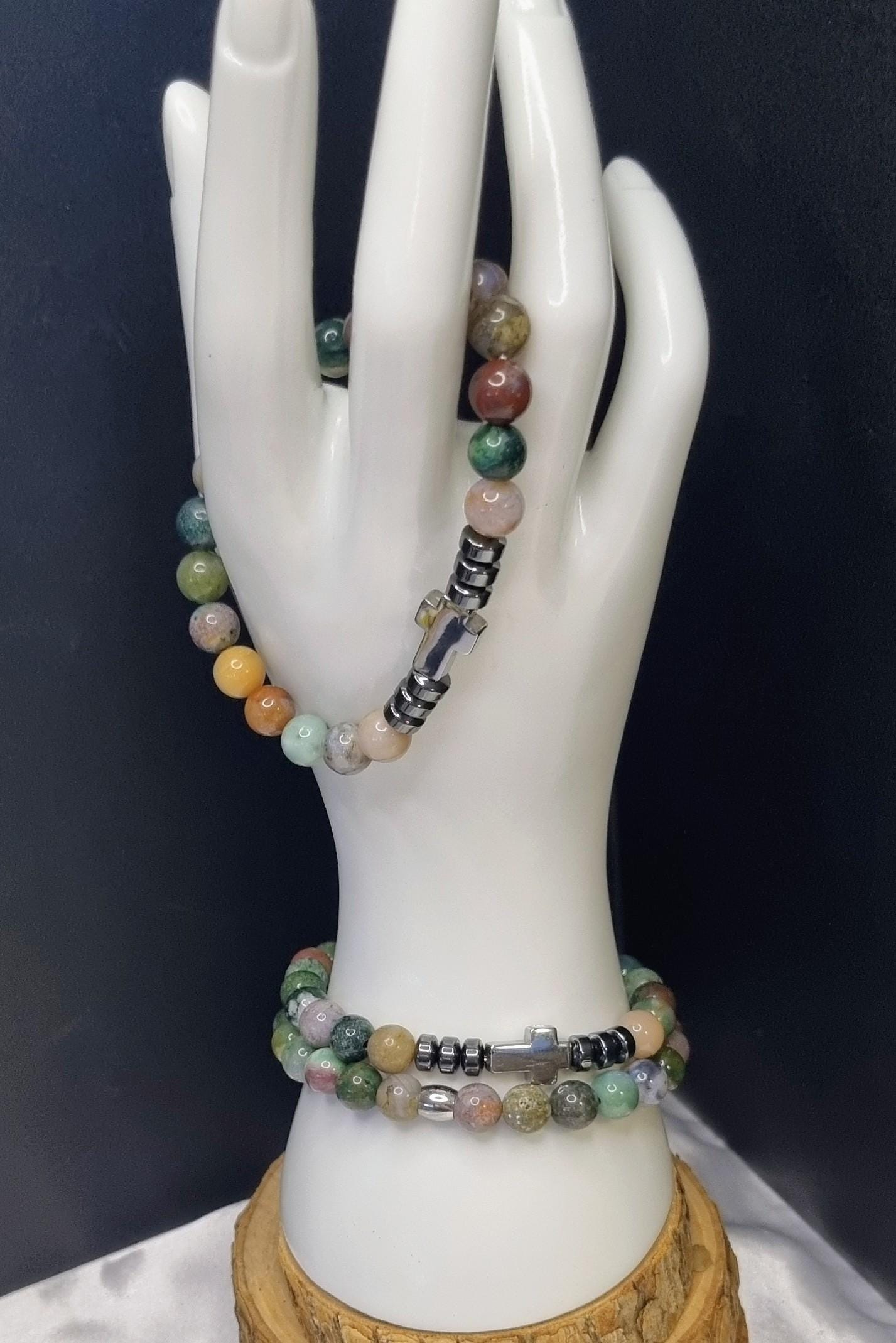 Men's bracelet • Indian agate 8 mm • elastic • stainless steel cross • hematite rondelles • handmade
