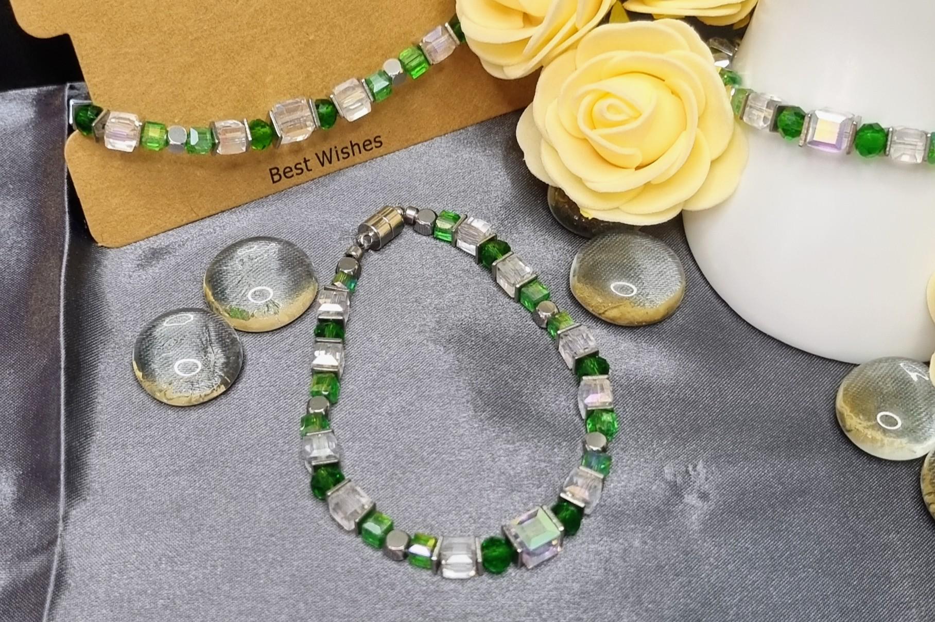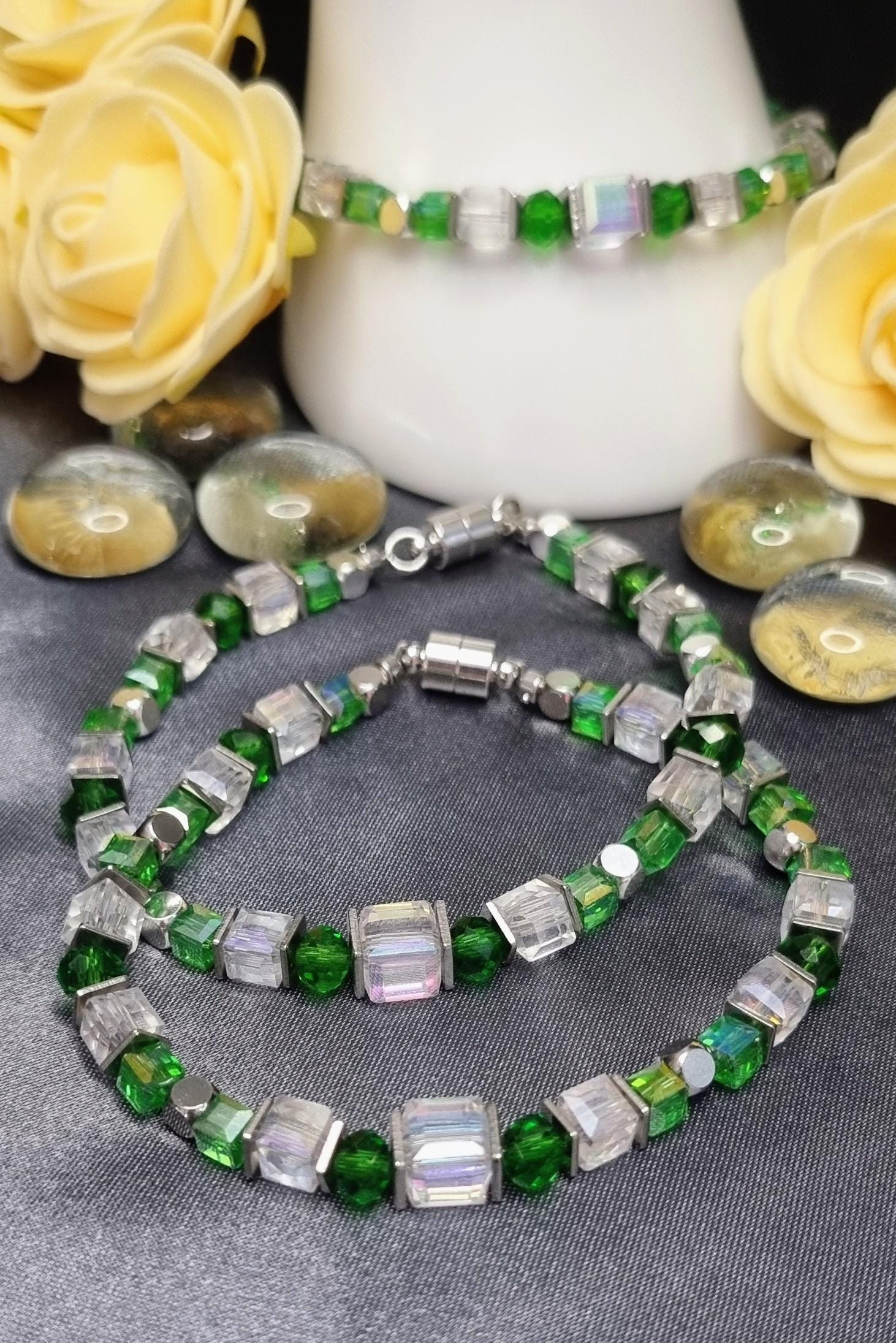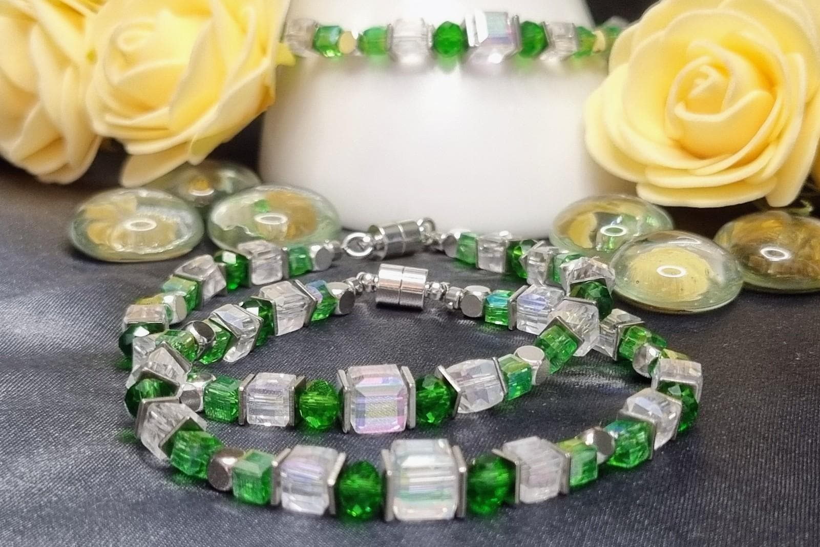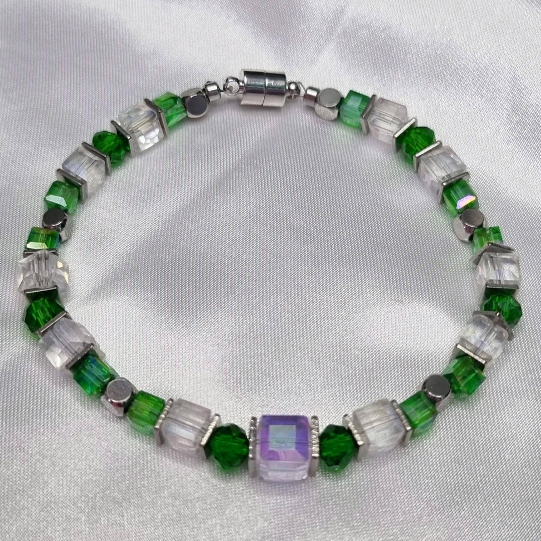 Bracelet with faceted glass beads in round and square shapes (4 mm, 6 mm, and 8 mm). Complemented with stainless steel spacer beads and stainless steel spacers. With a stainless steel magnetic clasp—sits comfortably on the wrist and has a modern, elegant look.