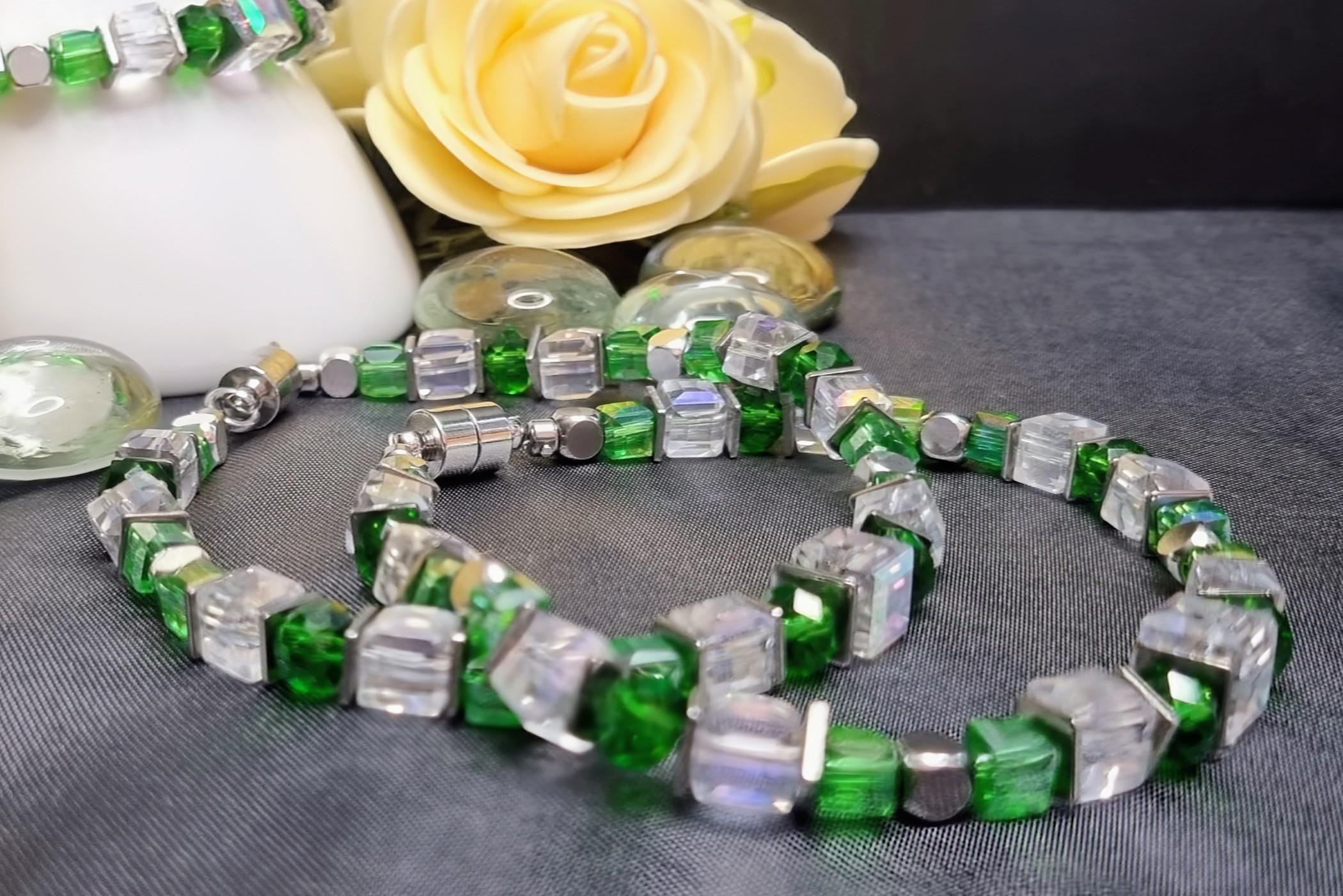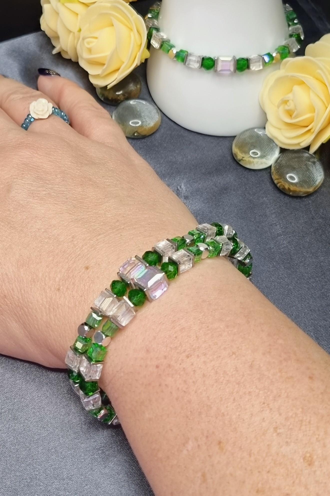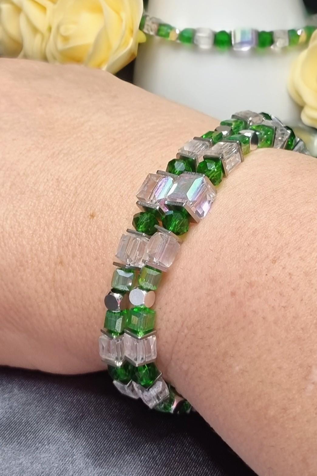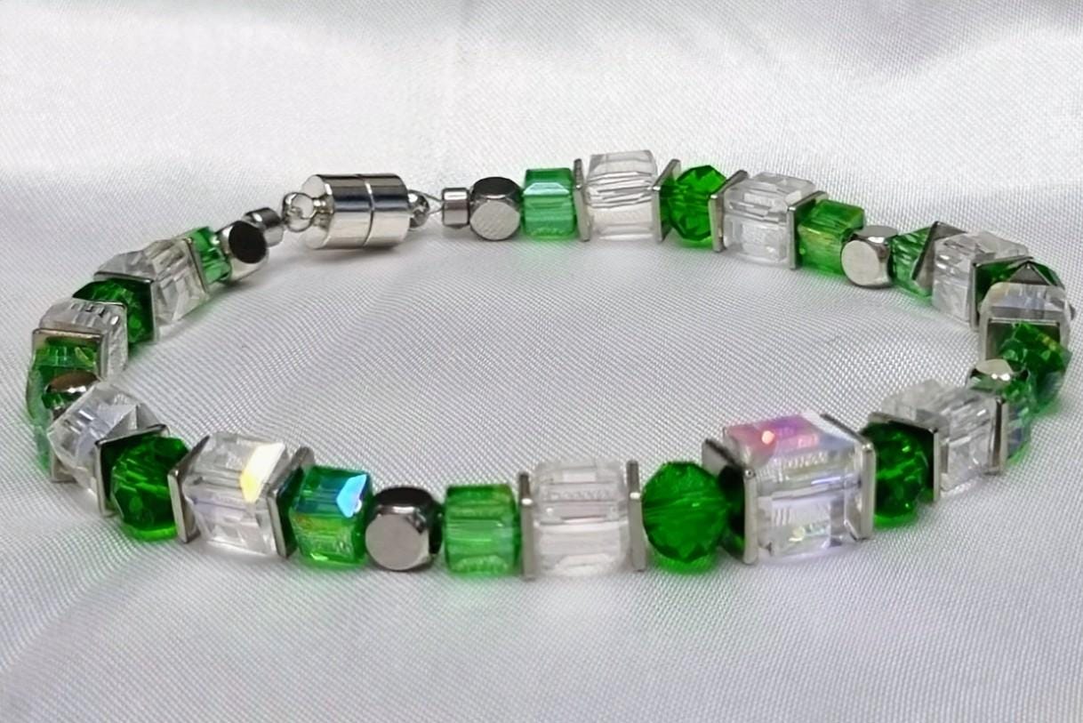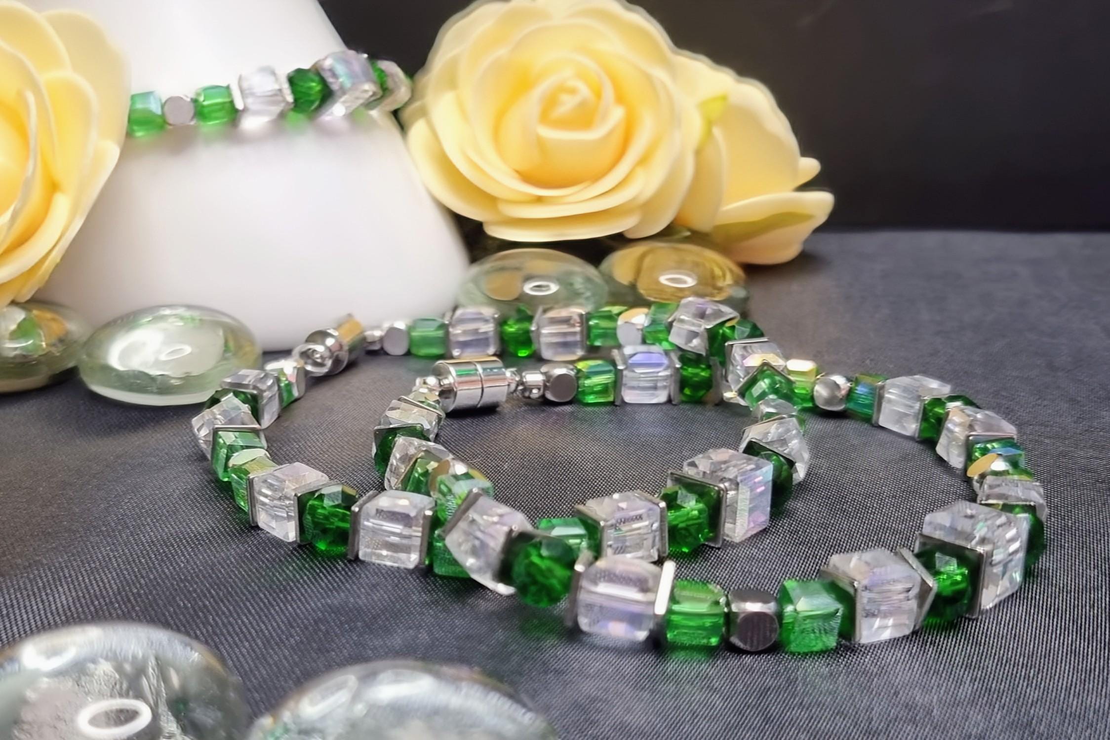 Bracelet with faceted glass beads in round and square shapes (4 mm, 6 mm, and 8 mm). Complemented with stainless steel spacer beads and stainless steel spacers. With a stainless steel magnetic clasp—sits comfortably on the wrist and has a modern, elegant look.