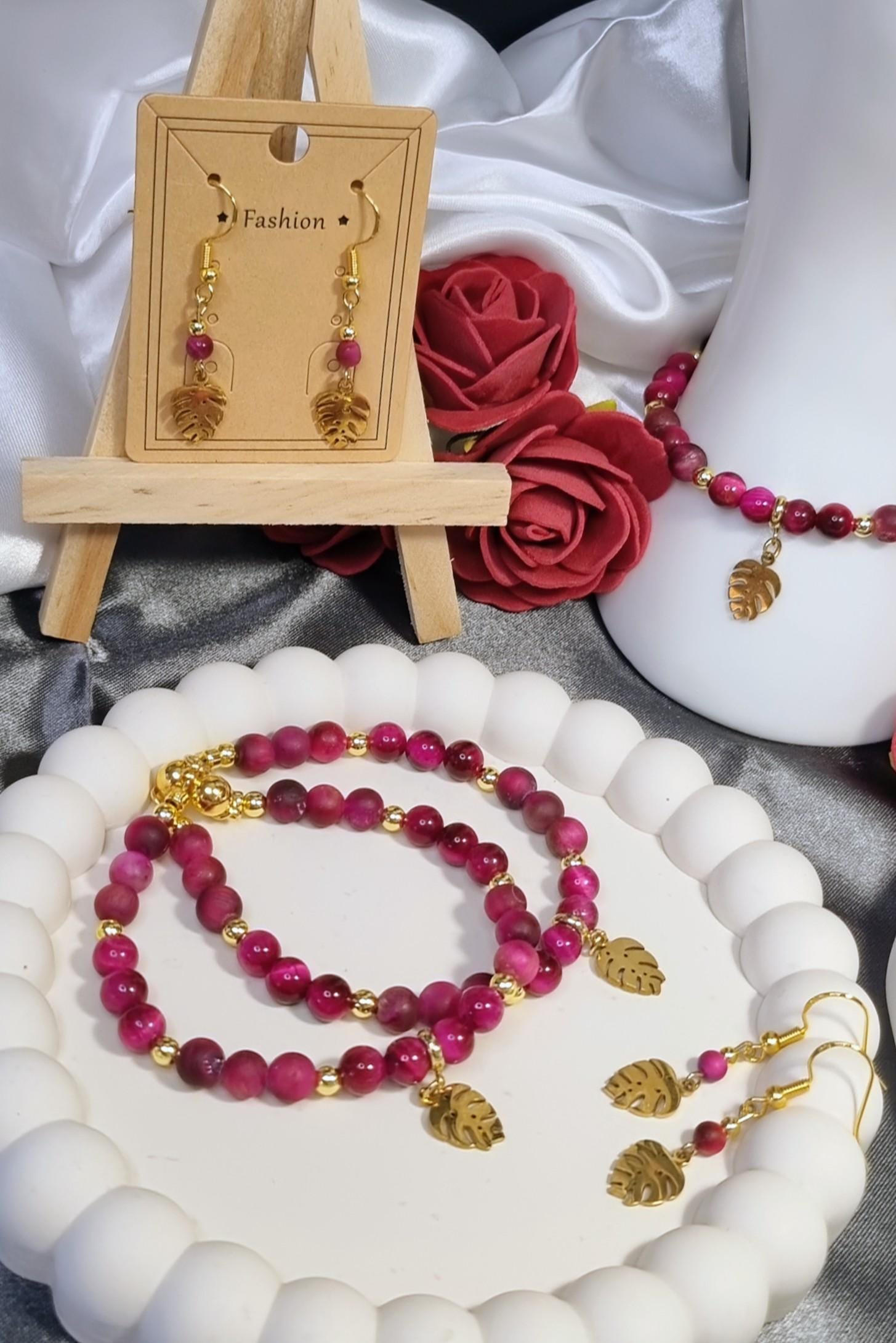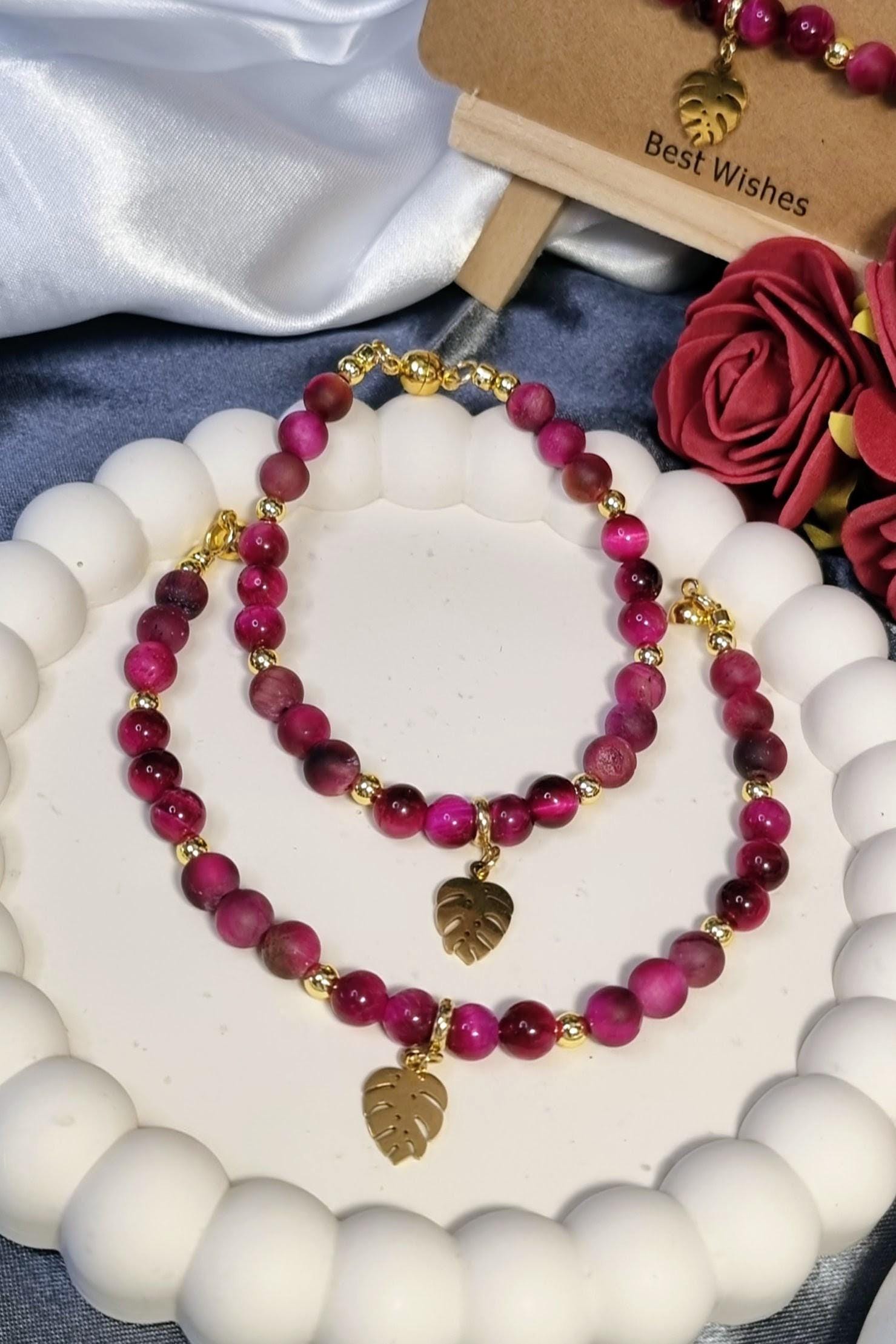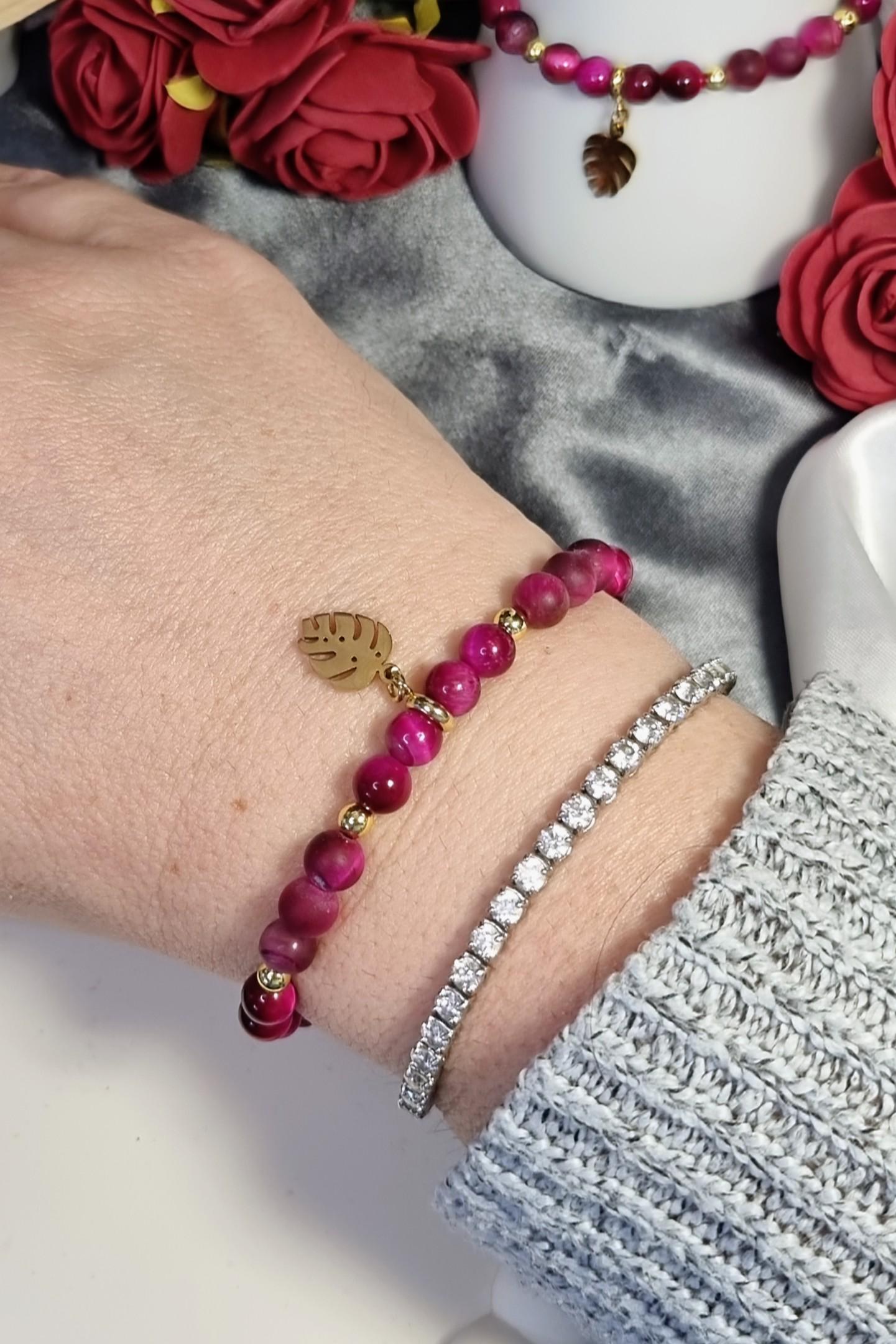An elegant bracelet made of 6 mm tiger's eye beads in a vibrant fuchsia hue, featuring a combination of matte and polished finishes. Gold-plated 18K stainless steel spacer beads add subtle accents. A gold-plated stainless steel monstera leaf serves as a striking centerpiece. The magnetic clasp ensures comfortable wear and a secure fit.