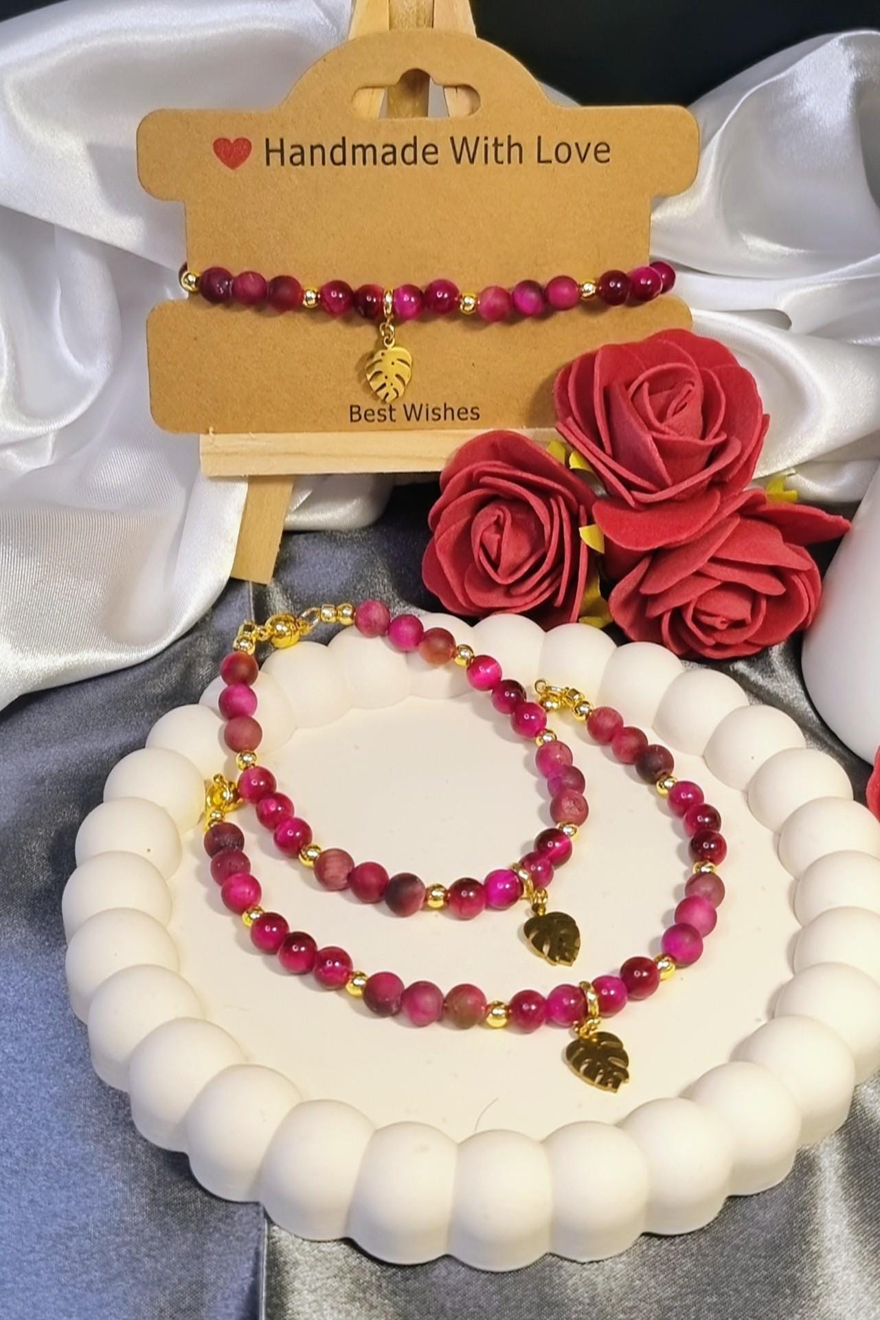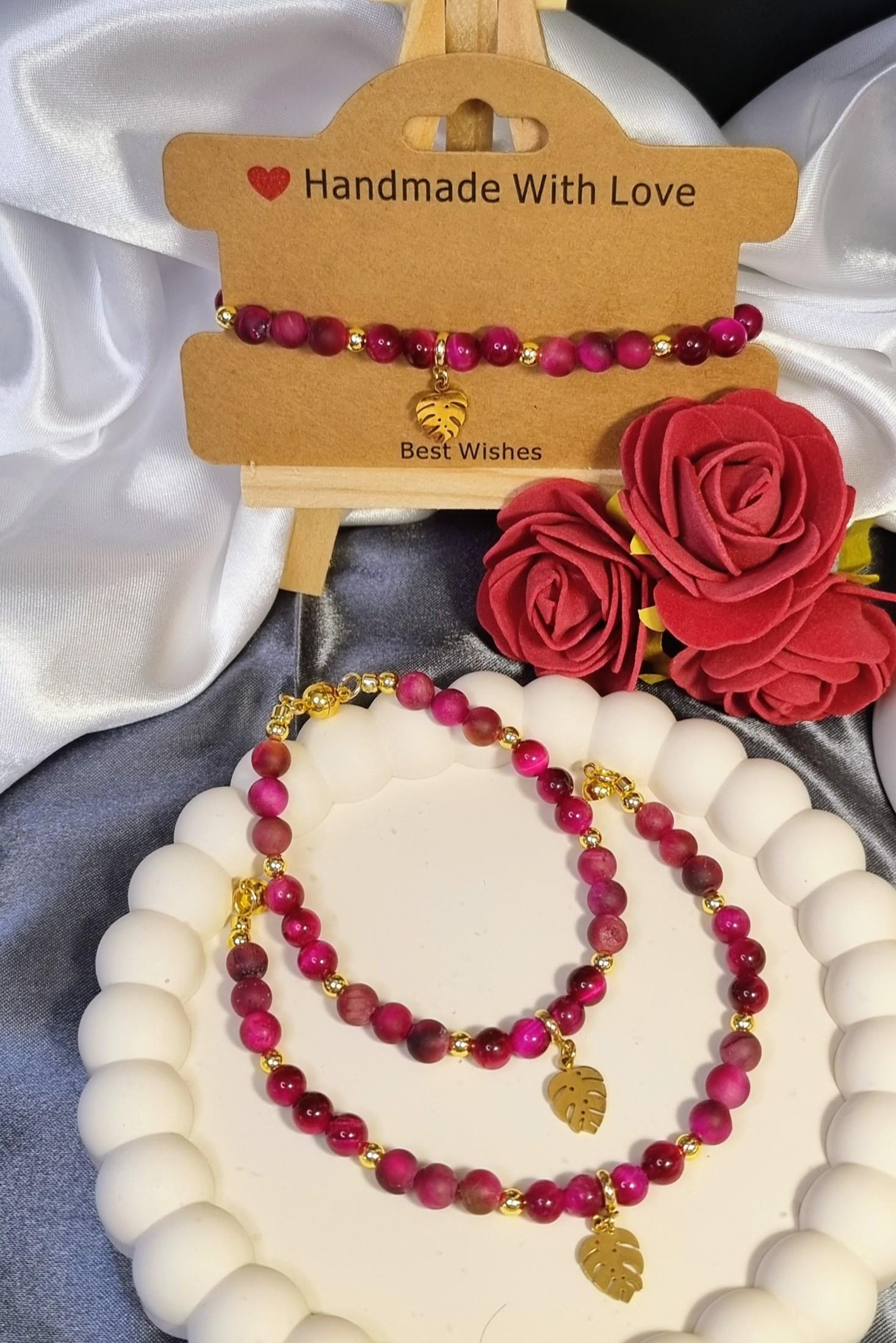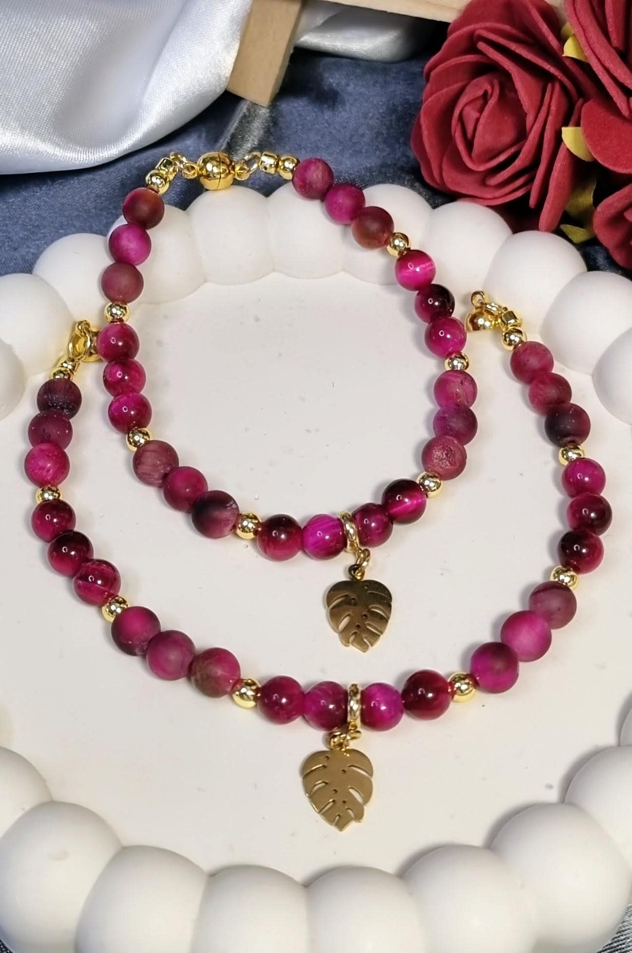 An elegant bracelet made of 6 mm tiger's eye beads in a vibrant fuchsia hue, featuring a combination of matte and polished finishes. Gold-plated 18K stainless steel spacer beads add subtle accents. A gold-plated stainless steel monstera leaf serves as a striking centerpiece. The magnetic clasp ensures comfortable wear and a secure fit.