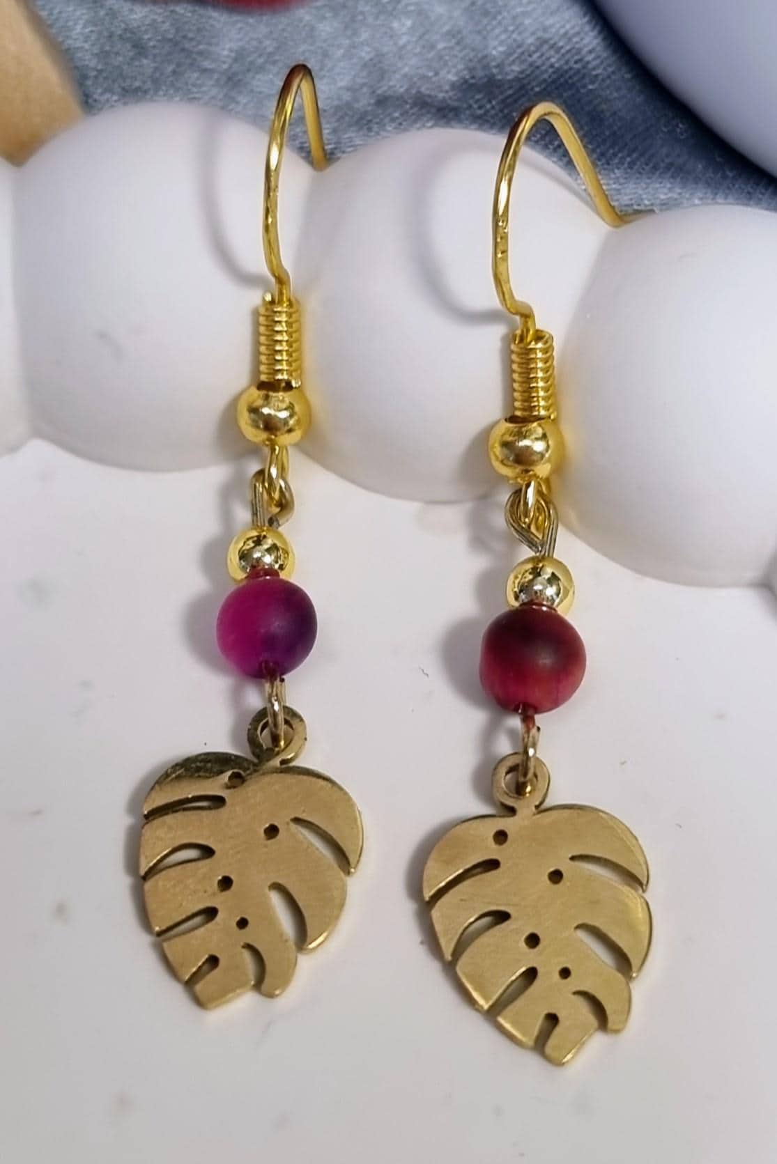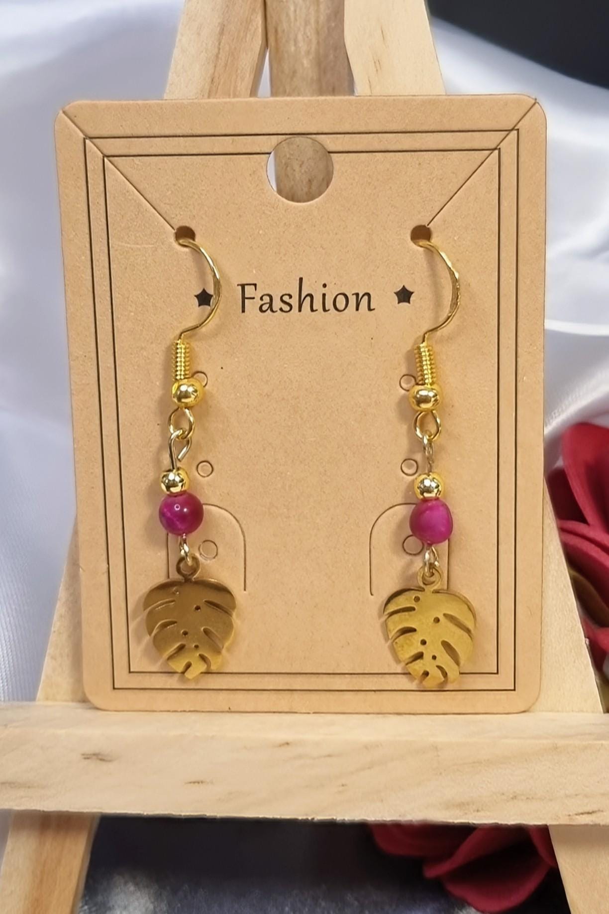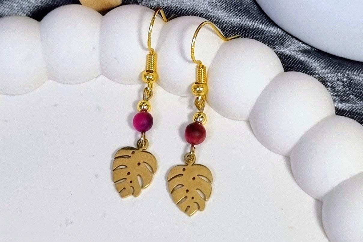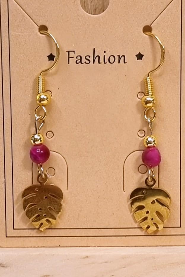 Crafted with a 4mm fuchsia tiger's eye bead and a delicate monstera leaf in 18K gold-plated stainless steel. The slim design allows for effortless movement and comfortable wear.