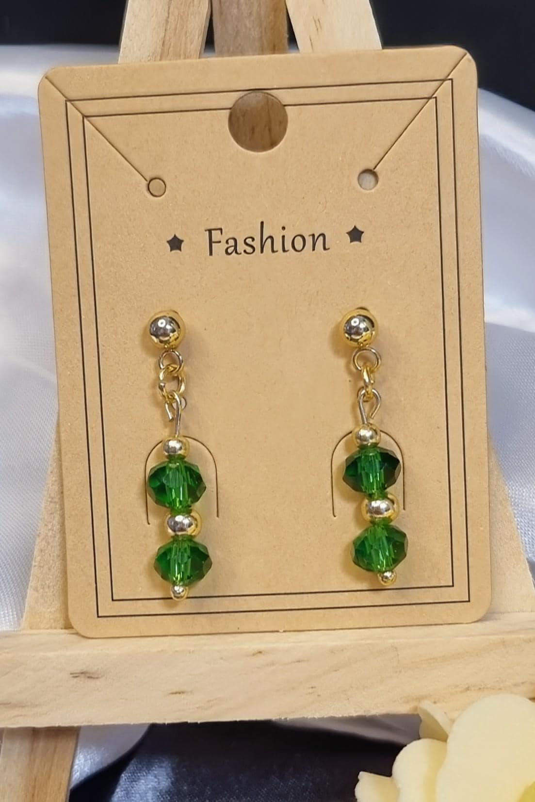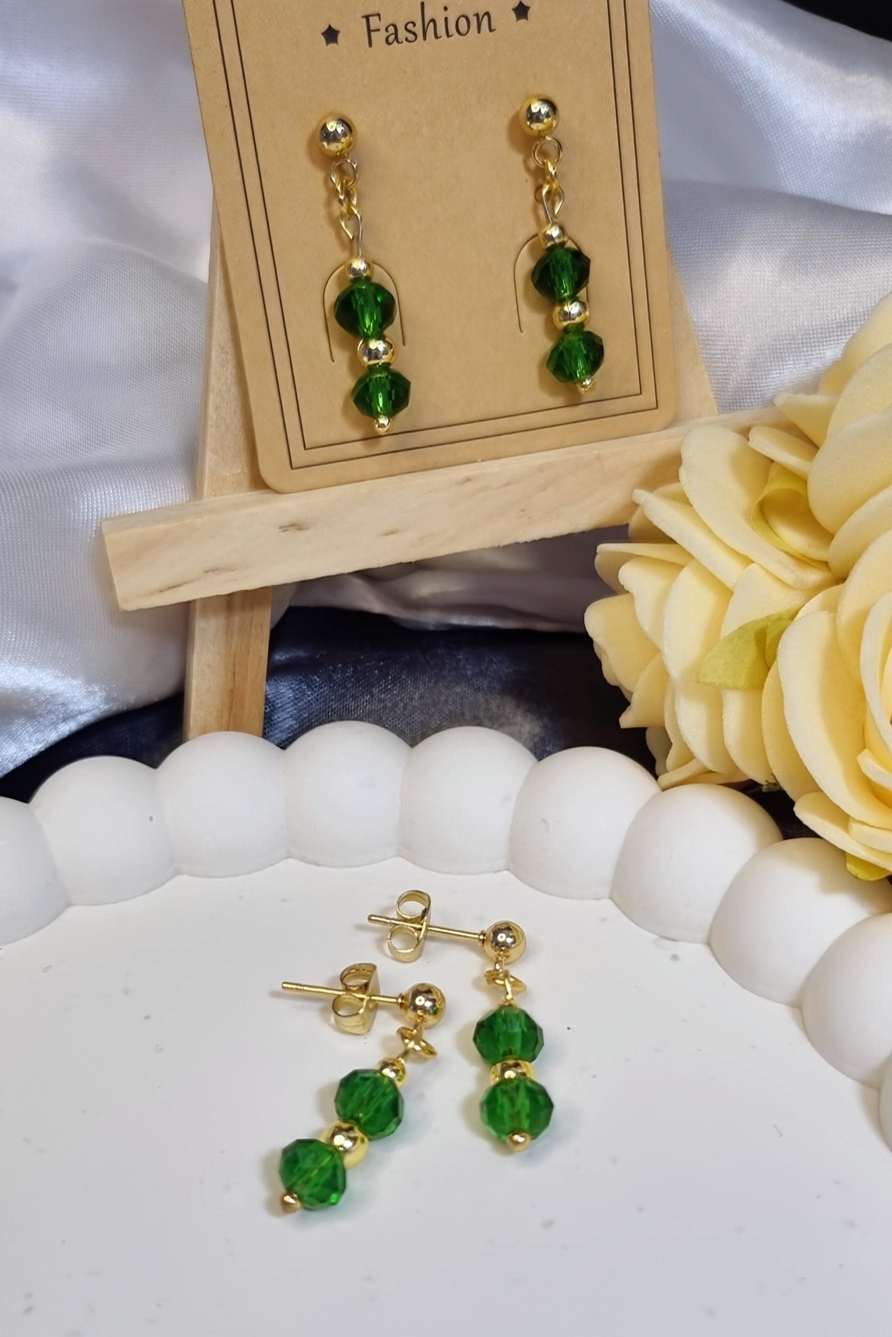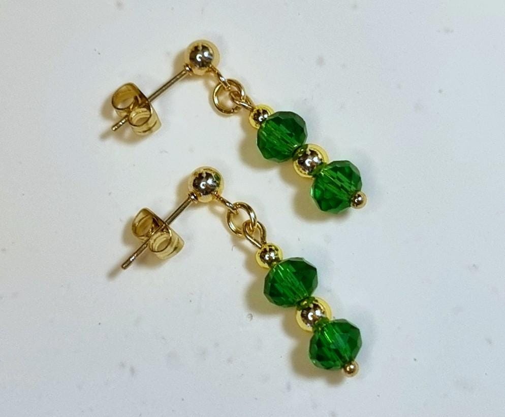 Elegant stud earrings made of green, faceted crystal glass with delicate gold-colored accents. The 6 mm crystal glass beads are complemented by 18K gold-plated stainless steel spacer beads in 3 mm and 4 mm. Lightweight, comfortable to wear, and ideal as a complement to the matching bracelet.