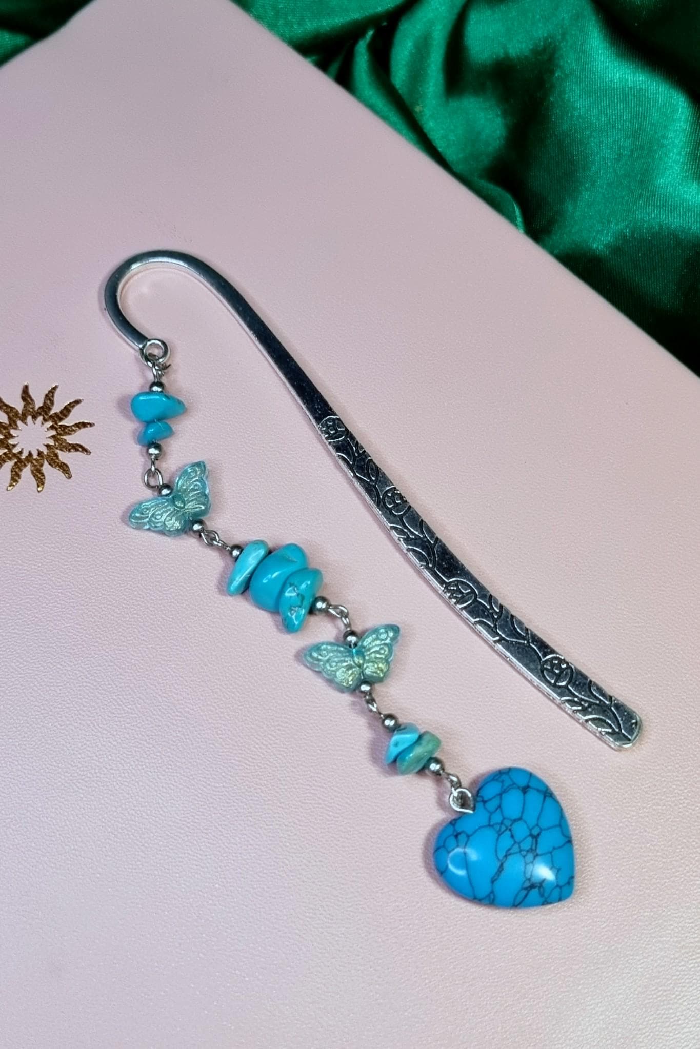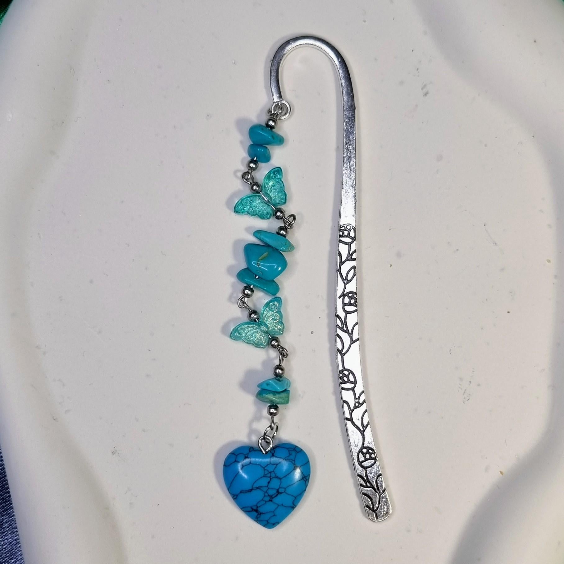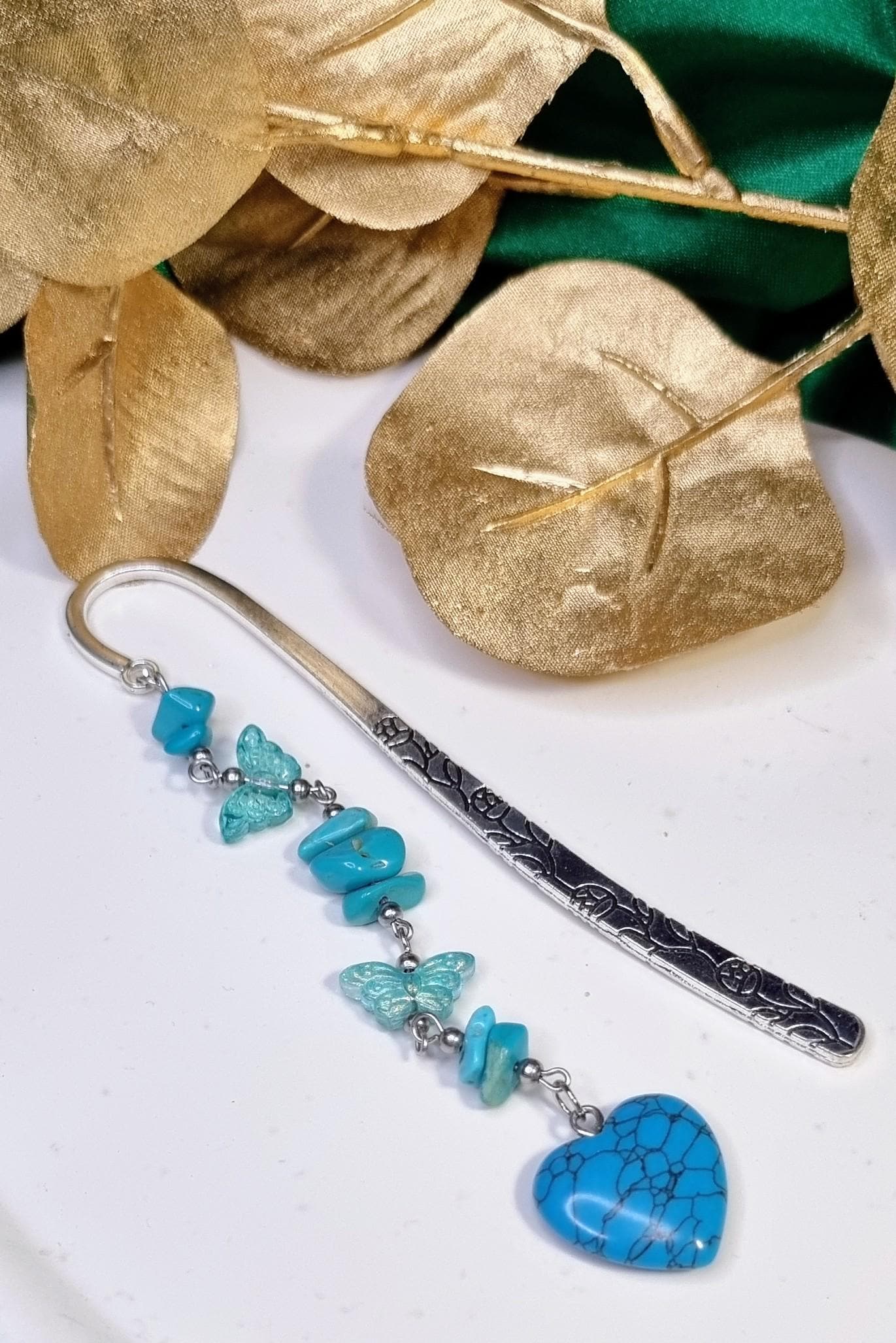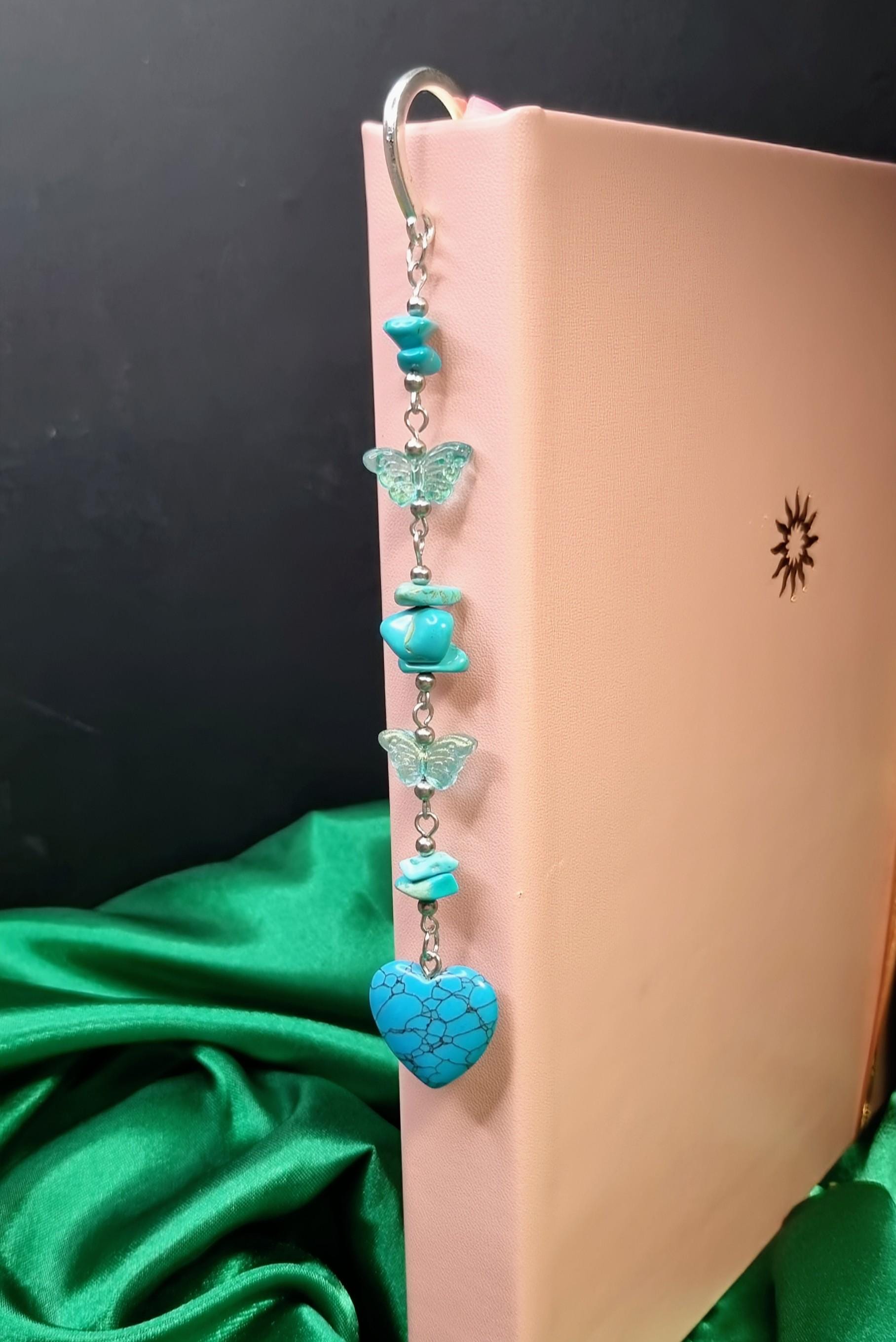 Lesezeichen aus Edelstahl mit Türkise Splitter, Herzanhänger und Glas-Schmetterlinge