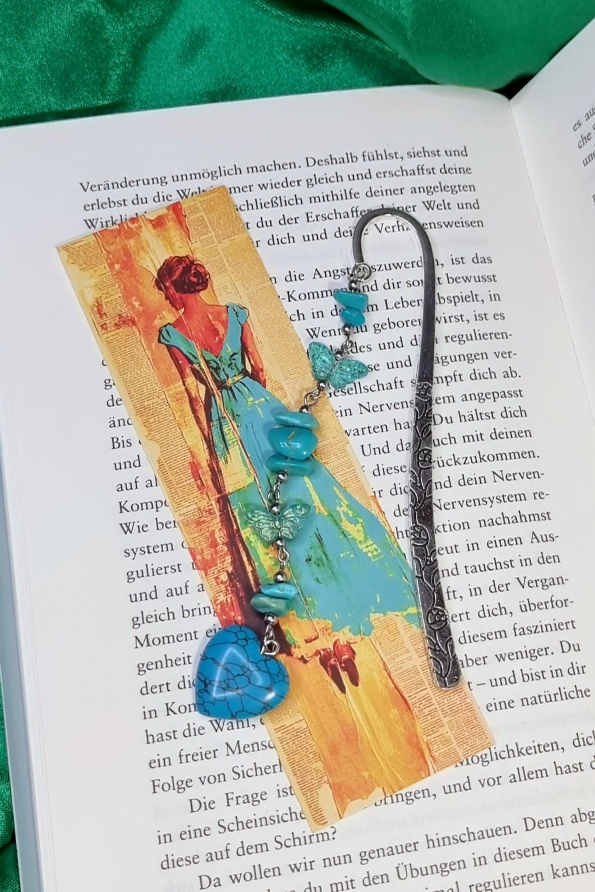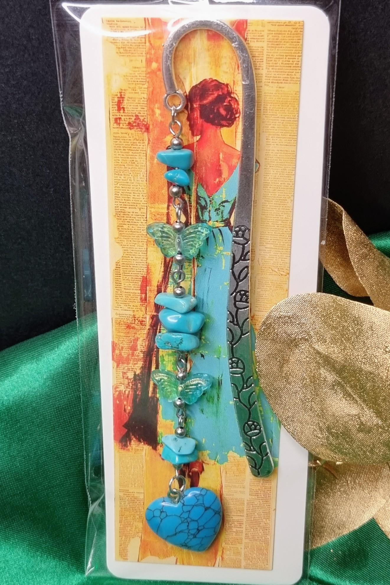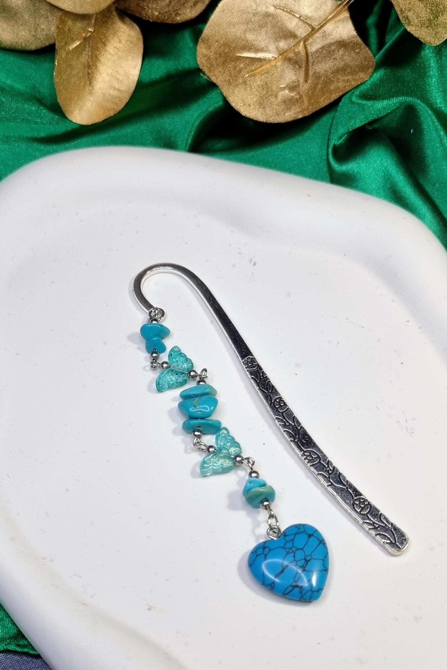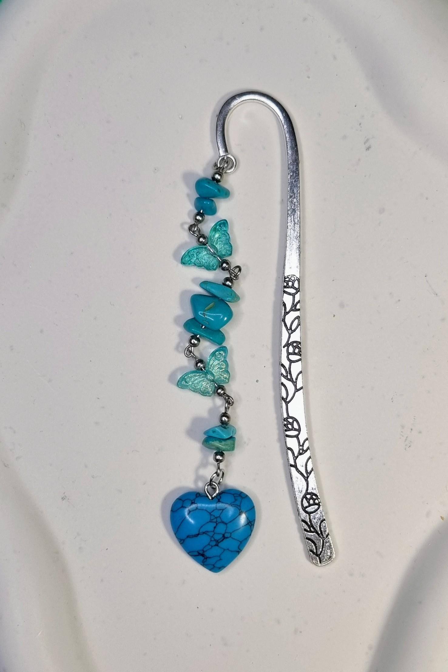 Lesezeichen aus Edelstahl mit Türkise Splitter, Herzanhänger und Glas-Schmetterlinge