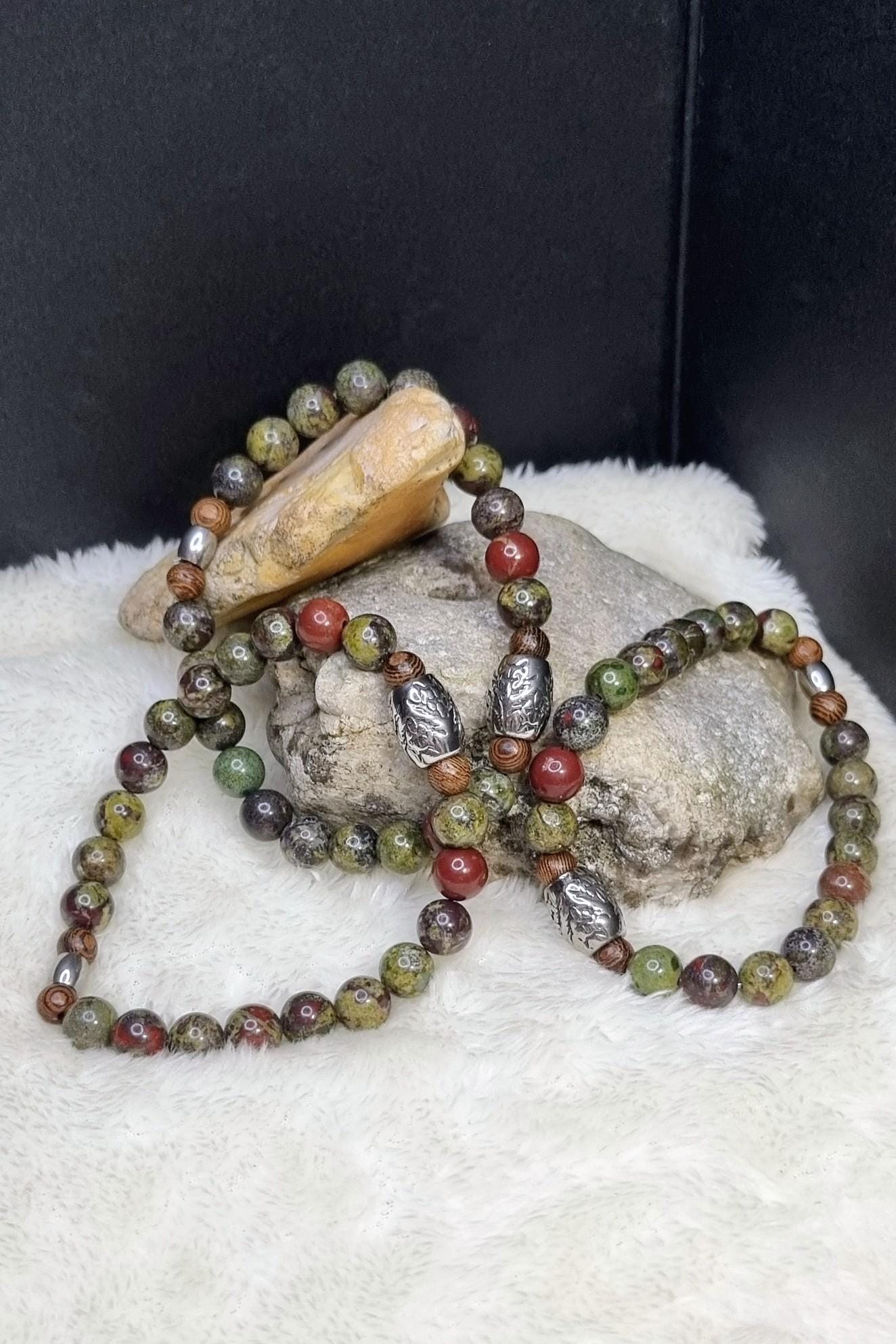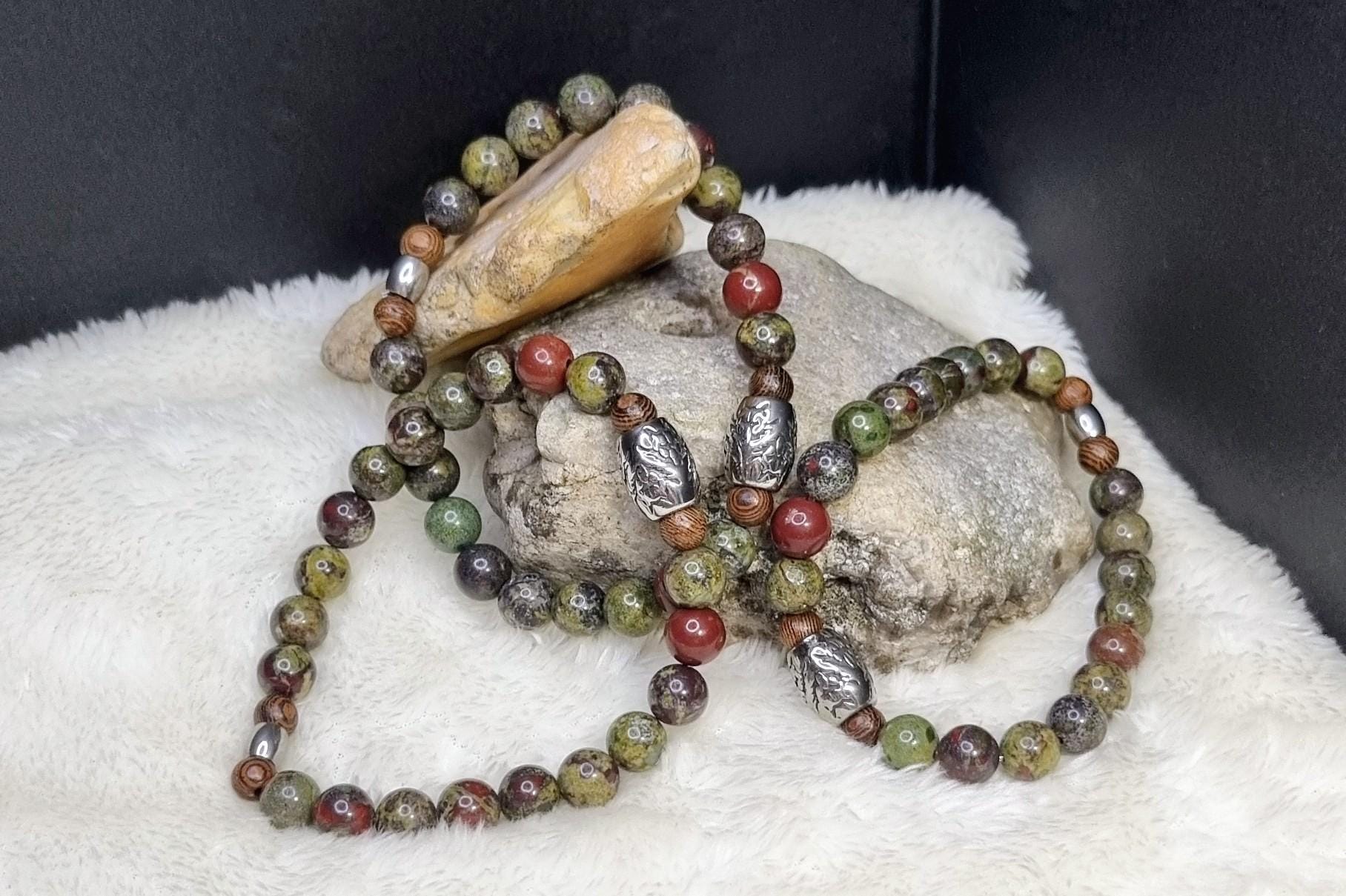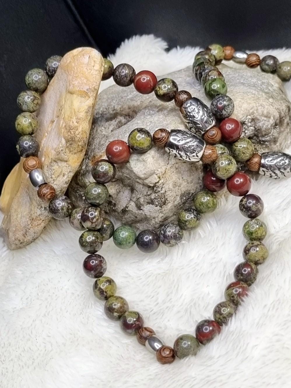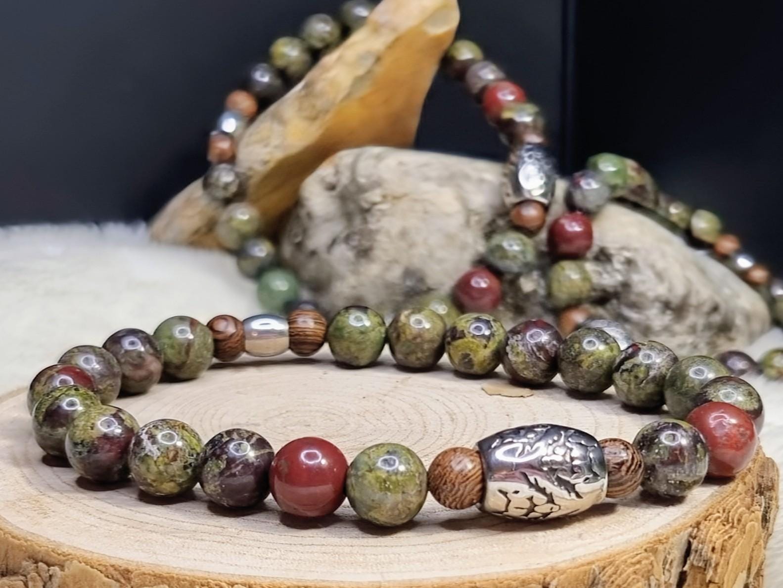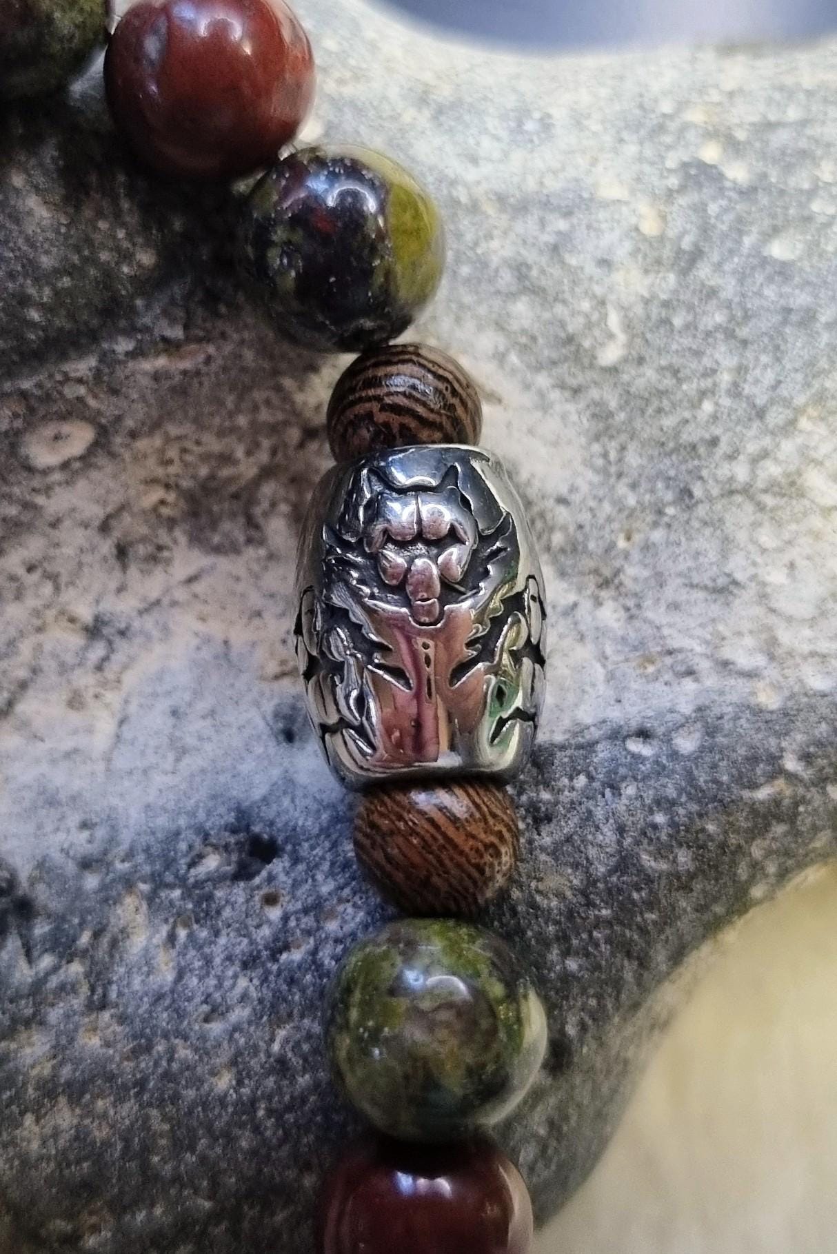 Elastic men's bracelet made of 8 mm dragon's blood stone (also called dragon jasper) with a striking barrel-shaped center bead and wolf motif.