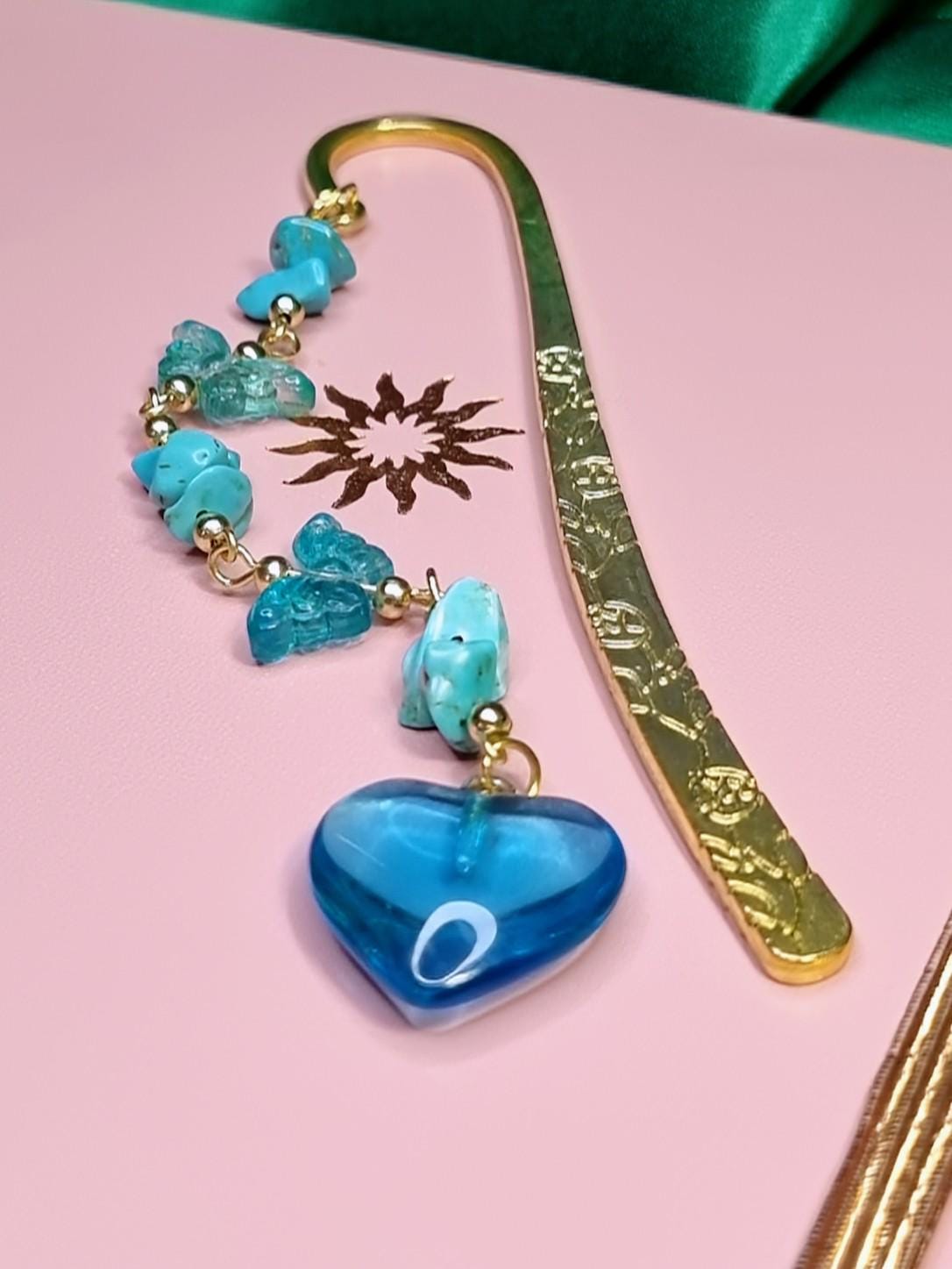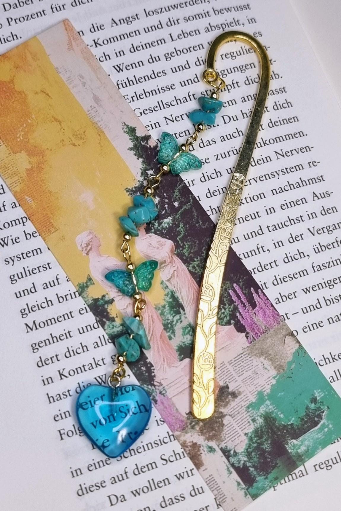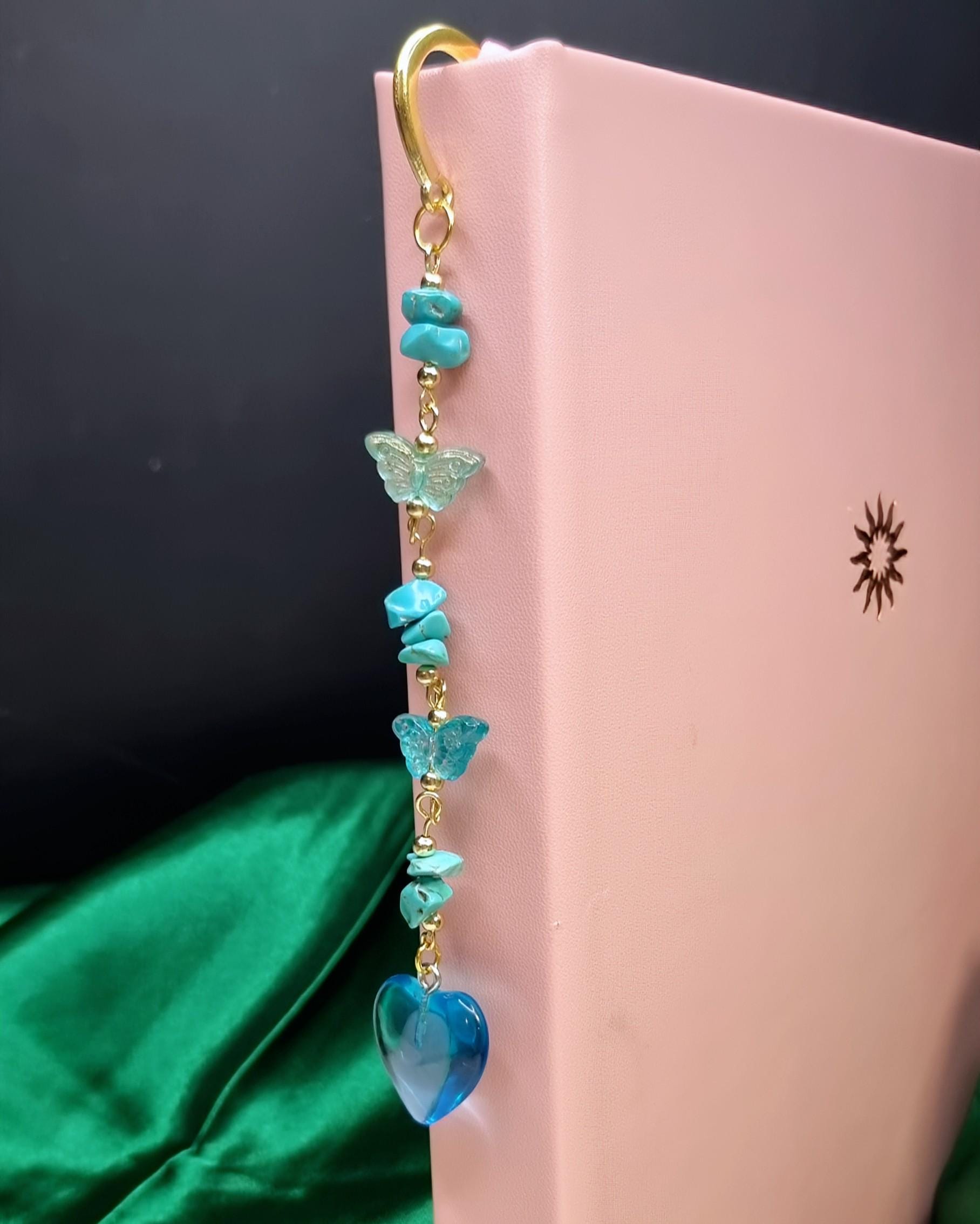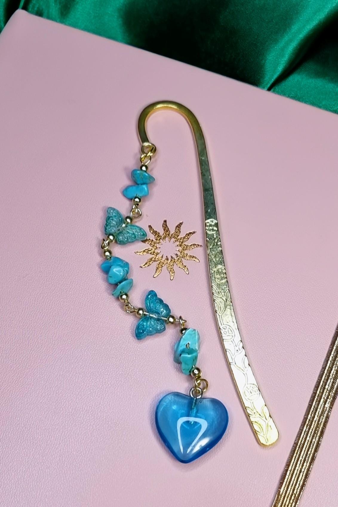 Lesezeichen aus Metall mit blauen Steinsplittern, Glas-Herz & Glas-Schmetterlinge