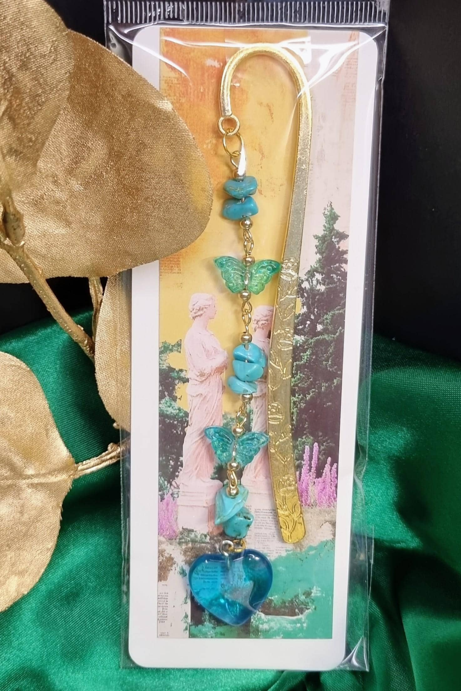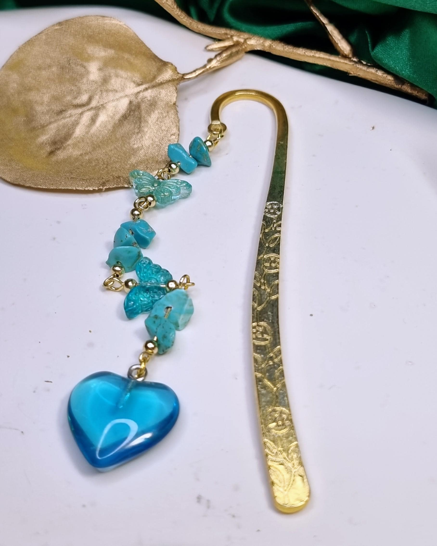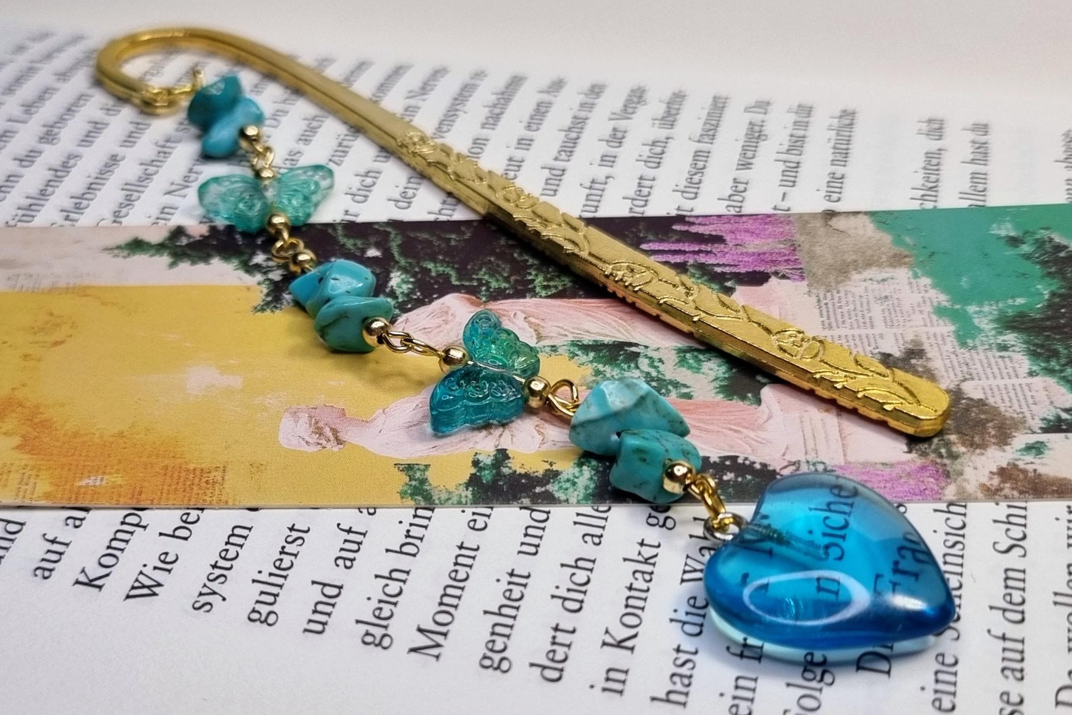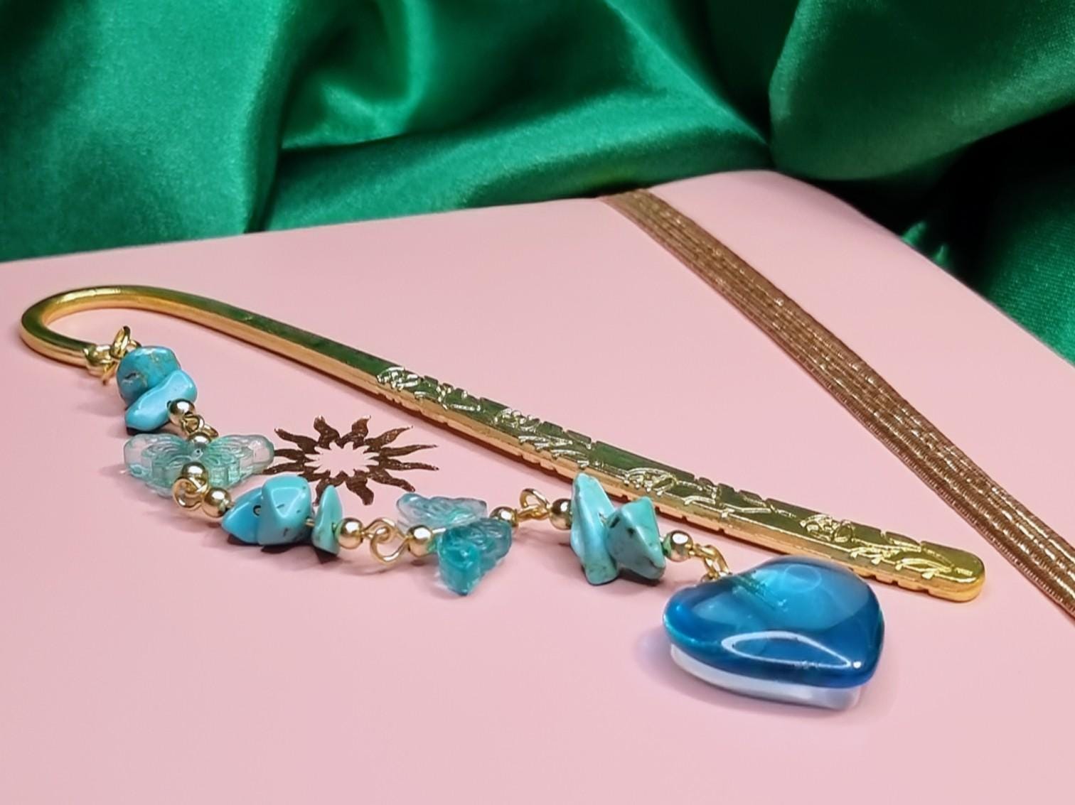 Lesezeichen aus Metall mit blauen Steinsplittern, Glas-Herz & Glas-Schmetterlinge