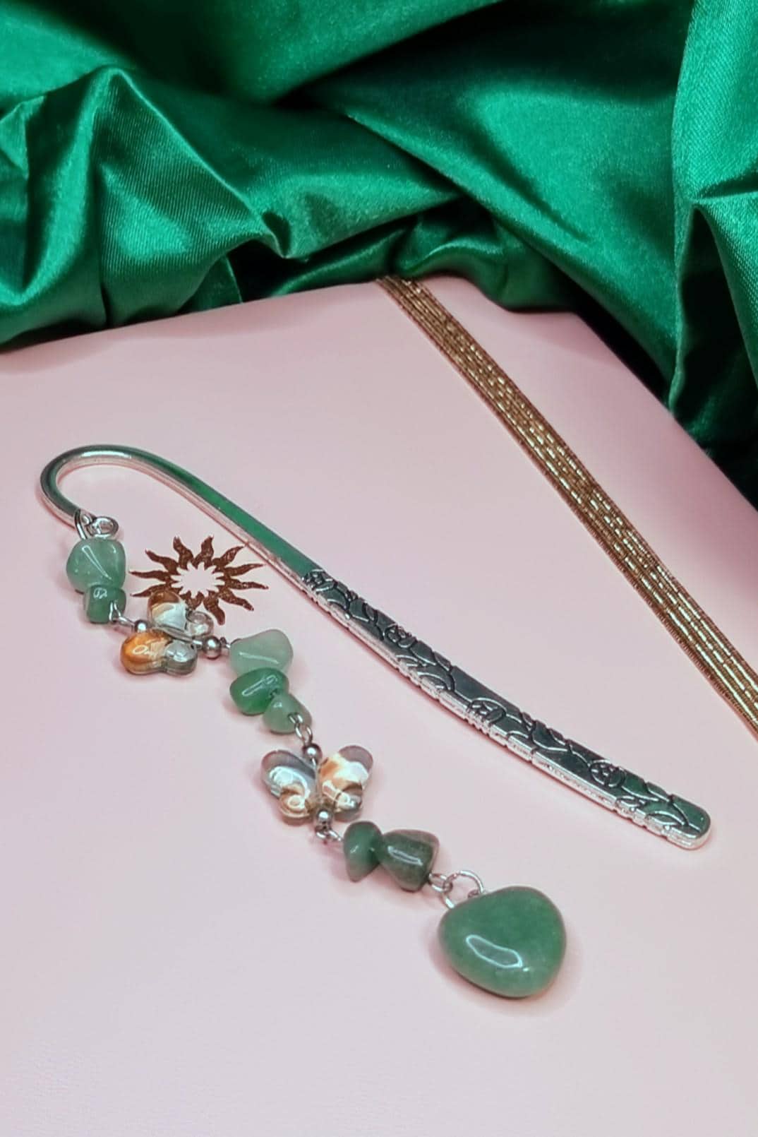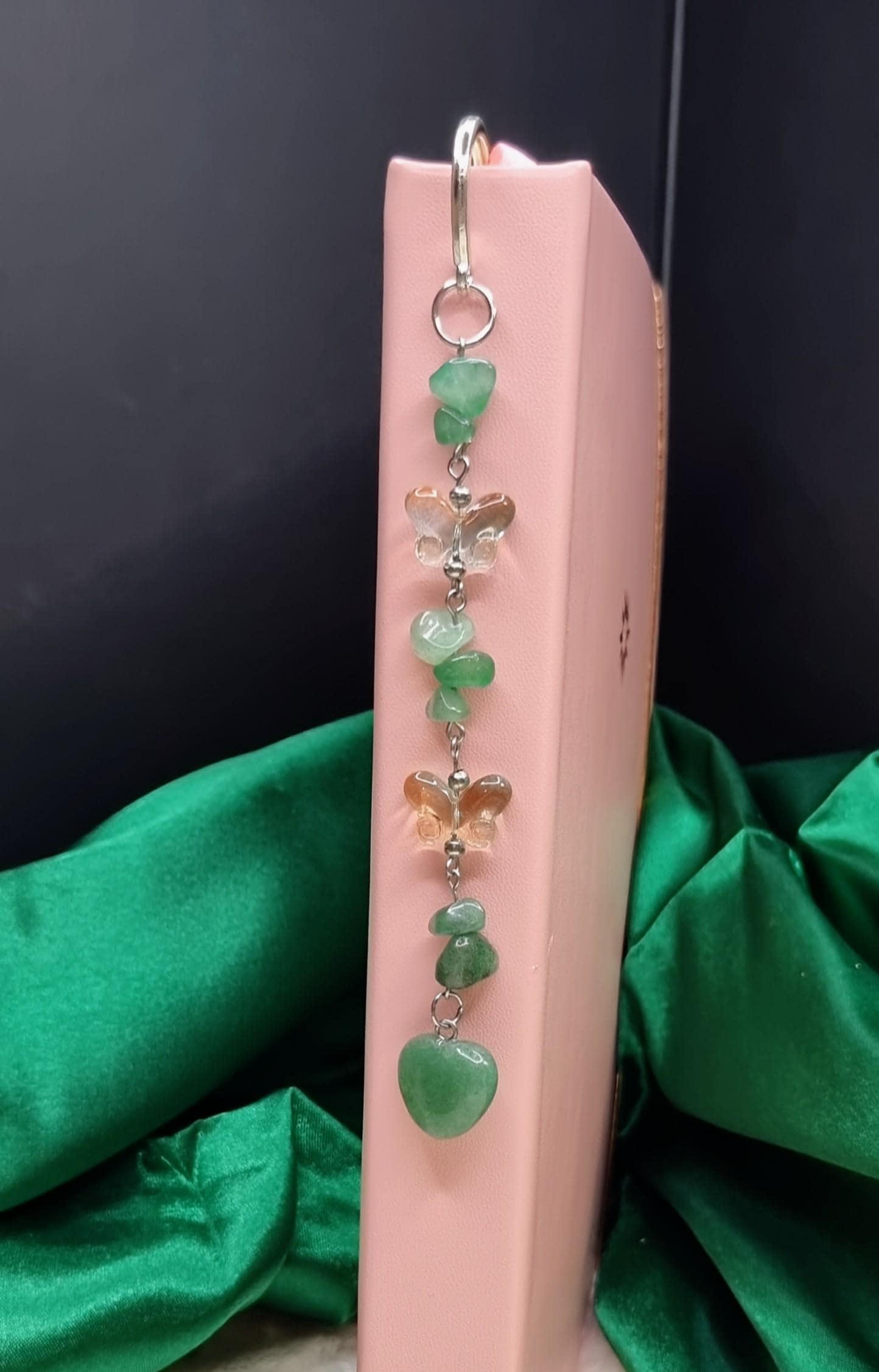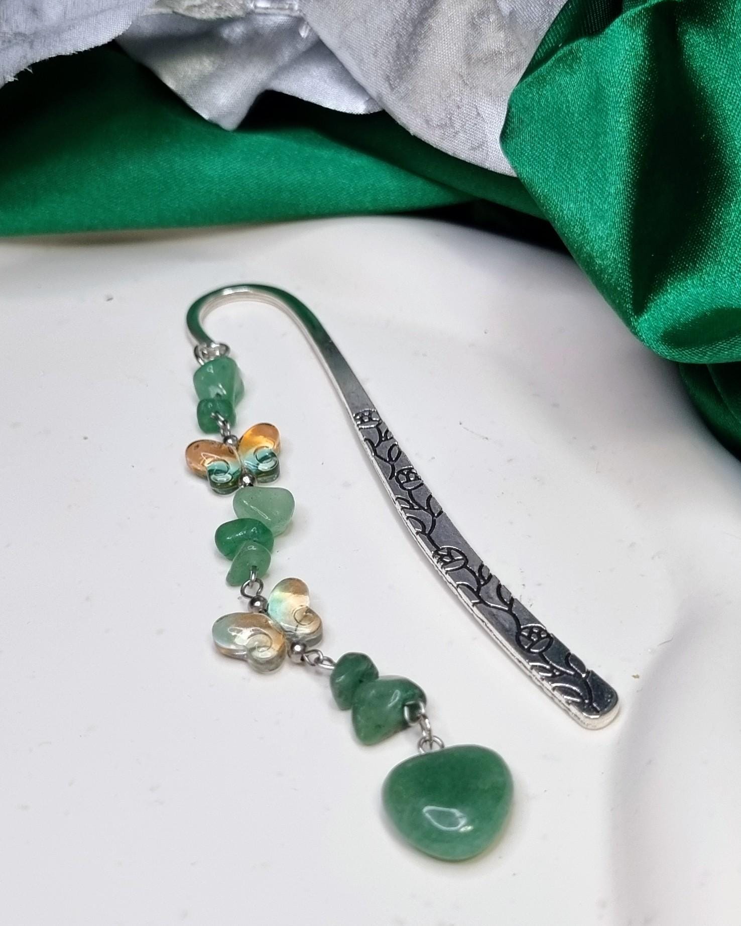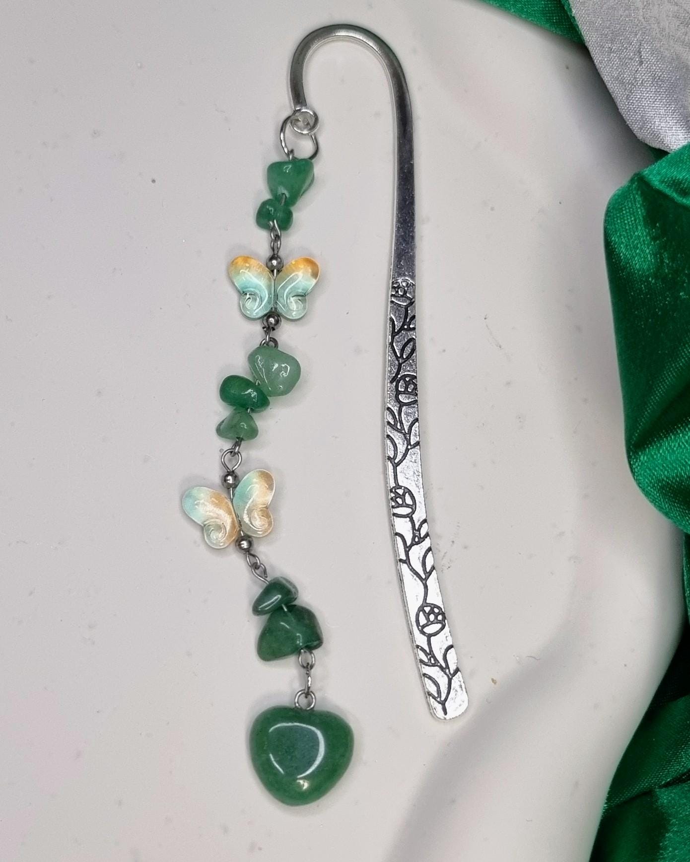 The piece incorporates green synthetic chips, delicate glass butterflies with a shimmering color gradient, and a green stone heart pendant. The headpins and spacer beads are made of stainless steel, ensuring stability and durability.