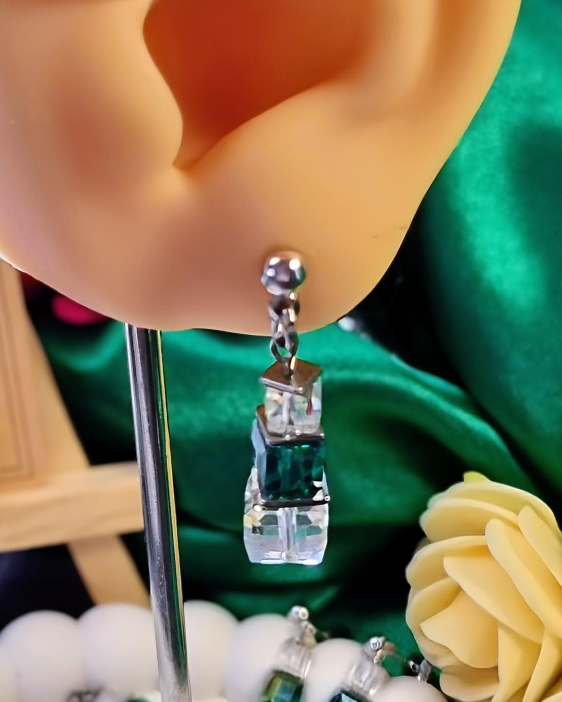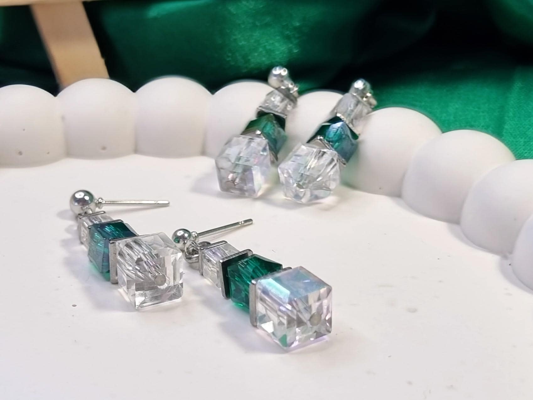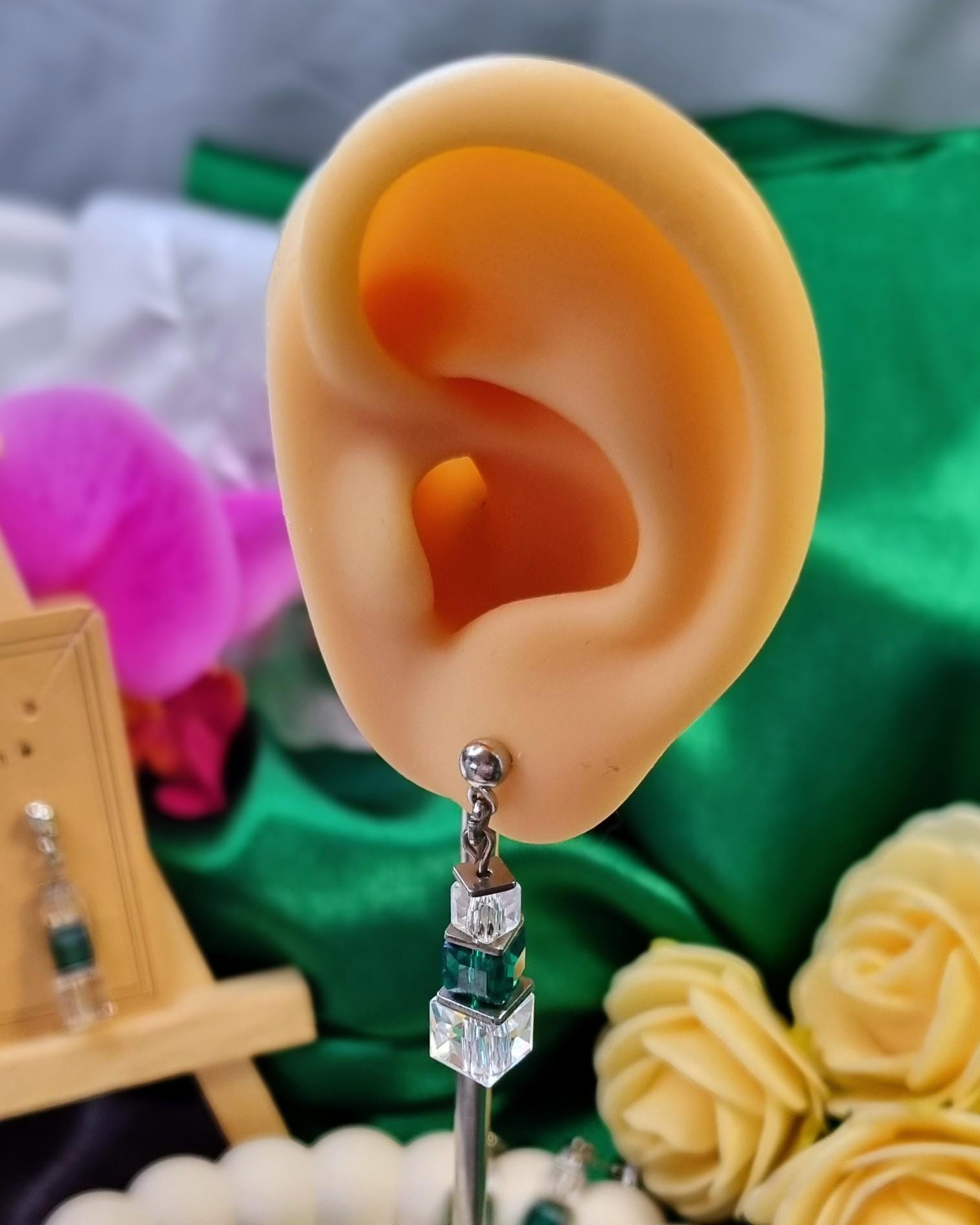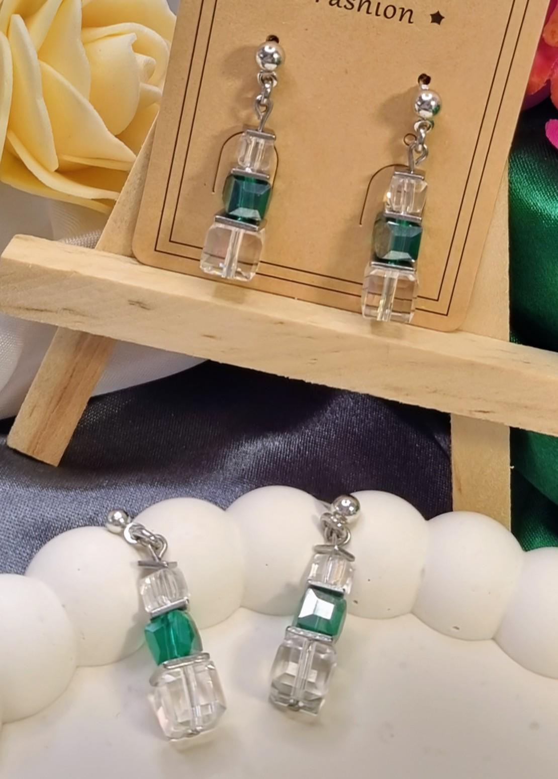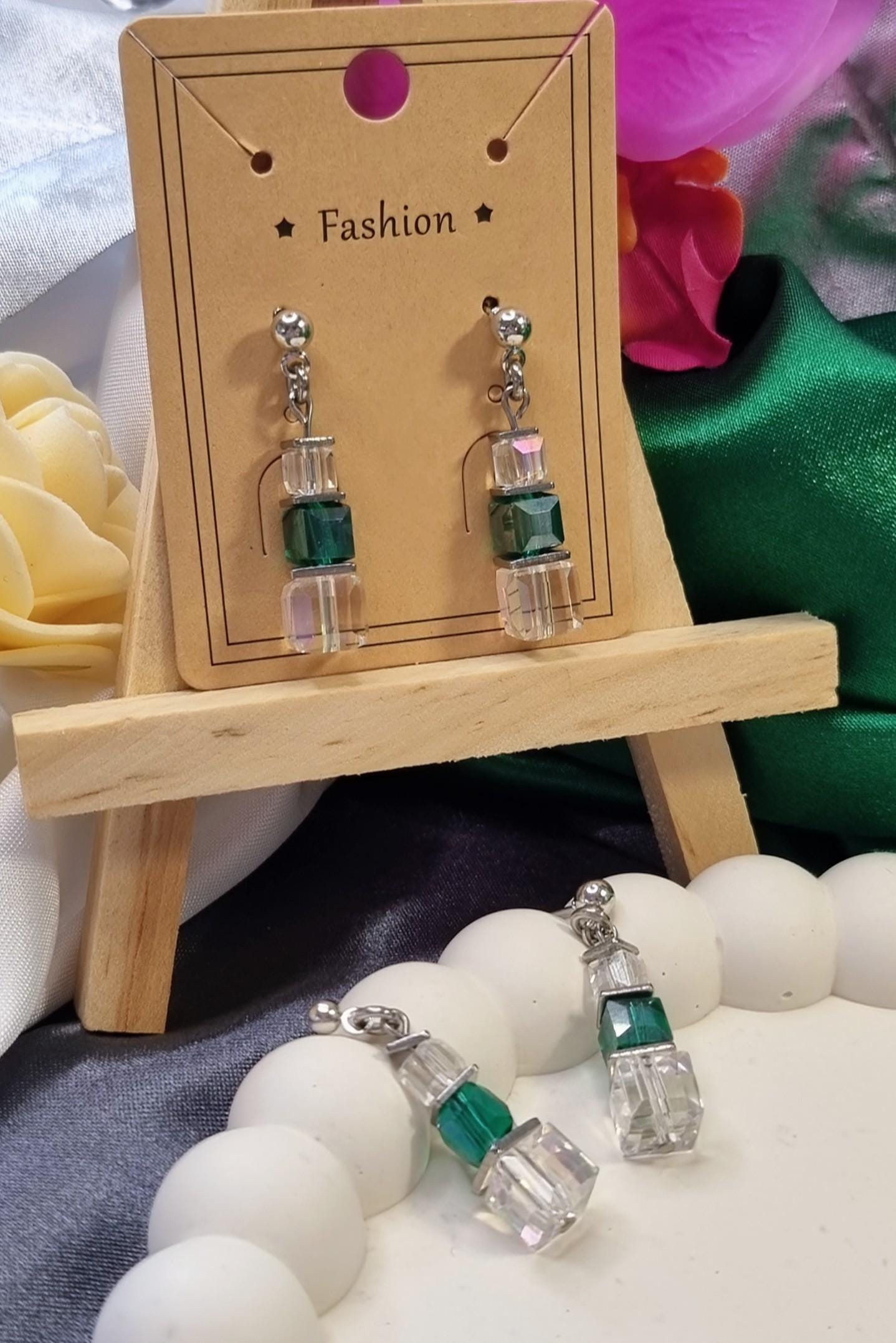 Modern stainless steel stud earrings with faceted glass cubes in a harmonious green and clear combination. The cubes are crafted in graduated sizes and separated by fine stainless steel plates, giving the design structure and depth.