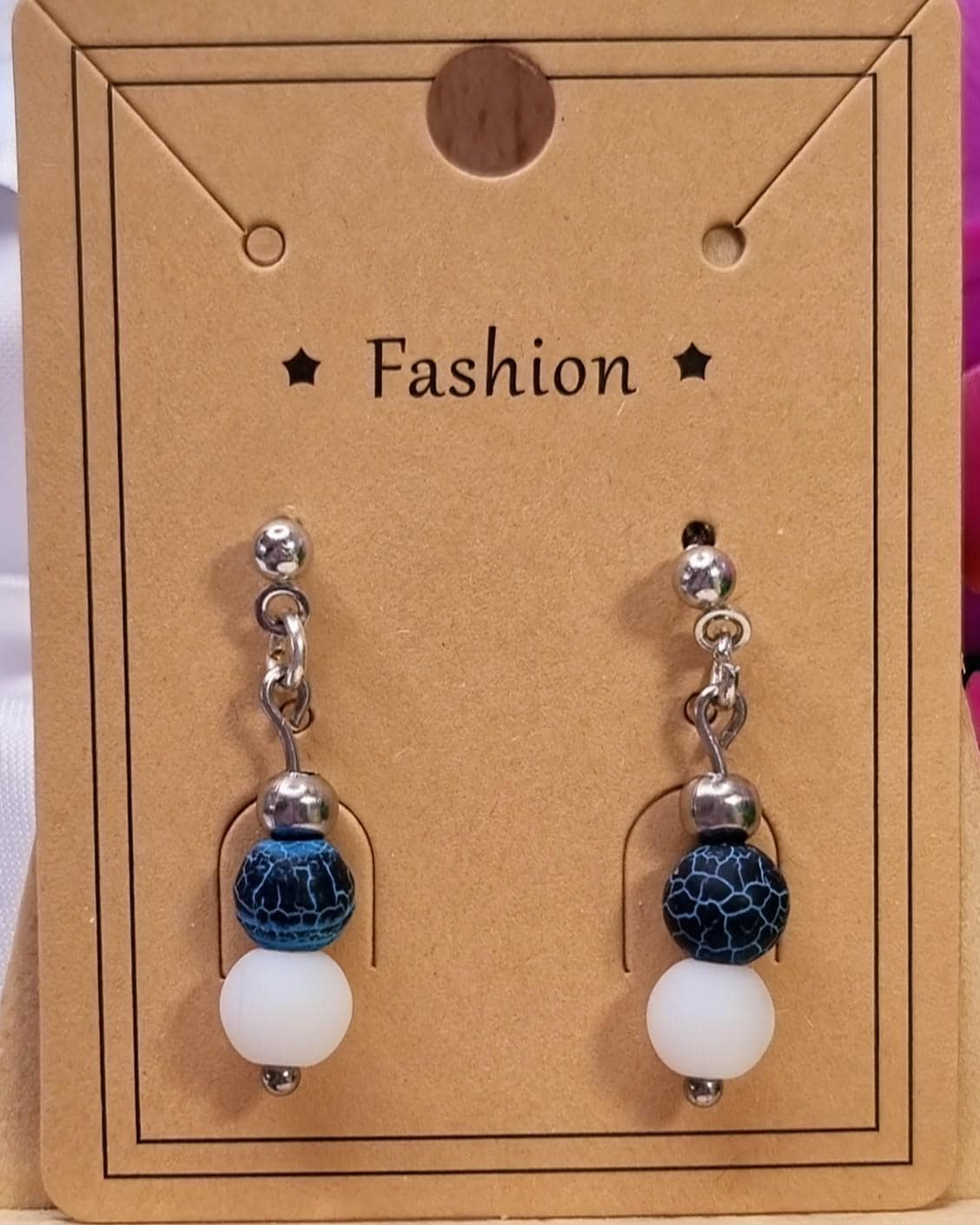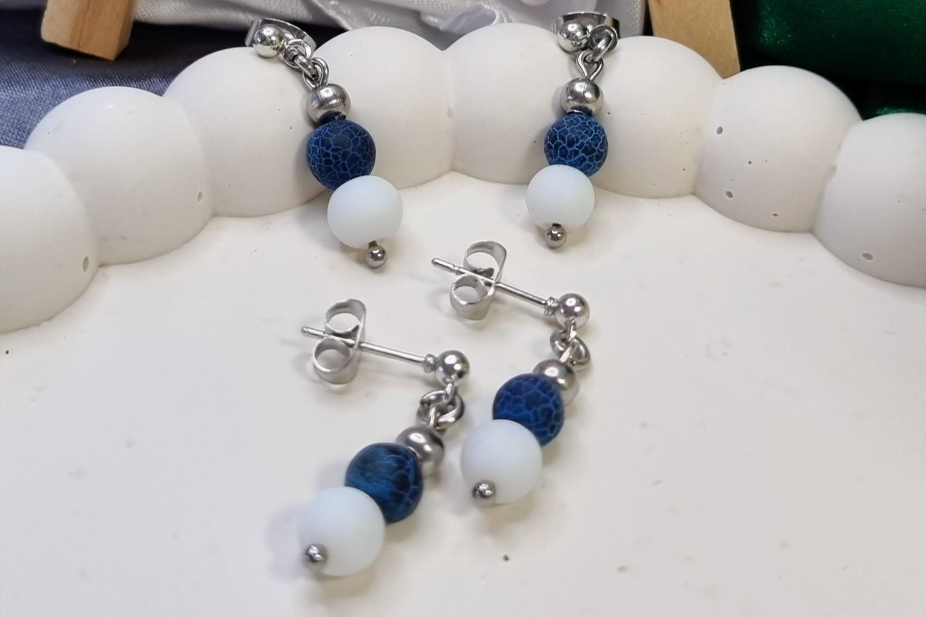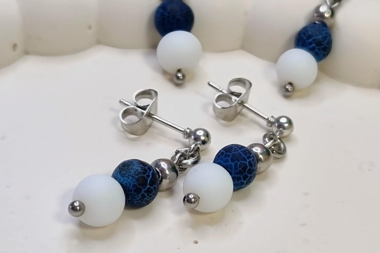The matte, cracked blue fire dragon agate is complemented by a smooth white stone bead and framed by polished stainless steel spheres. The design is clean, calm, and suitable for everyday wear – perfect for minimalist looks or as a subtle splash of color.