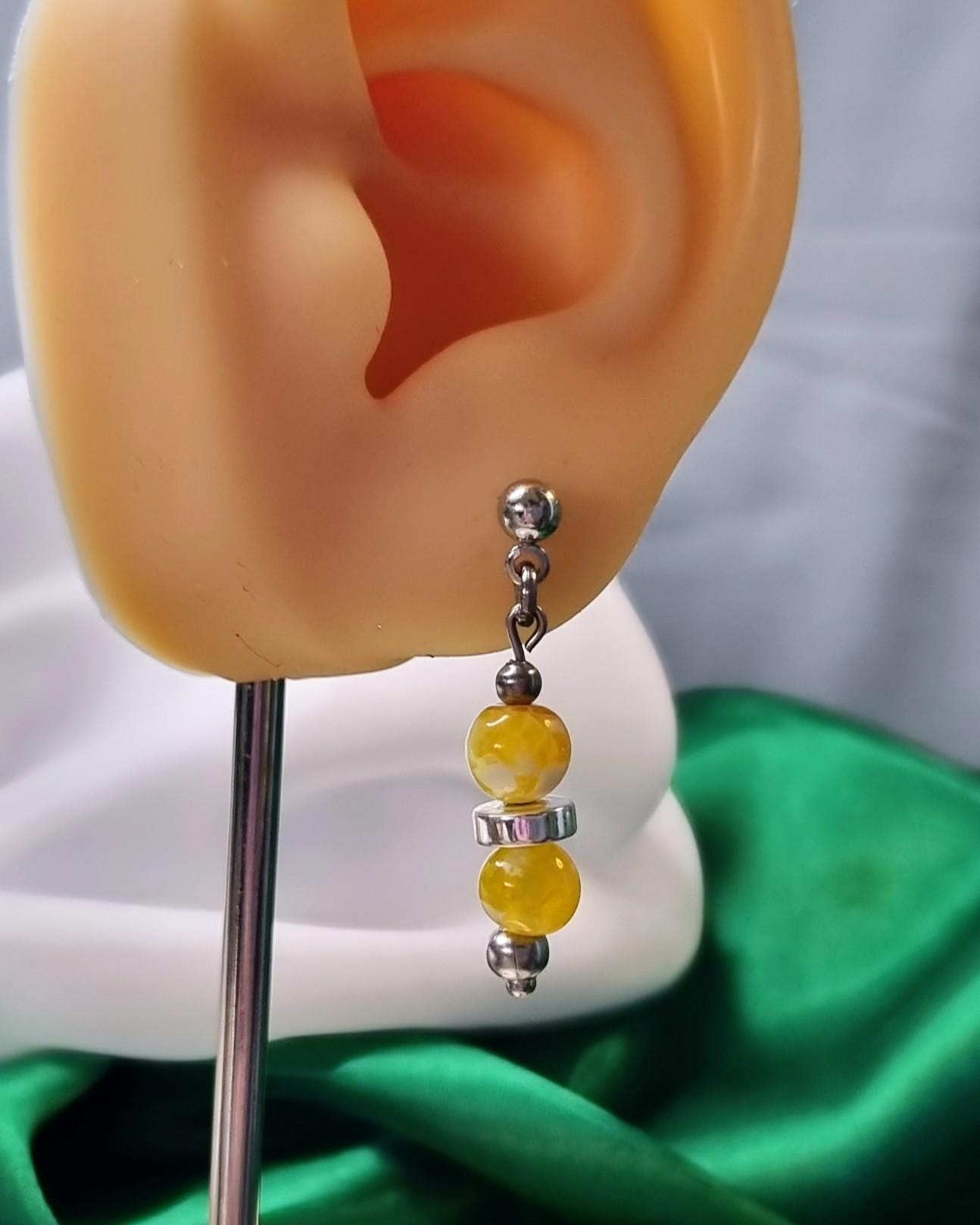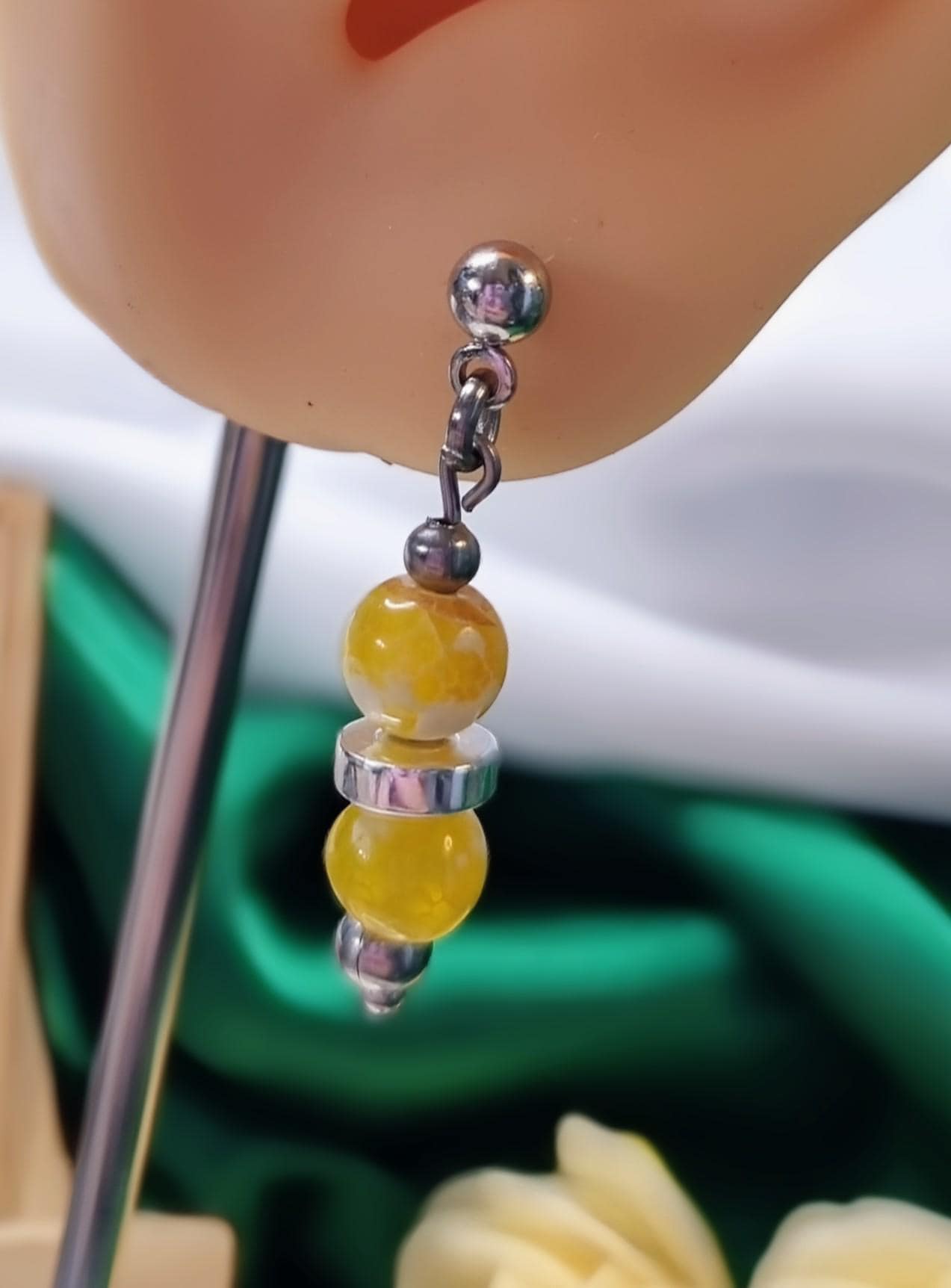 These handcrafted stainless steel earrings feature warm yellow tones and clear contrasts.