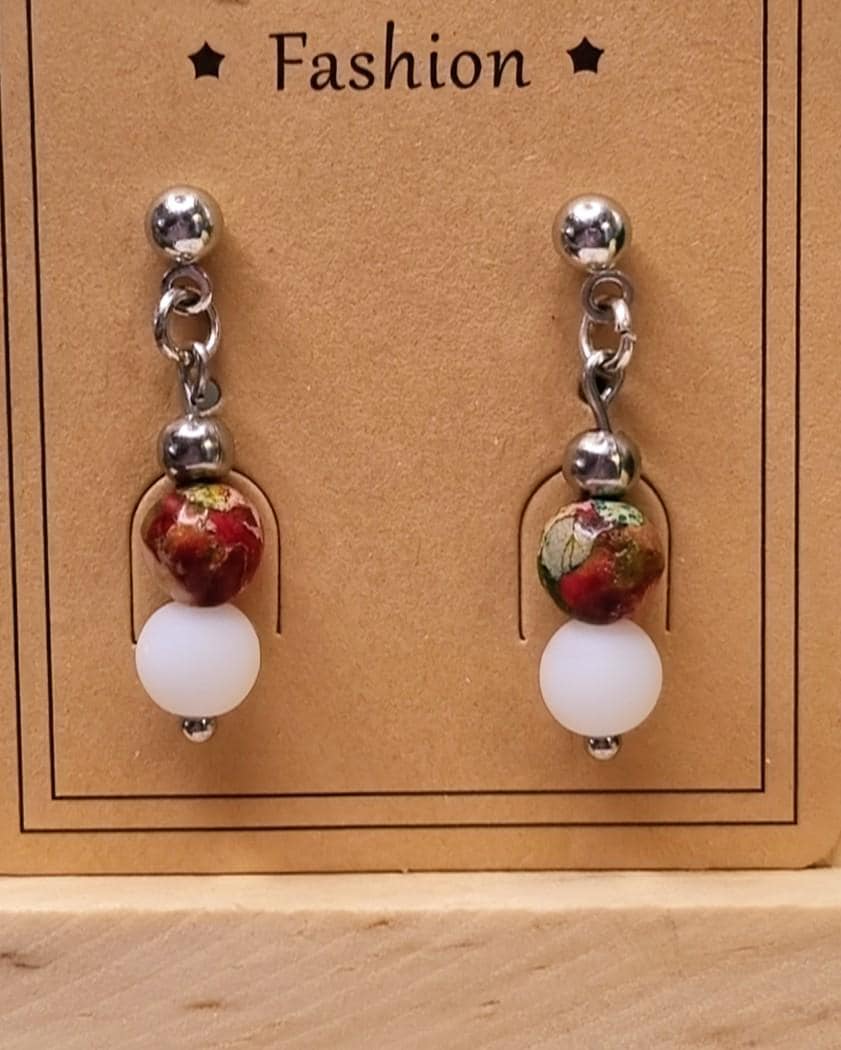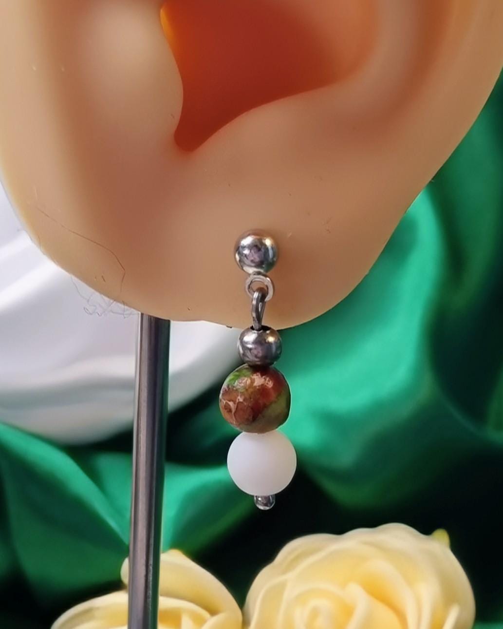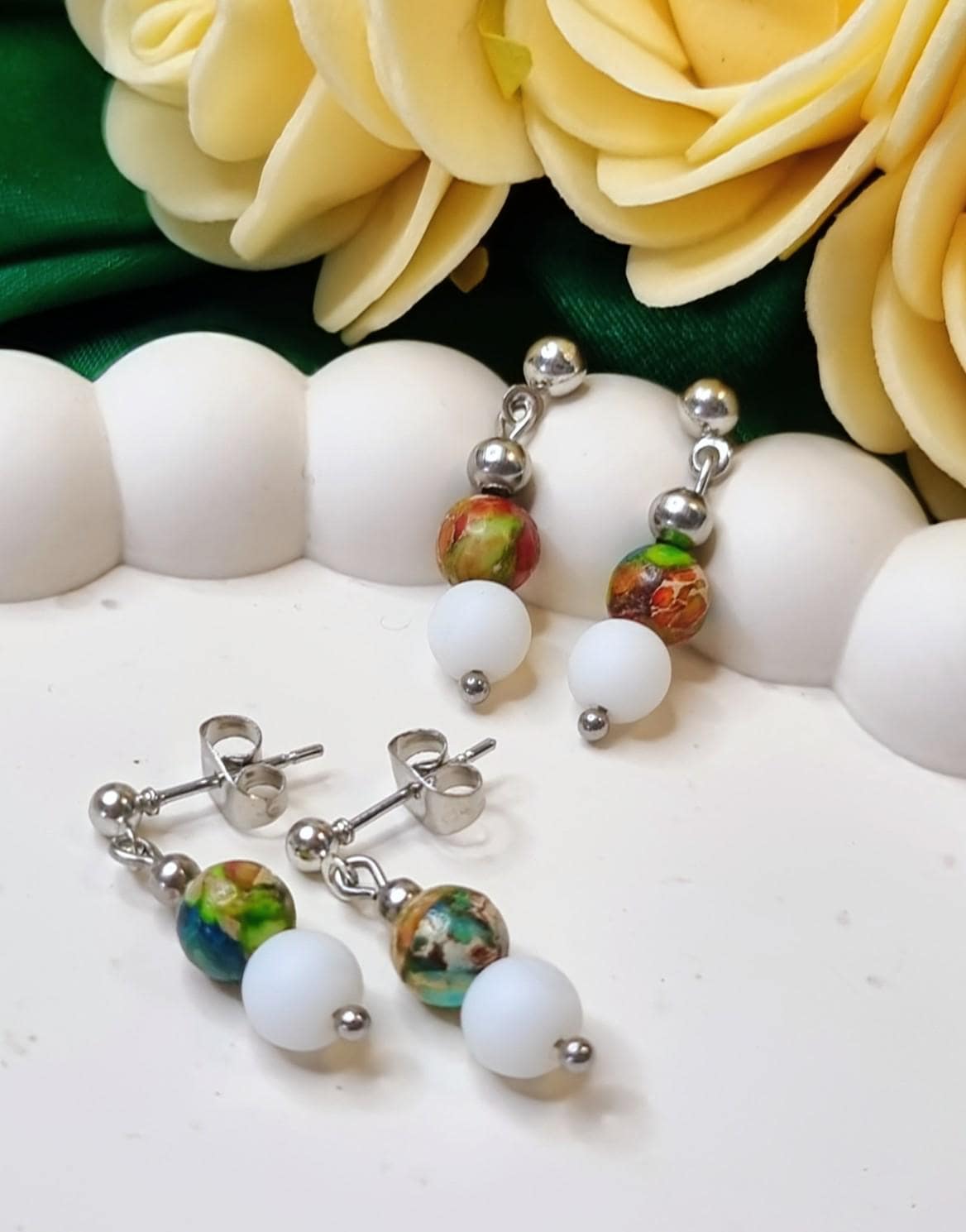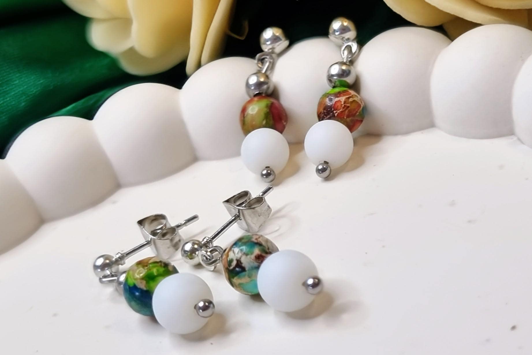 Delicate, handcrafted stainless steel stud earrings with a harmonious combination of colorful marine sediment turquoise and white natural stone.